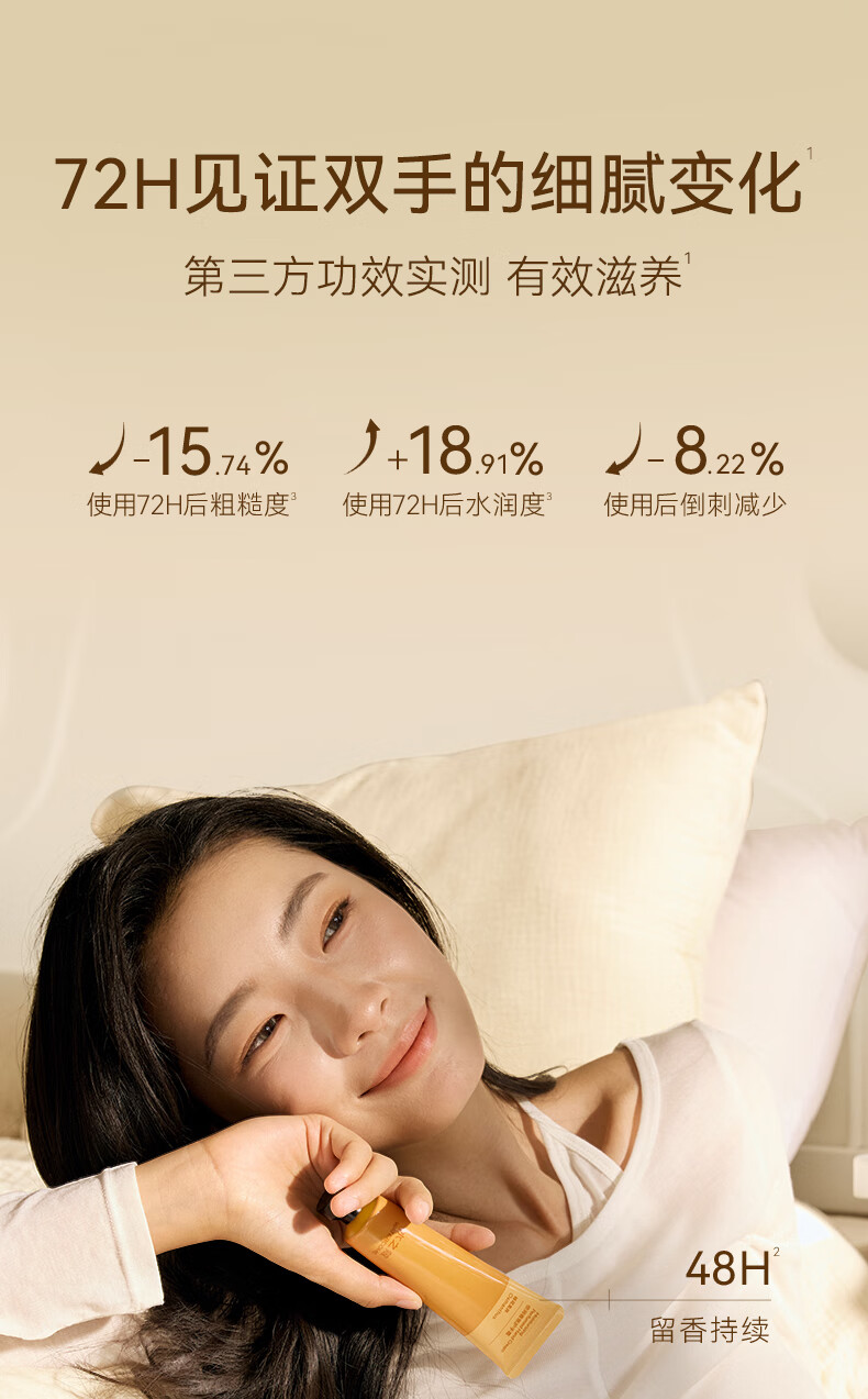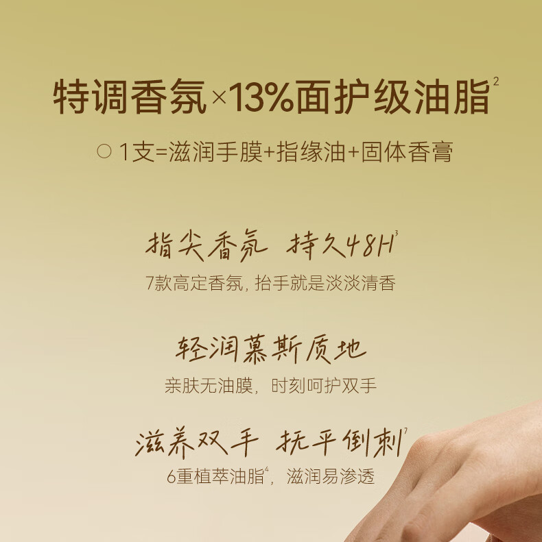 1支多效 手甲同养 随「手」穿香 感知指尖的柔润;将柔润和香味都揉进手心 轻松化解手部干燥「危肌」;特调香氛×13%面护级油脂 •1支=滋润手膜+指缘;选个喜欢的味道留香持续48H;手,是身体接触外界的载体更干燥易损,手部护理不容忽