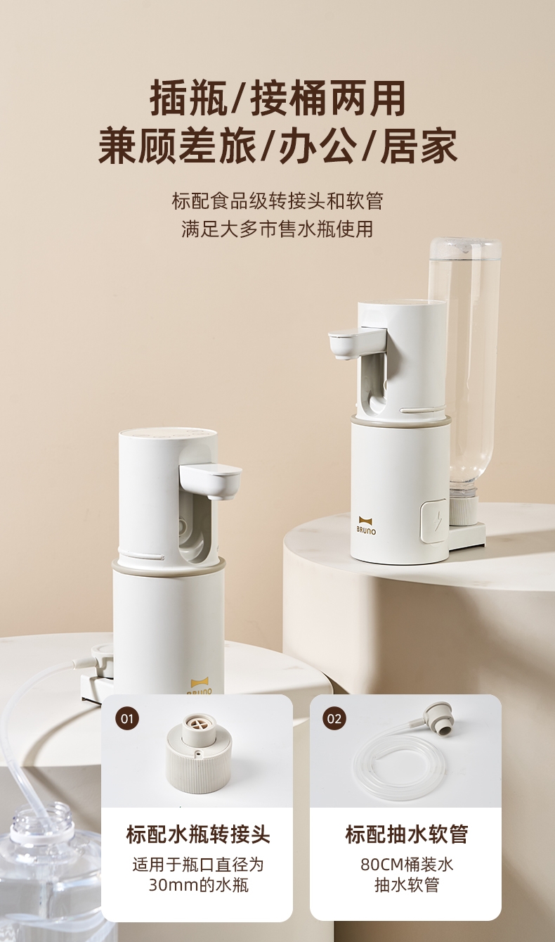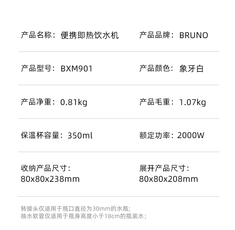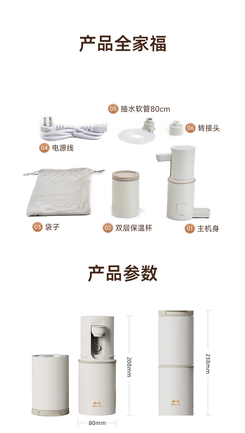 配置清单:电源线*1、抽水软管*1、转接头*1、袋子*1、主机*1、双层保温杯*1