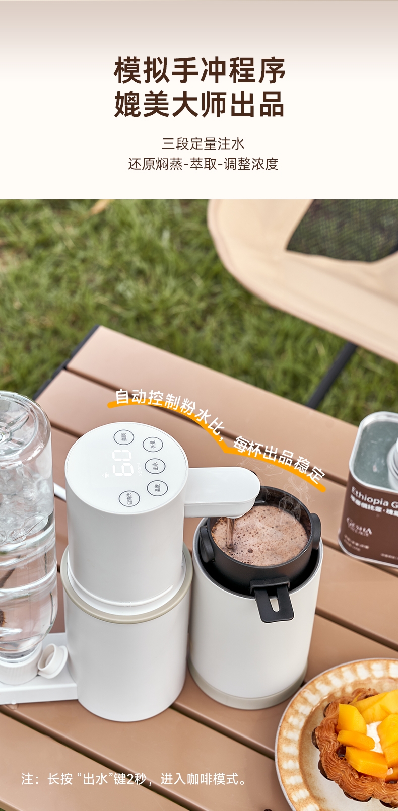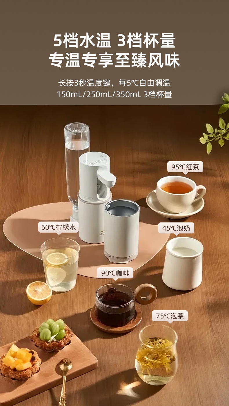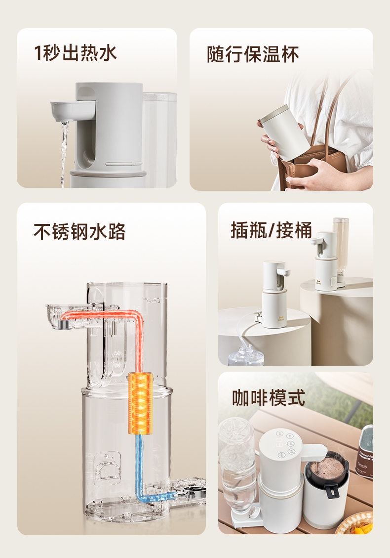 进、出水口均为304不锈钢材质 ,安全性高、更卫生;预设4档水温,3档水量,3秒即热,适温畅饮;全场景适配:覆盖差旅、户外、家庭办公,一机多用