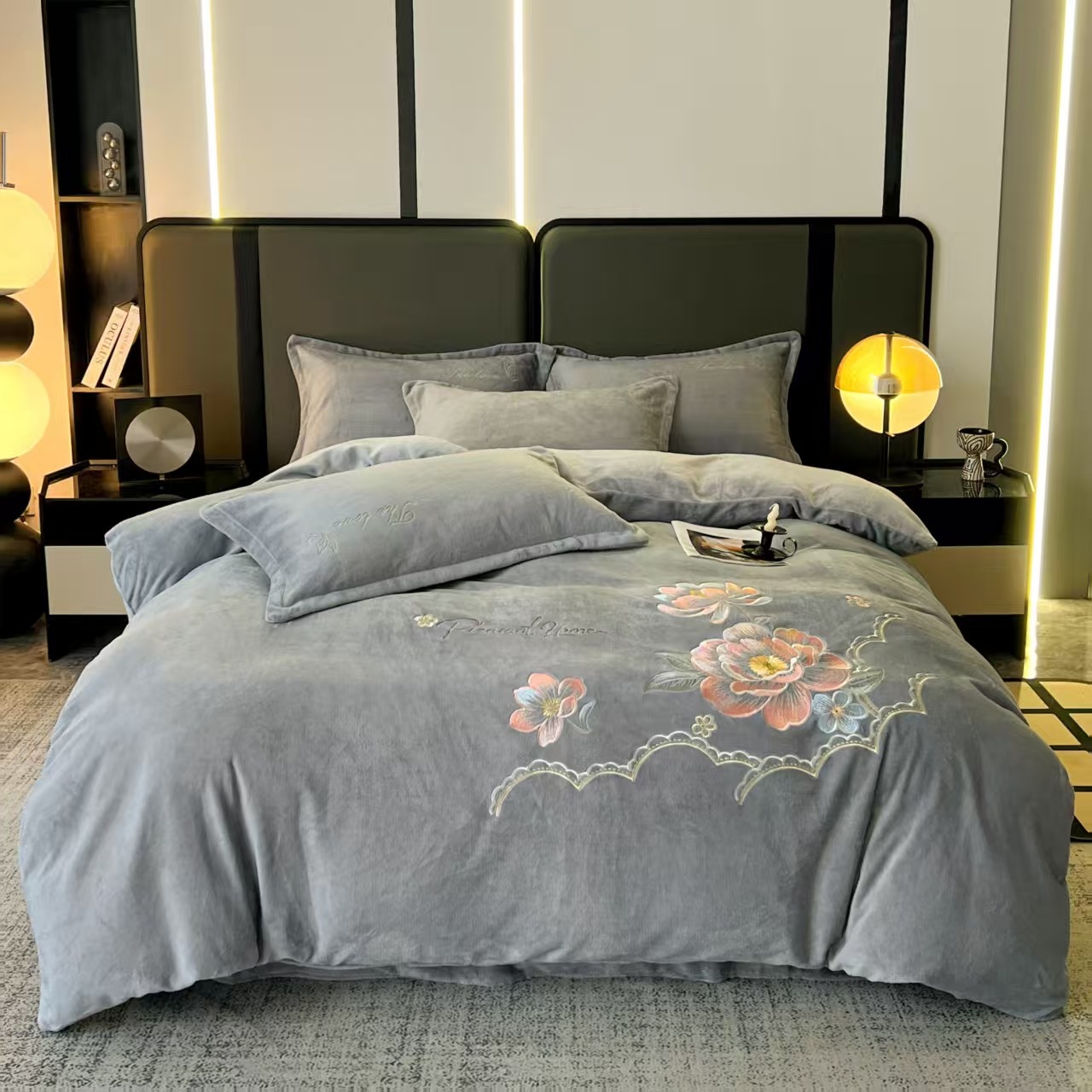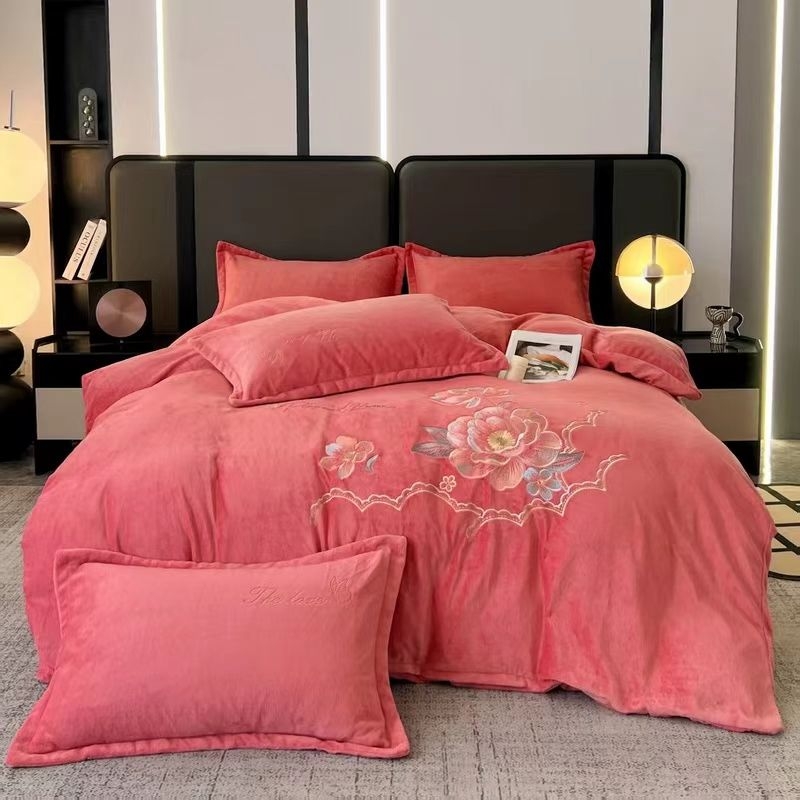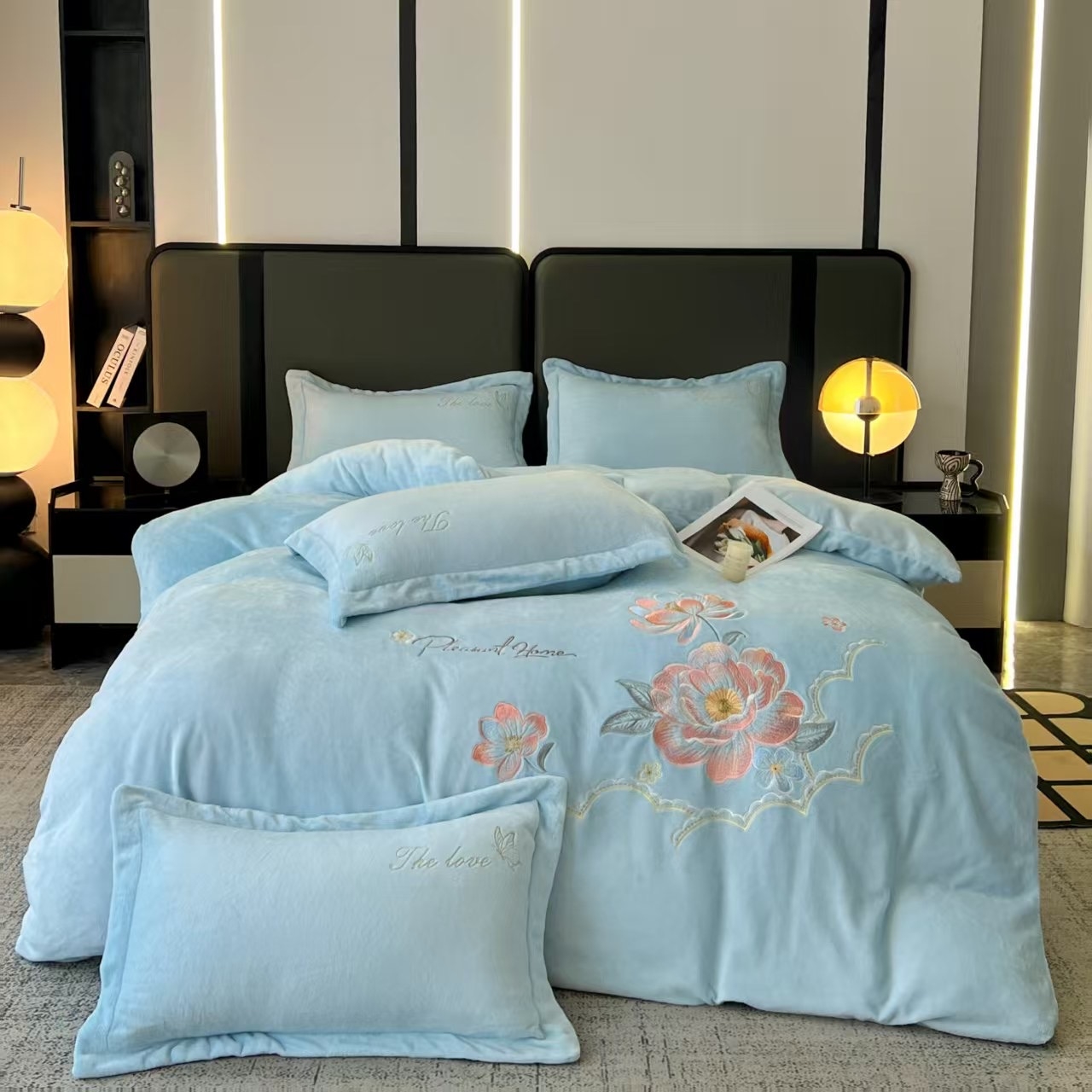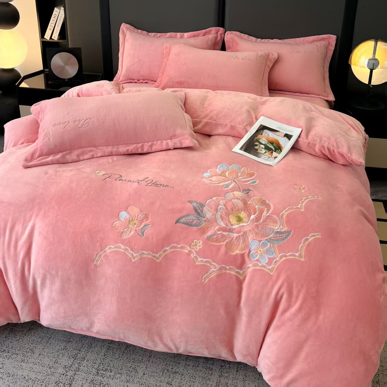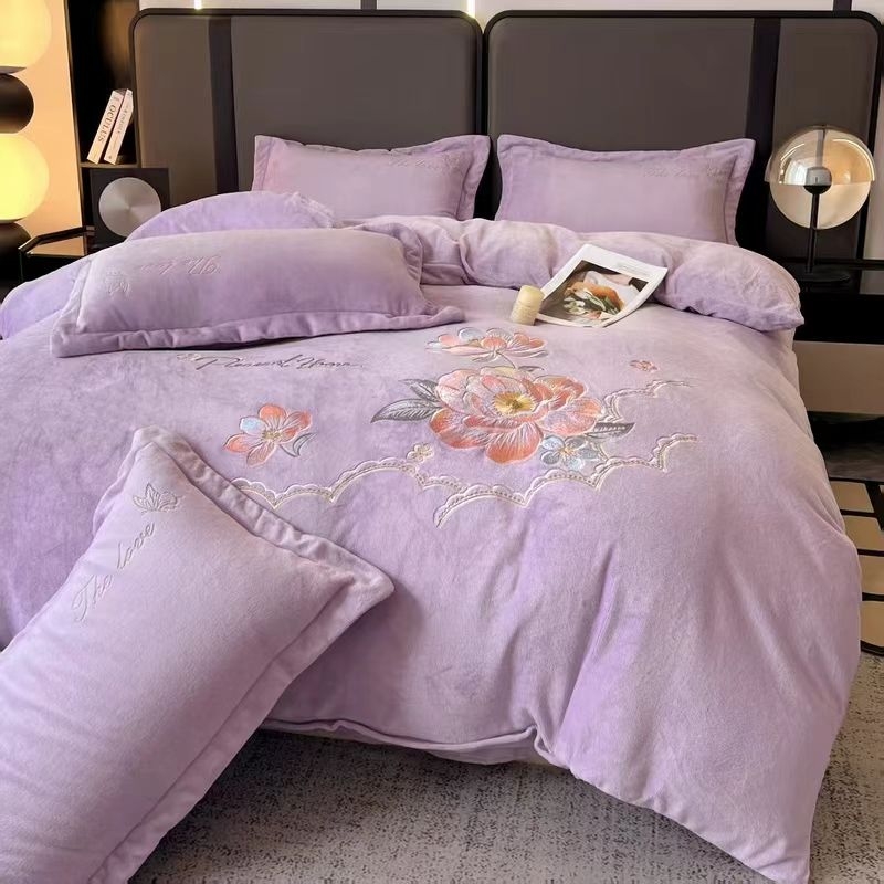 柔暖氛围邂逅慵懒时 牛奶绒绣花四件套;高克重牛奶绒面料 丰满细腻的绒毛给肌肤;牛奶绒细密紧实,锁温蓄热能力好一个人也可以暖暖的
