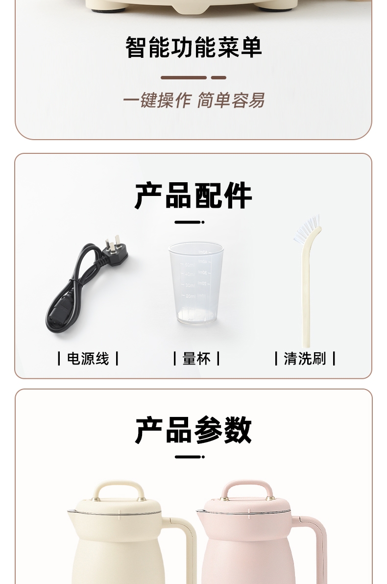 配置清单:主机*1 电源线*1 量杯*1 清洗刷*1 说明书*1