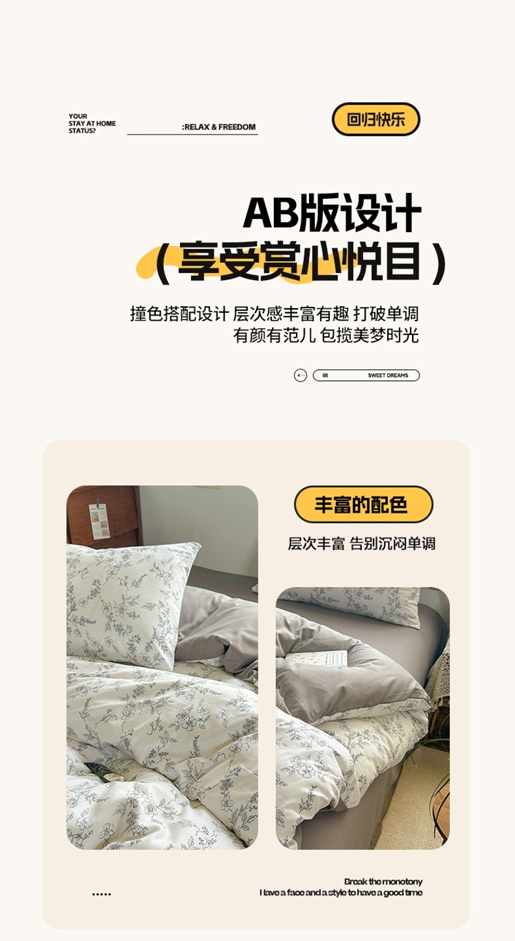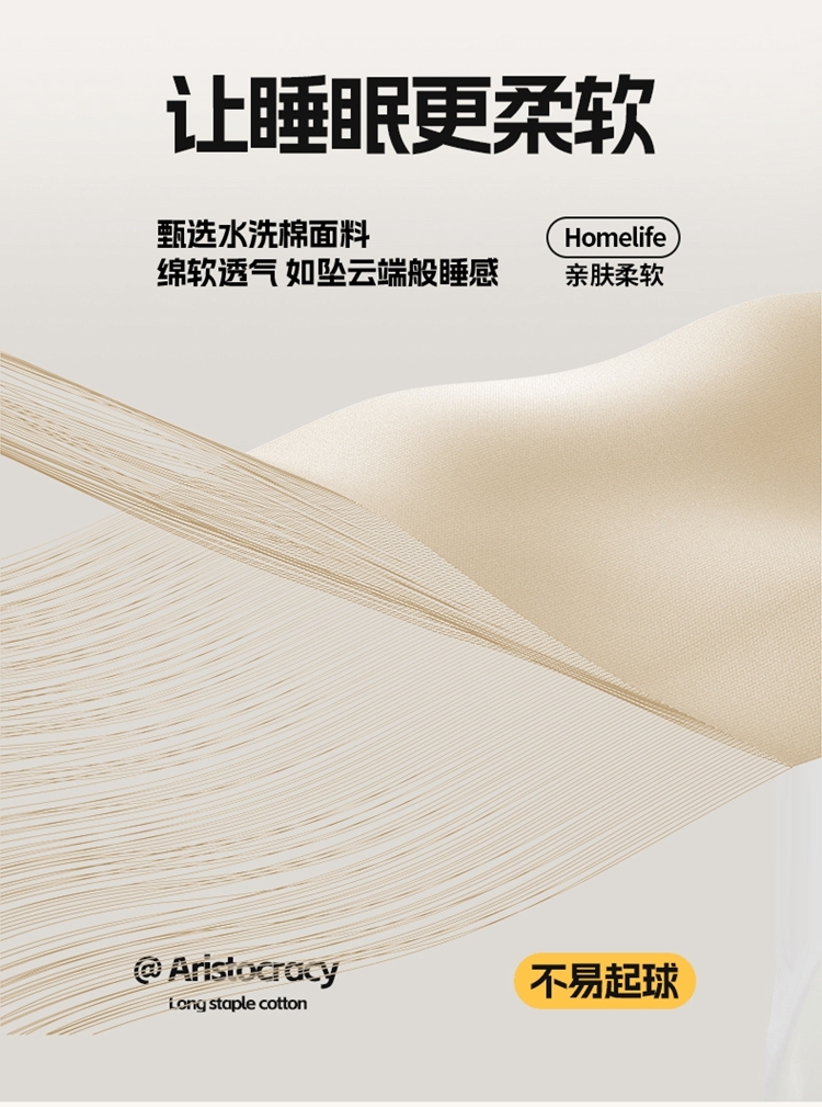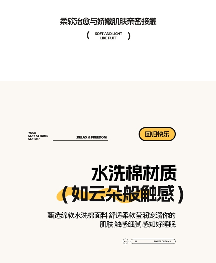 甄选绵软水洗棉面料 舒适柔软莹润宠溺你的肌肤 触感;让睡眠更柔软绵软透气 如坠云端般睡感;撞色搭配设计 层次感丰富有趣 打破单调有颜有范儿