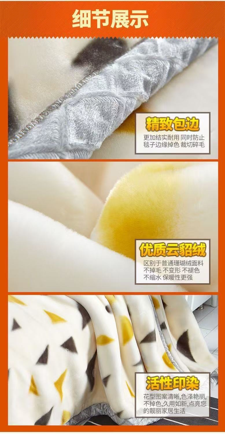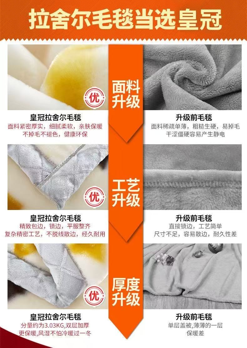 拉舍尔面料锁温蓄热更保暖 密度更高;甄选拉舍尔面料,绒毛柔暖舒适比普通绒;面料更厚实,更保暖绒毛密度更强,升温更迅速