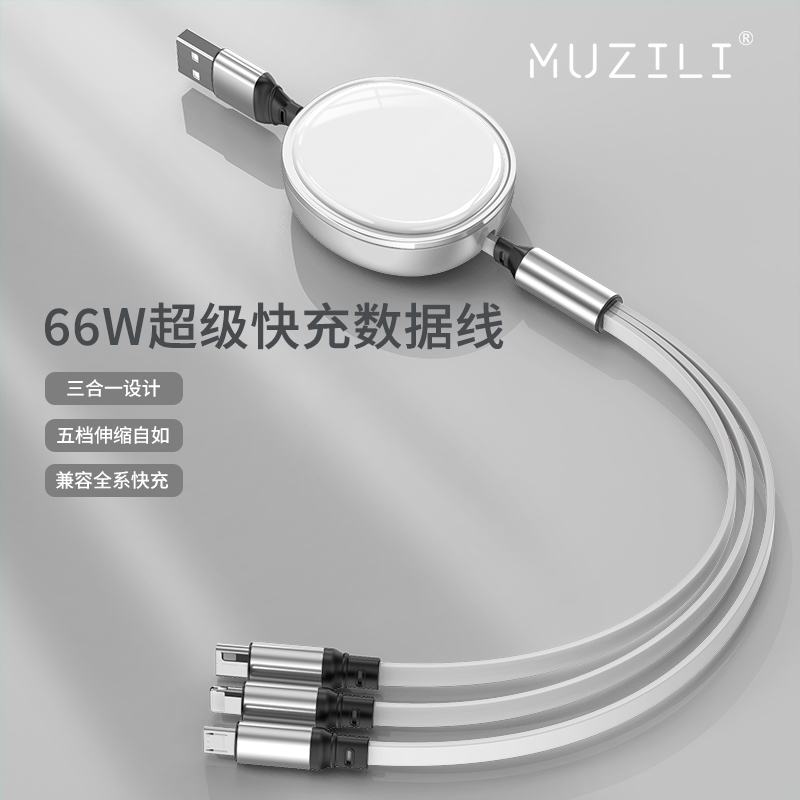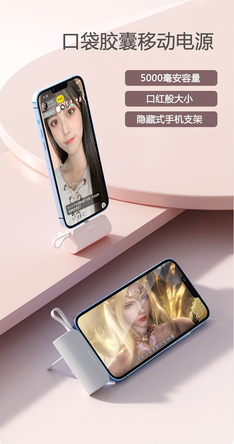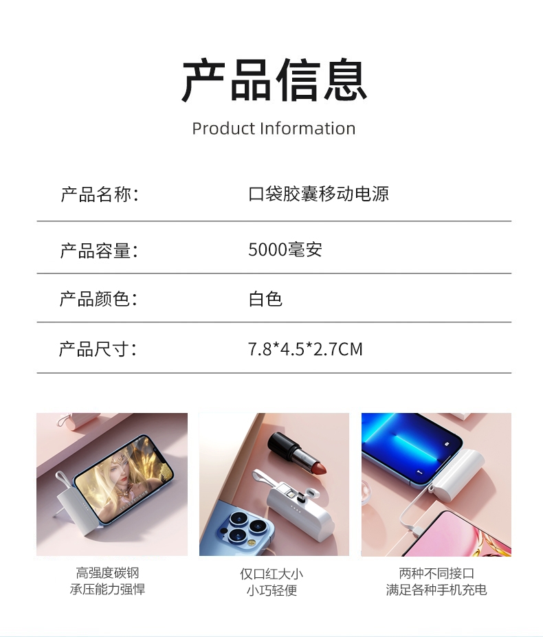 5000毫安口袋胶囊自带线电源 ;苹果直插接口,华为小米自带线 口红般大小精致可爱;66W超级快充一拖三伸缩数据线 兼容苹果15系列 ;五档伸缩调节 1.2米长度设计 TPE材质经久耐用;三种充电接口满足各种手机