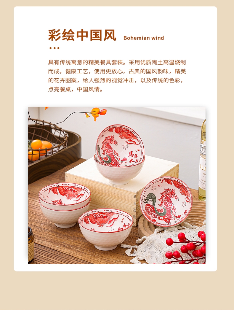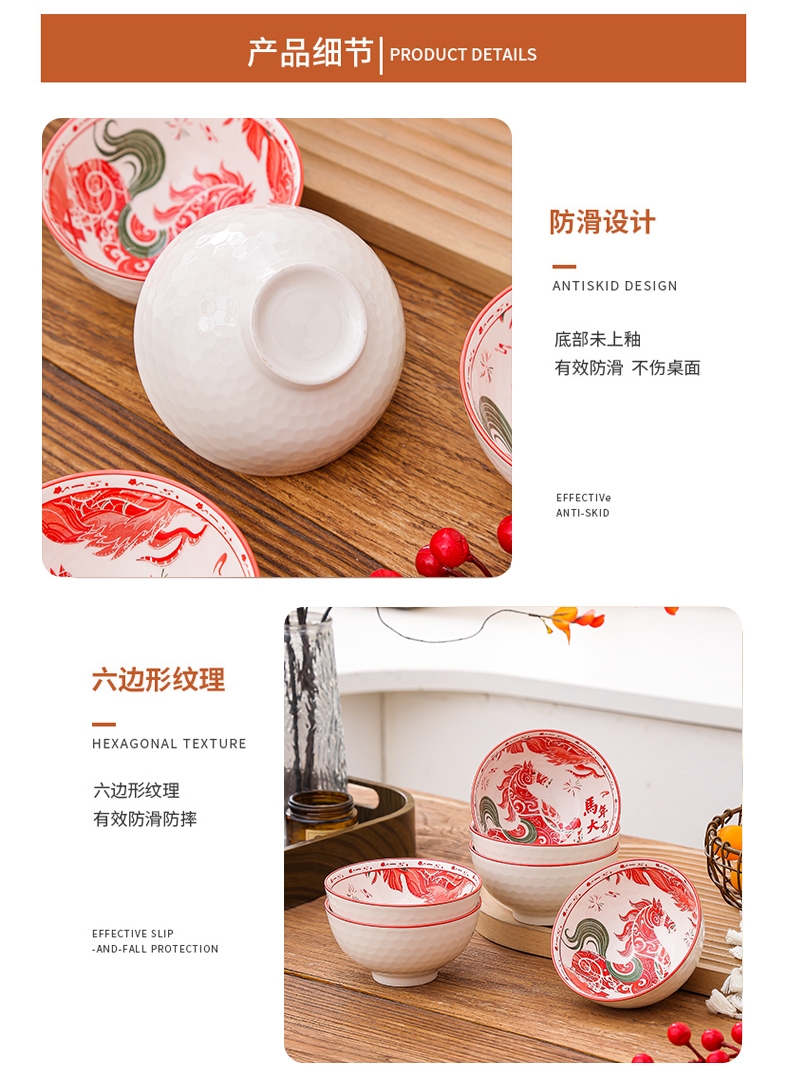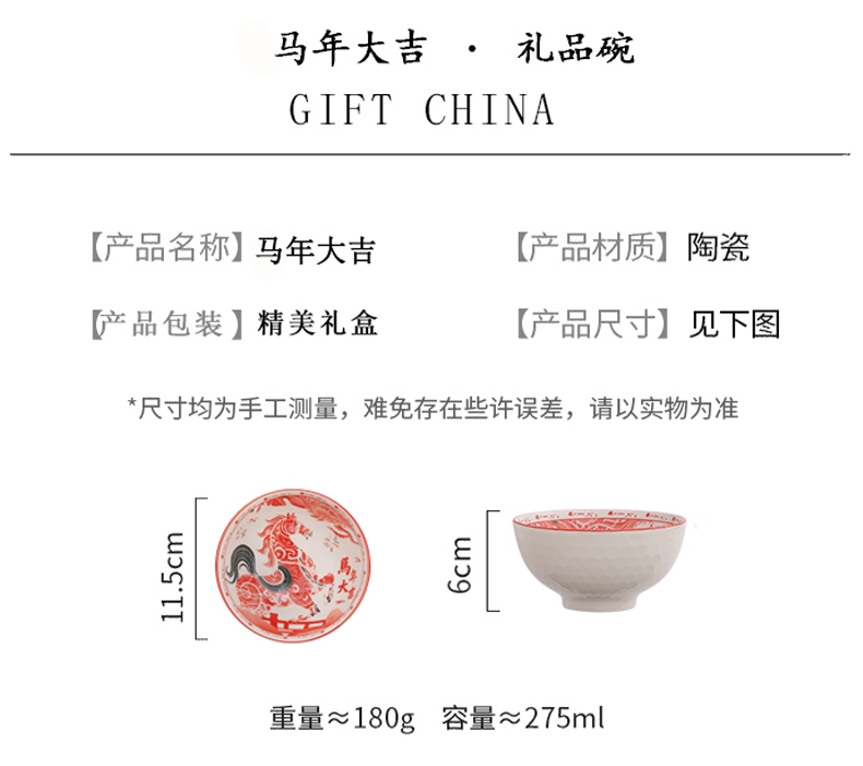 釉下彩绘工艺,瓷质细腻;革新式的网球碗身,可有效防止手滑;包装盒彩用喜庆中国国风风格,经典传统,便携手提