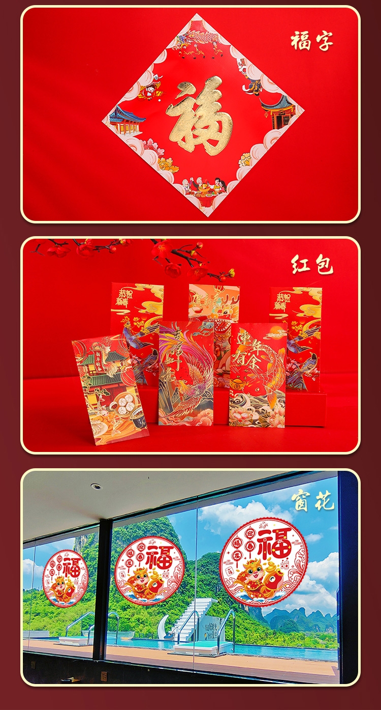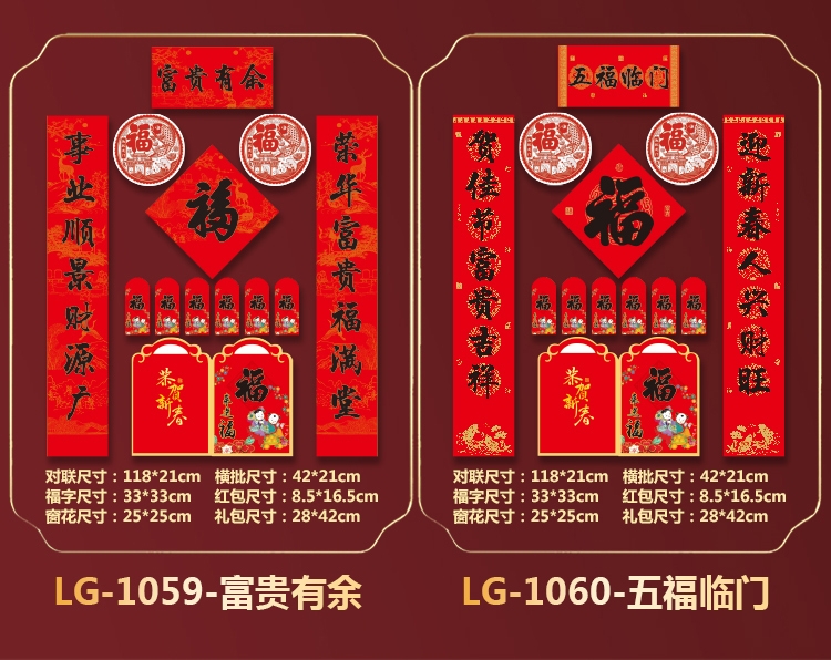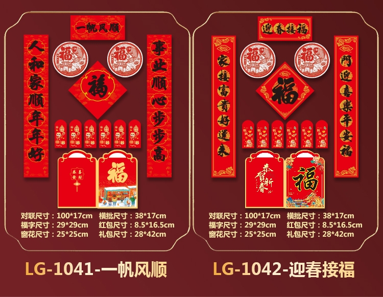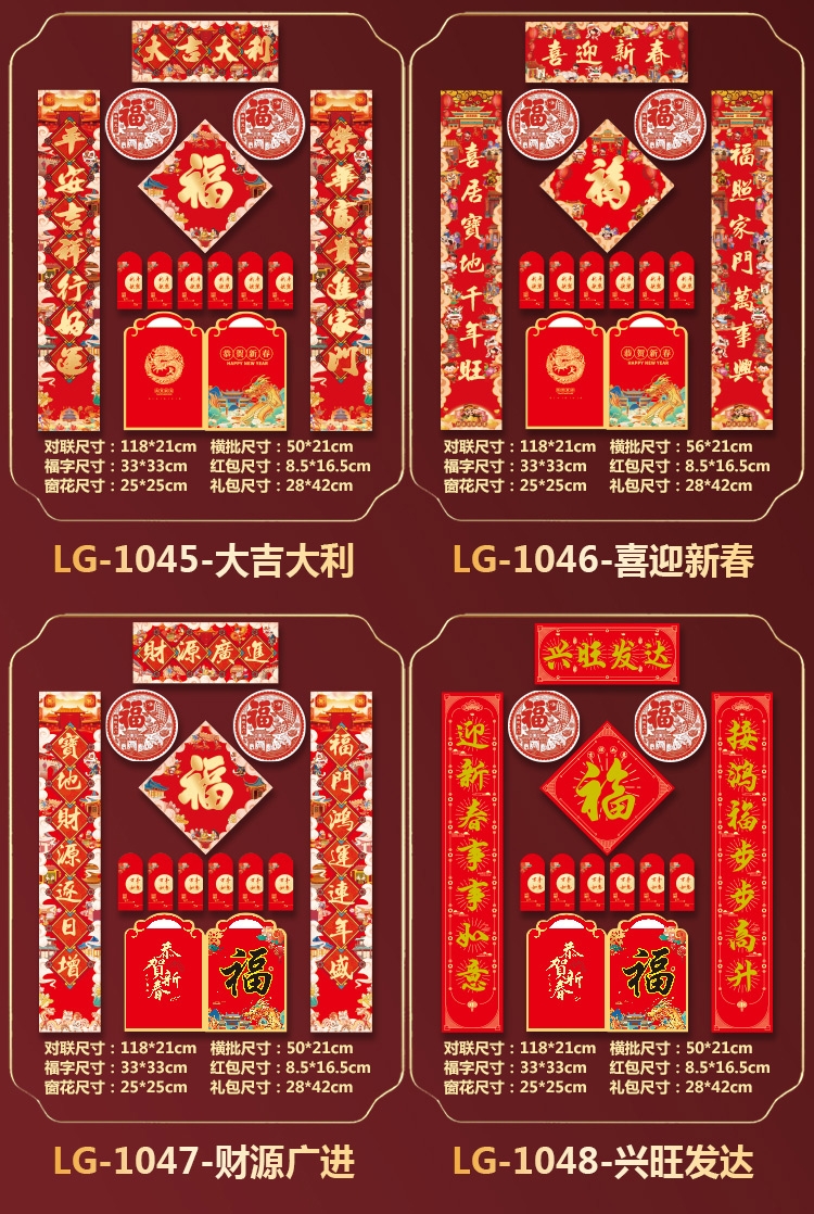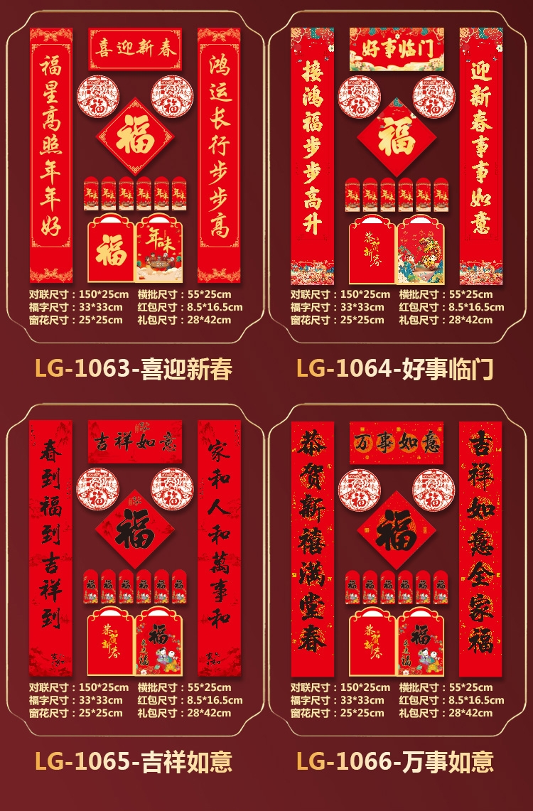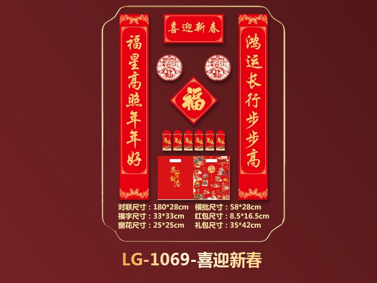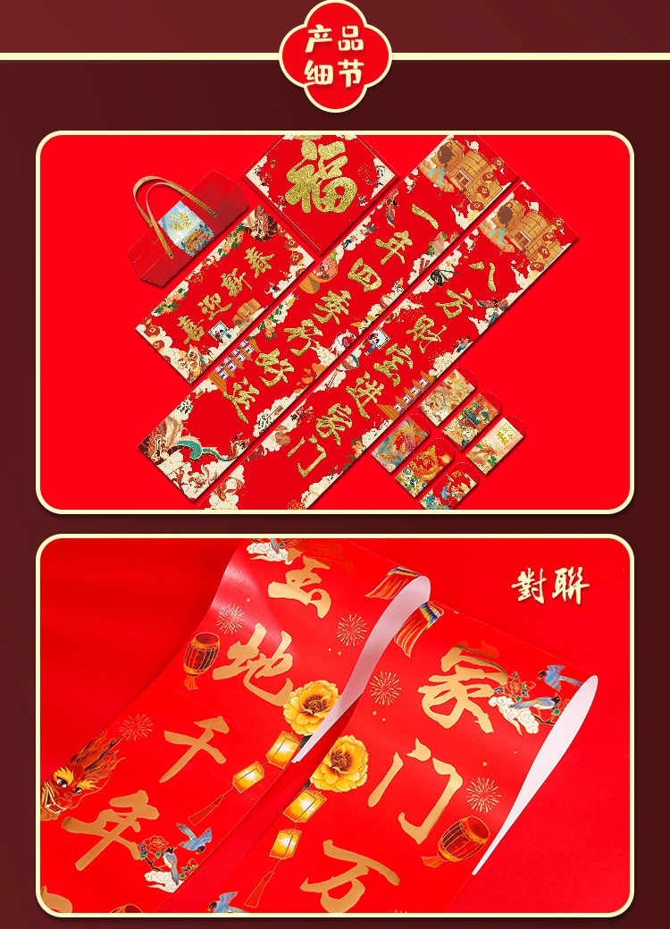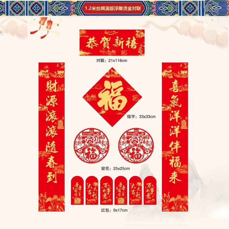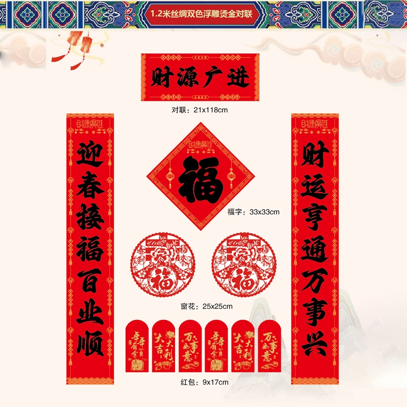 配置清单:丝绸双色浮雕烫金春联一副 118*21cm 丝绸双色浮雕烫金福字一张 33*33cm 荧光红烫金红包六个 9*17cm250g 静电膜窗花两张 25*25cm