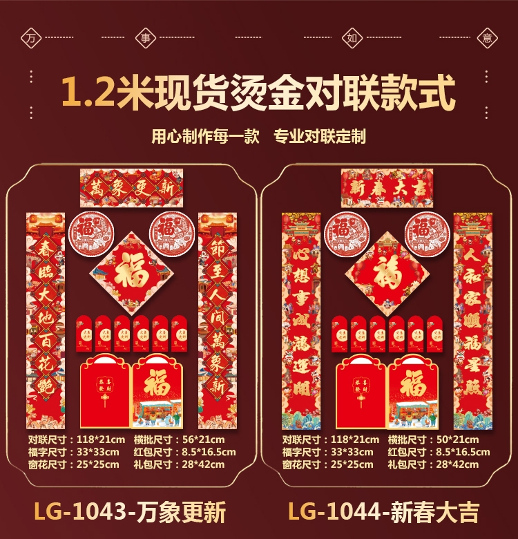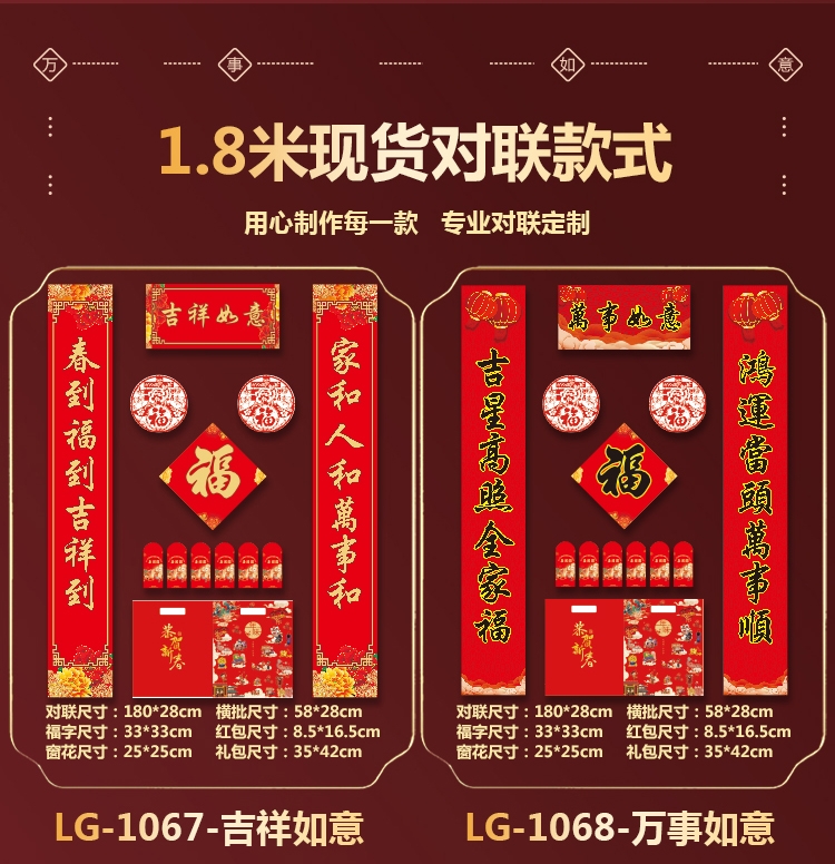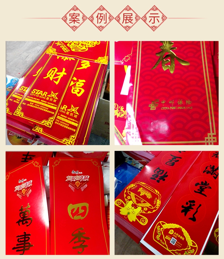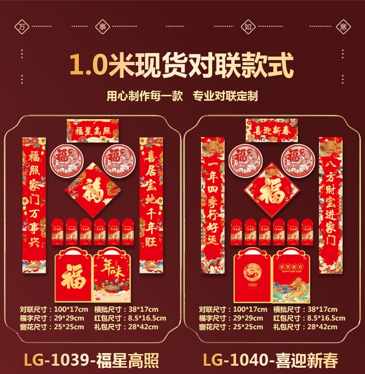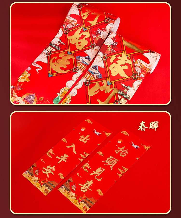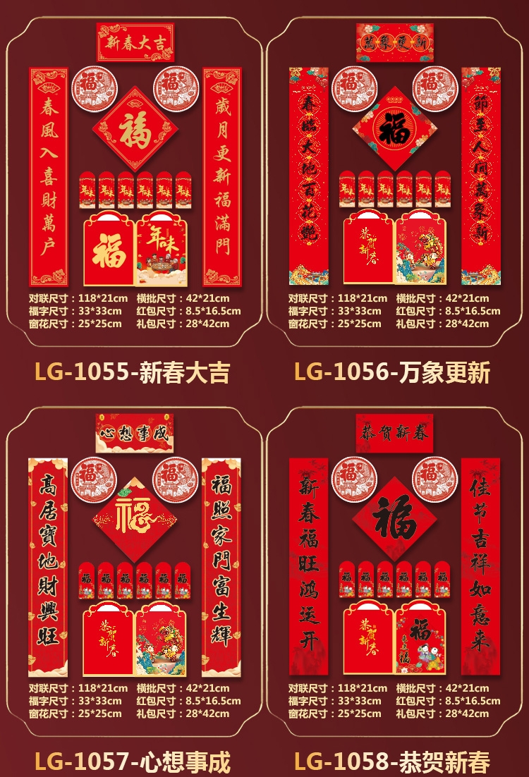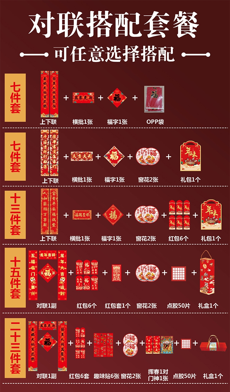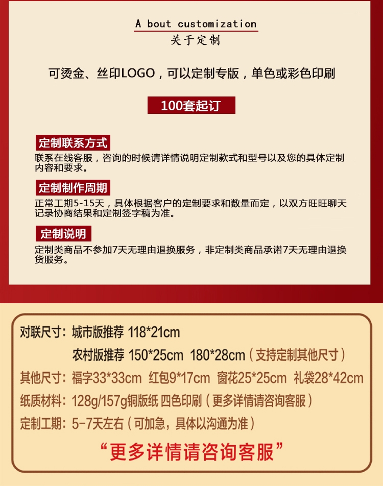 配置清单:丝绸双色浮雕烫金春联一副 118*21cm 丝绸双色浮雕烫金福字一张 33*33cm 荧光红烫金红包六个 9*17cm250g 静电膜窗花两张 25*25cm