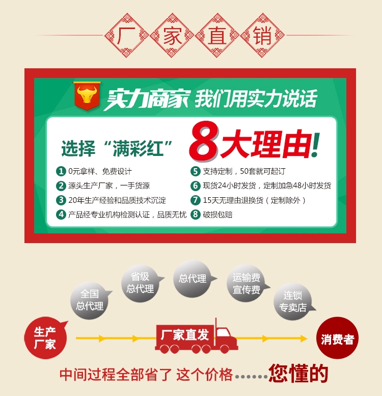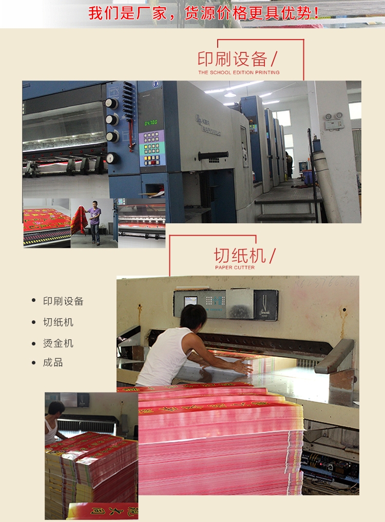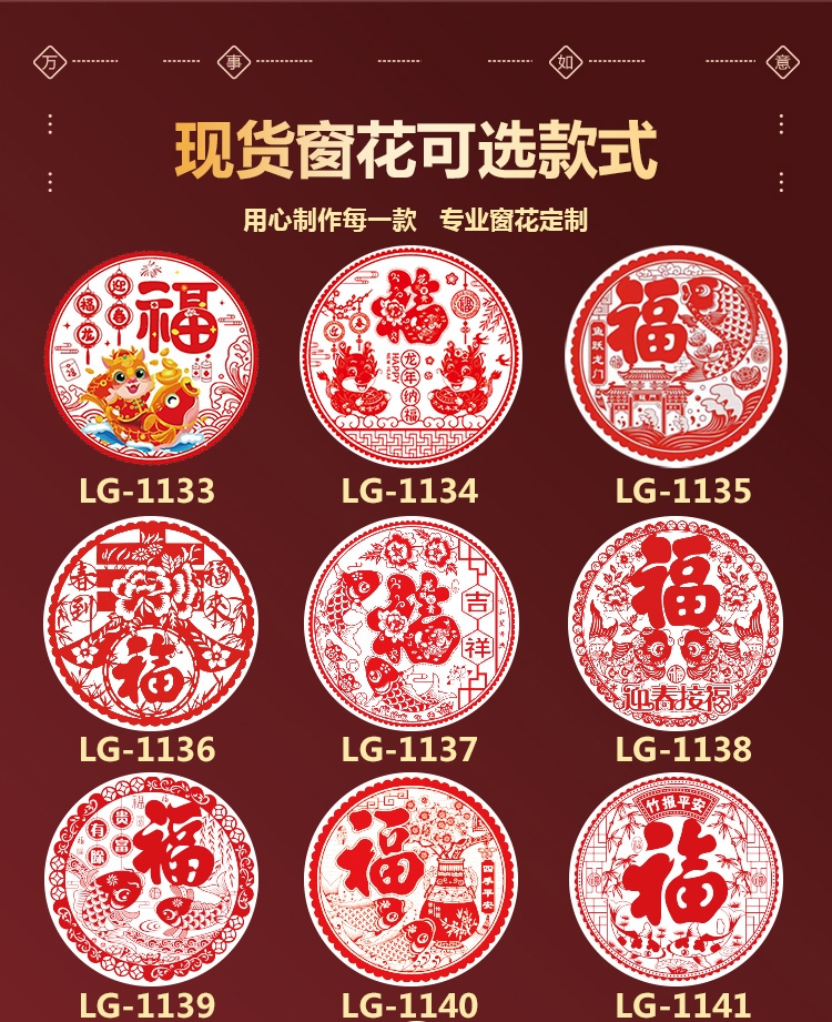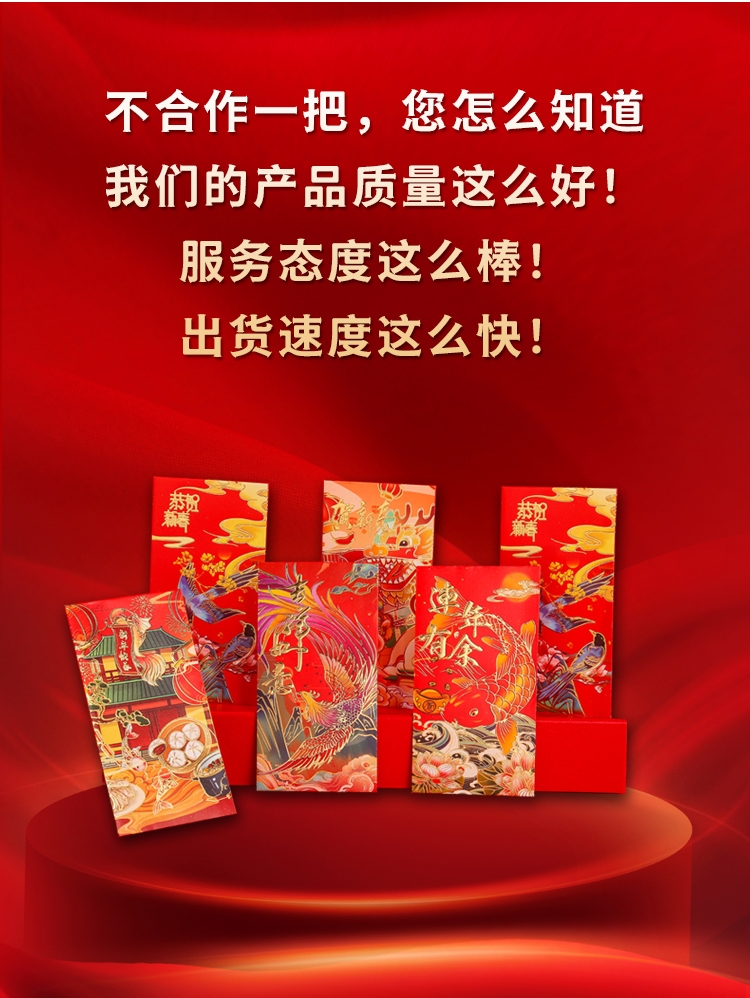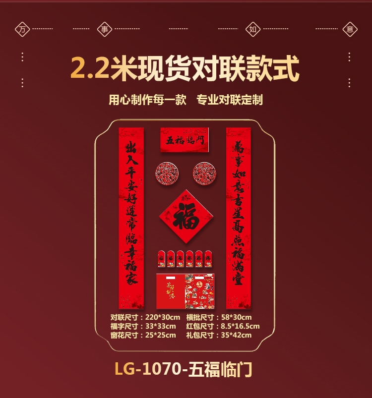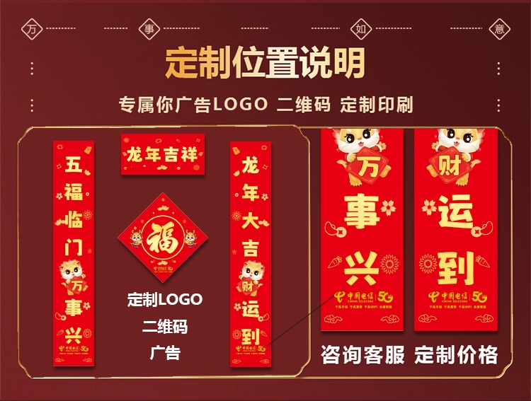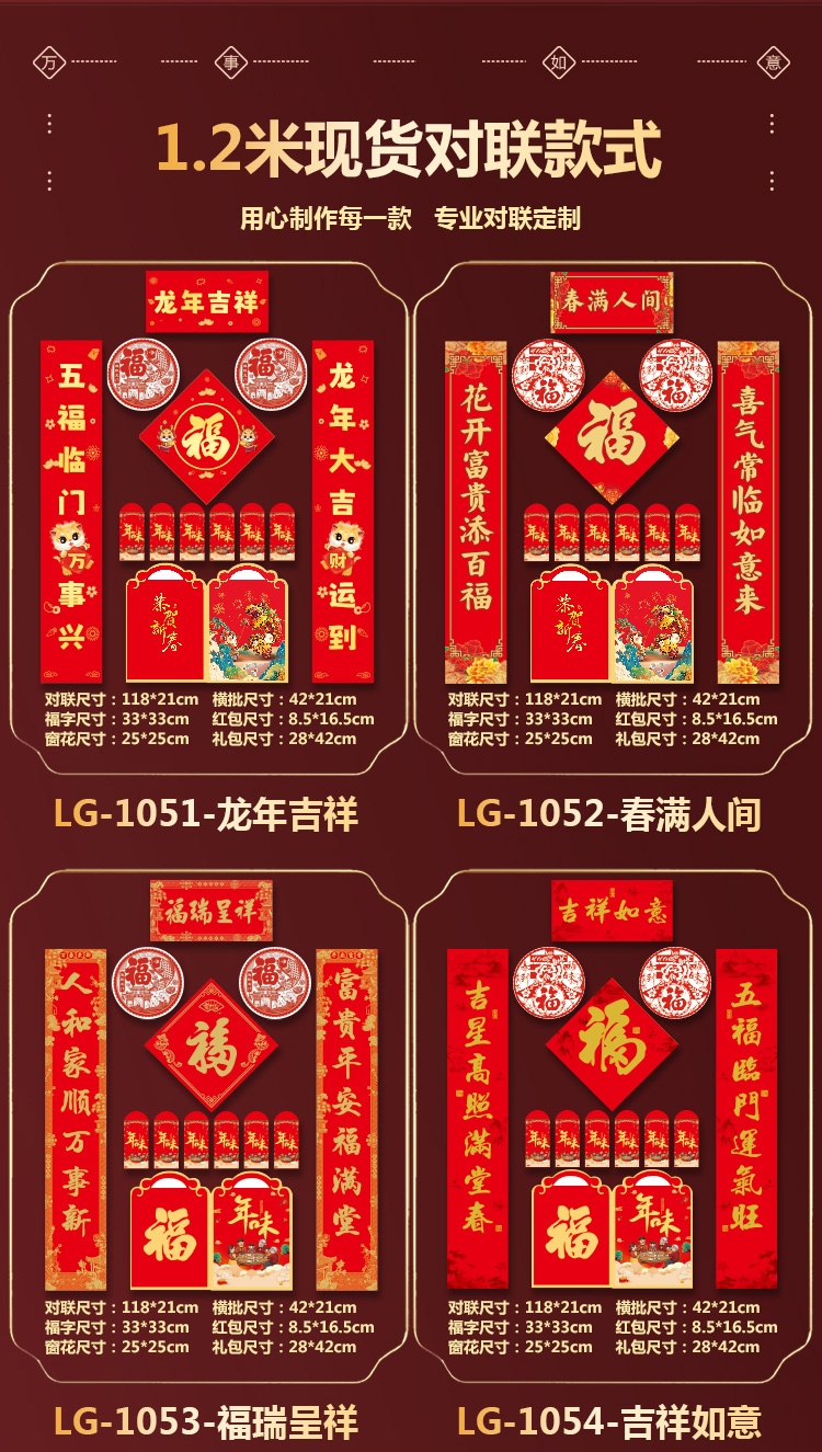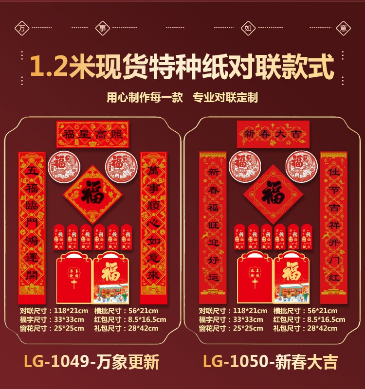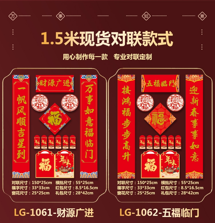 配置清单:丝绸双色浮雕烫金春联一副 118*21cm 丝绸双色浮雕烫金福字一张 33*33cm 荧光红烫金红包六个 9*17cm250g 静电膜窗花两张 25*25cm
