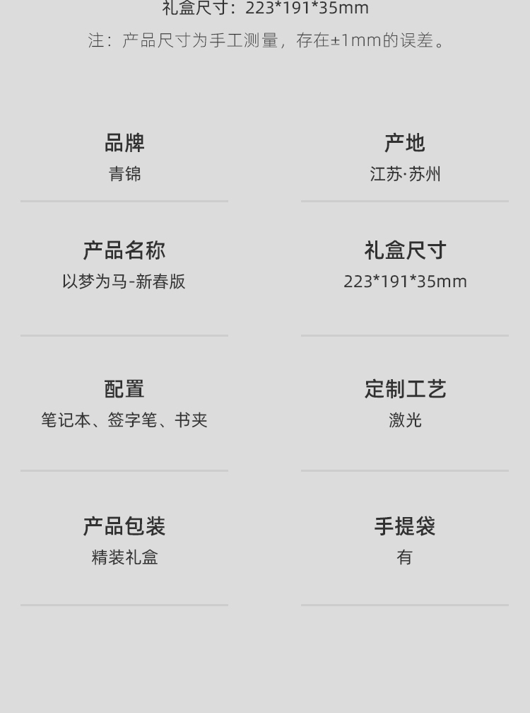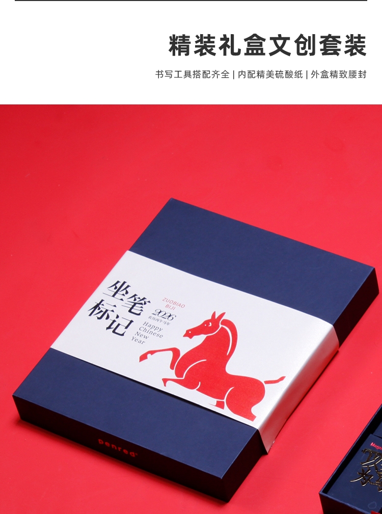 选用优选皮革 | 精工细作 | 丰富多彩印刷效果;0.5mm笔芯 滚珠笔头 在书写过程中更加顺滑;祝福文字书签 精致雕刻镂空工艺;书写工具搭配齐全 | 内配精美硫酸纸 | 外盒精致