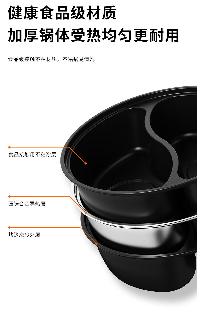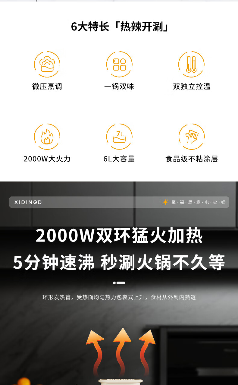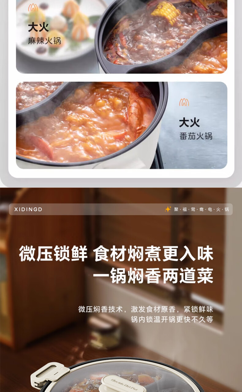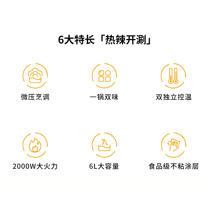 6L大容量鸳鸯锅,轻松满足全家火锅局;微压密封锅盖设计,提升锅内压力,加速食材熟透;防烫手柄+可视玻璃盖,烹饪过程一目了然