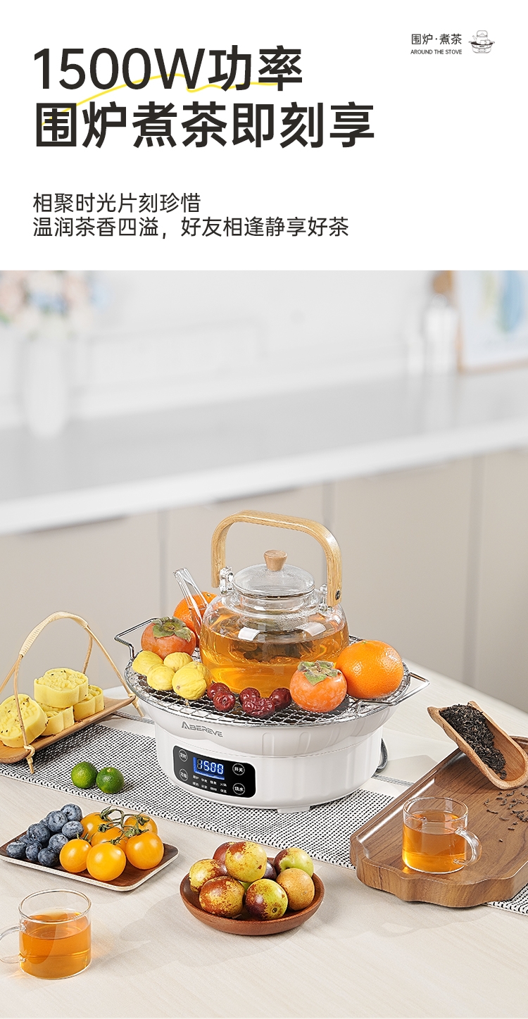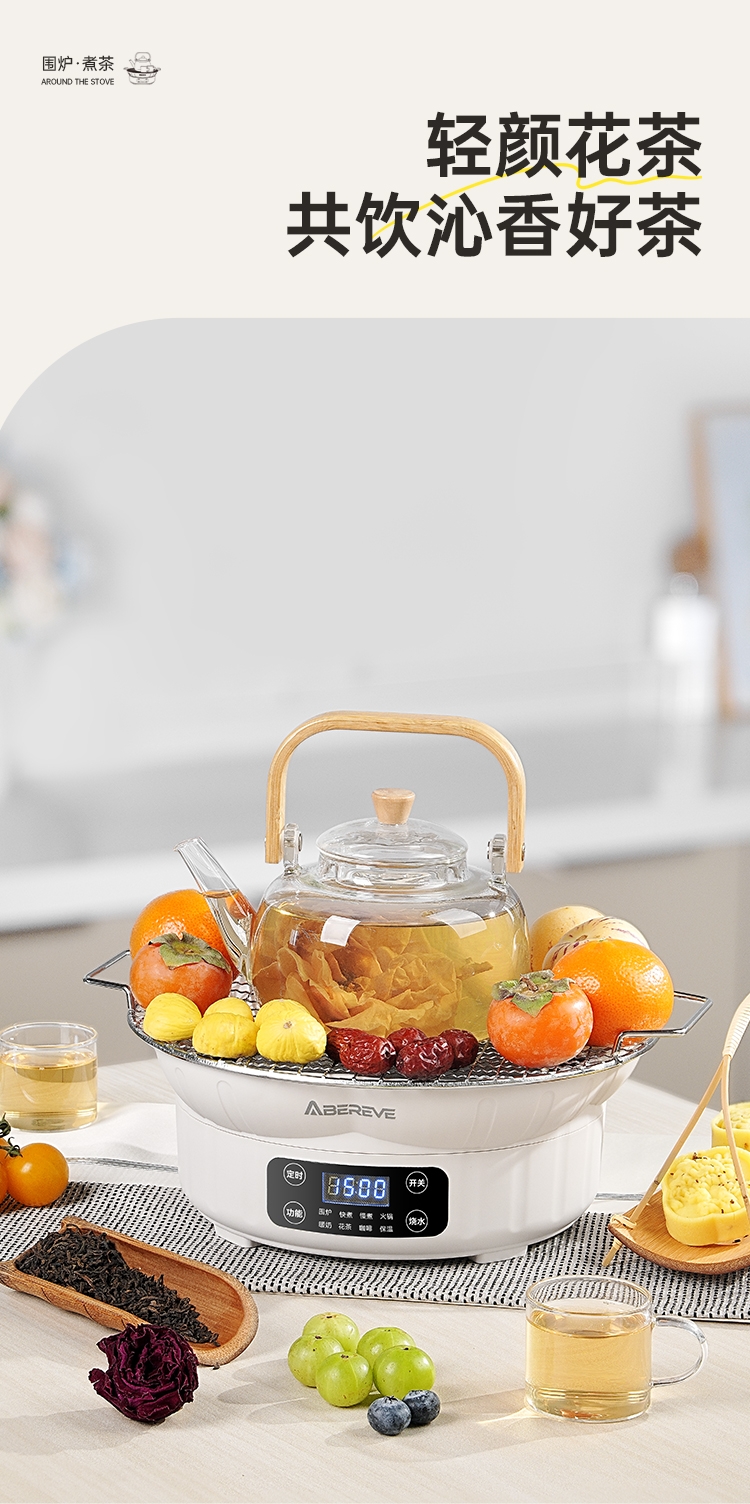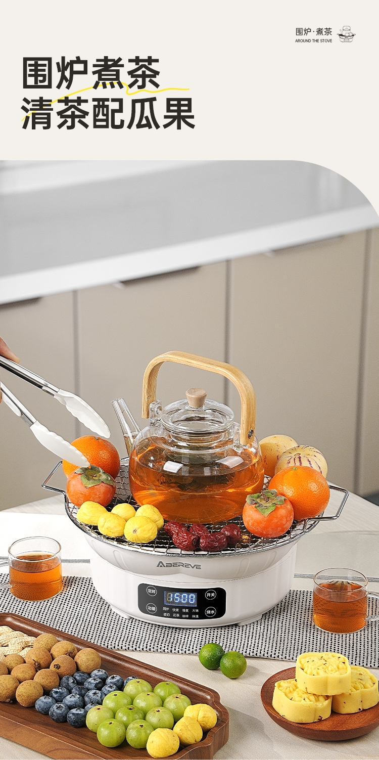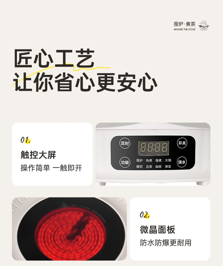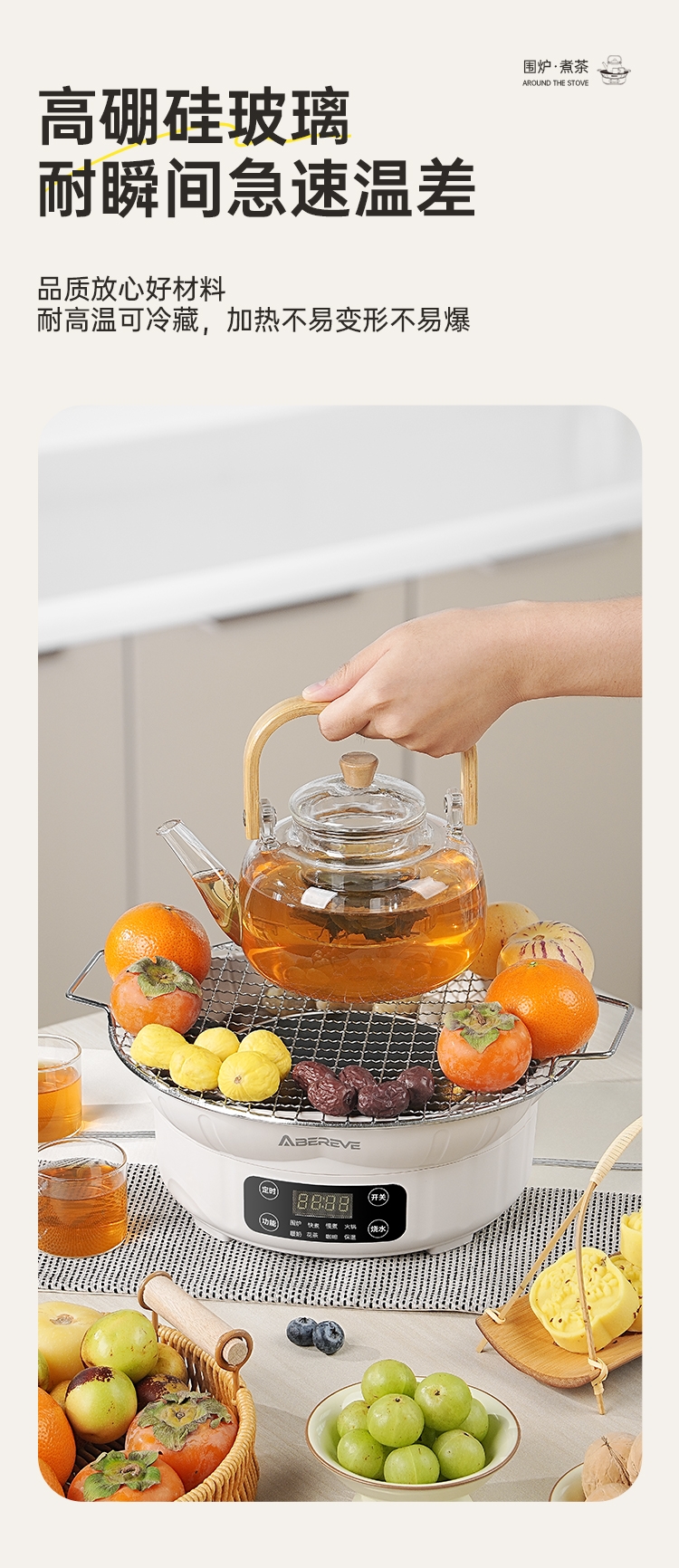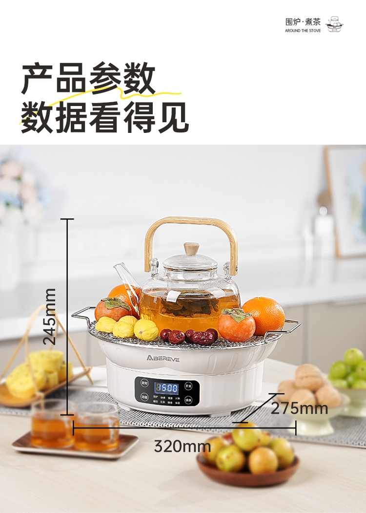 四位触控数码屏清晰显示实时温度、火力;一键启动快速响应+八档火力精准适配;自带烤架,玻璃茶壶配双杯,品质生活随时享