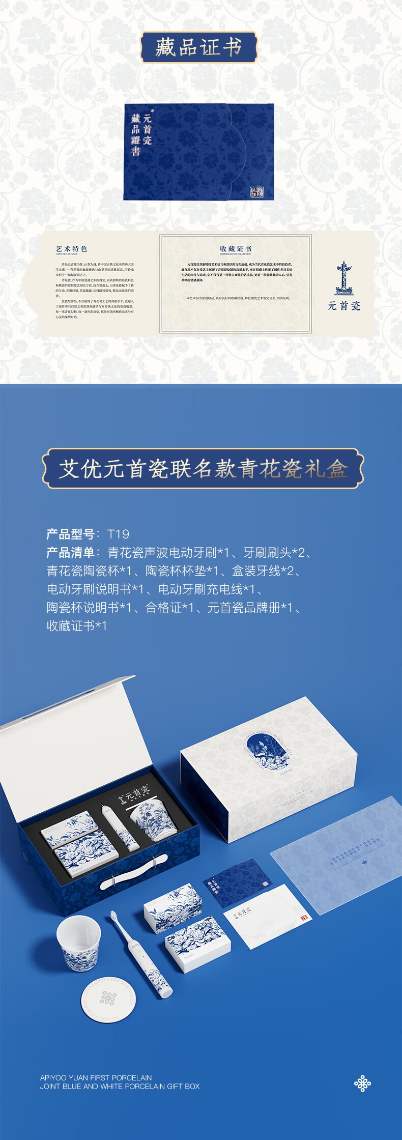 配置:青花瓷声波电动牙刷*1、牙刷刷头*2、盒装牙线*2 青花瓷陶瓷杯*1、陶瓷杯杯垫*1 电动牙刷说明书*1、电动牙刷充电线*1、合格证*1、收藏证书*1 陶瓷杯说明书*1、元首瓷品牌册*1