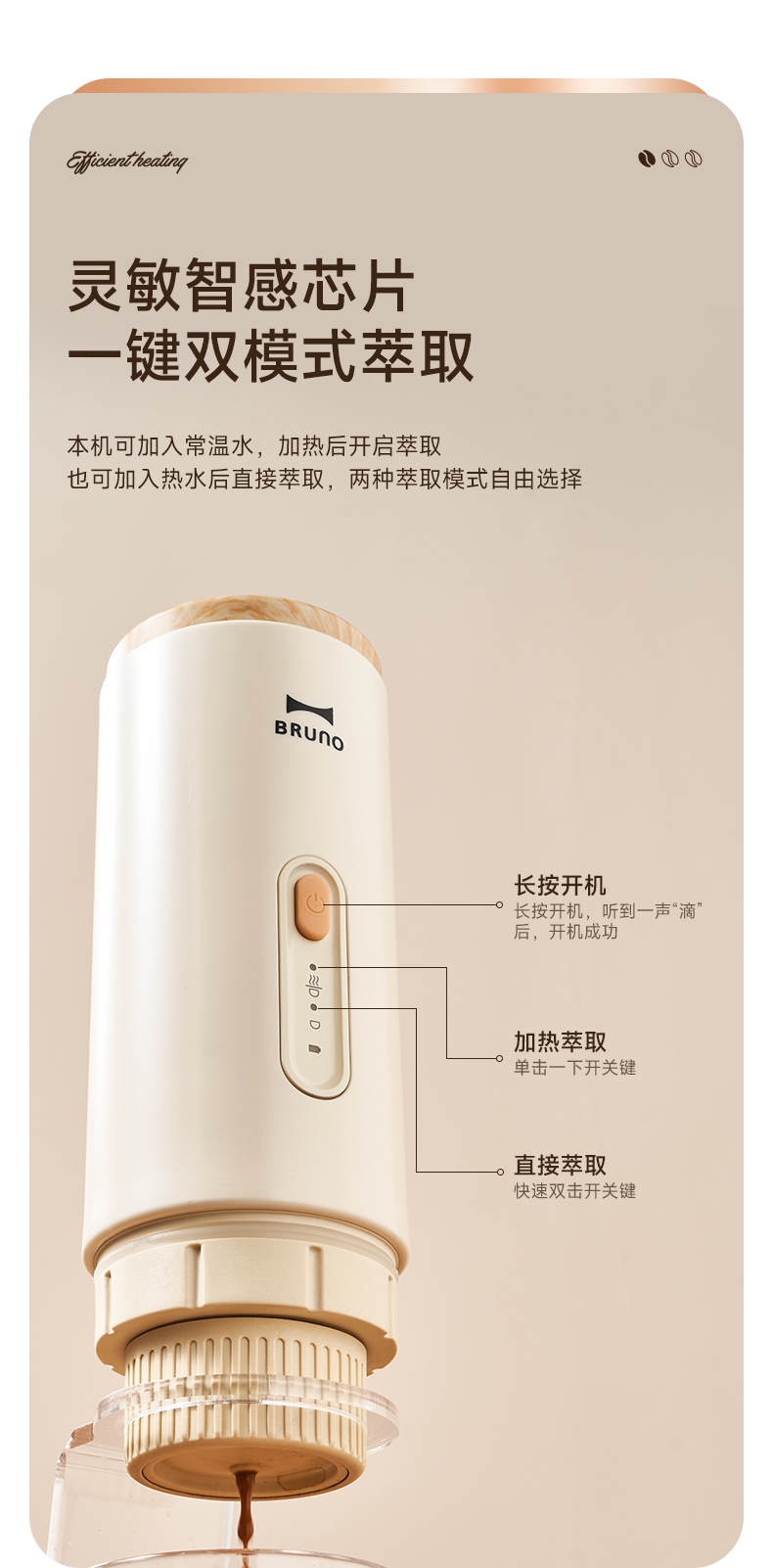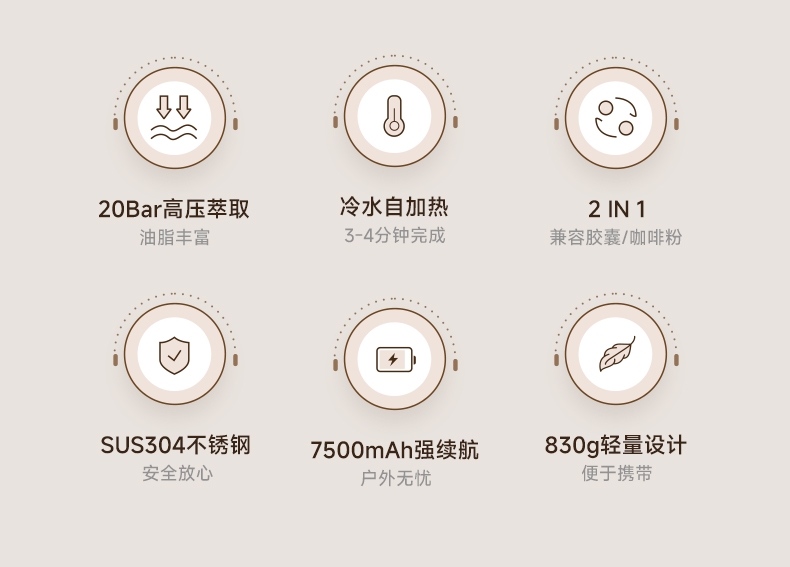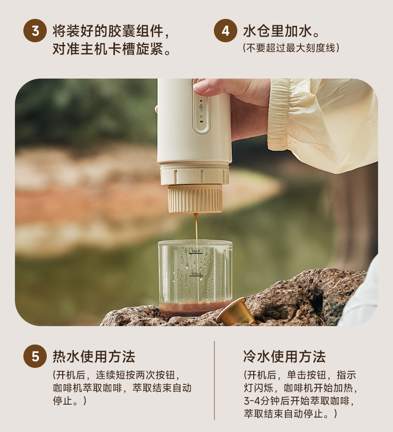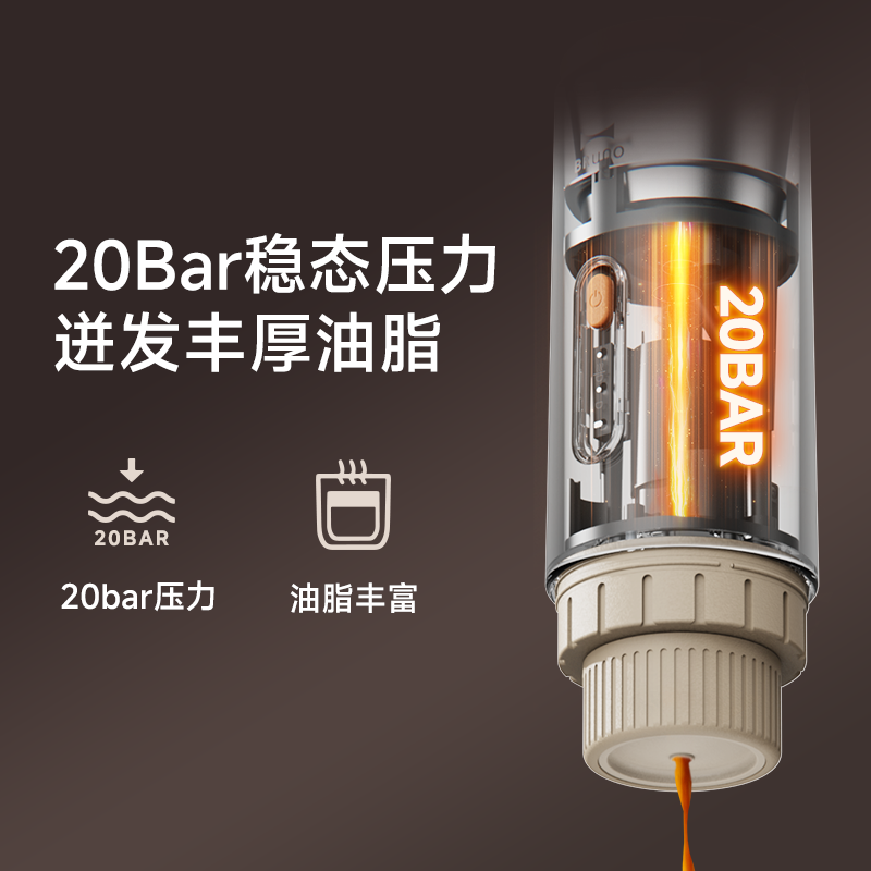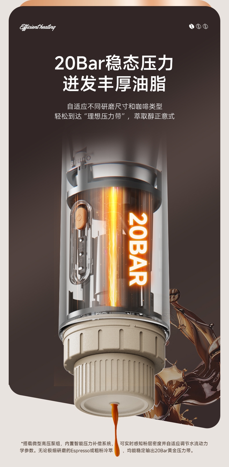 有水就能萃,不挑水温:热萃/直萃模式随心选;内有微型高压水泵,压力稳定萃 取可达20Bar;兼容咖啡粉&咖啡胶囊,两个粉仓可随心替换
