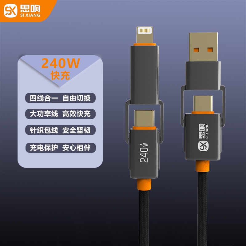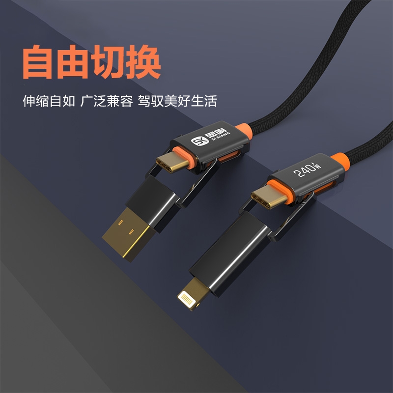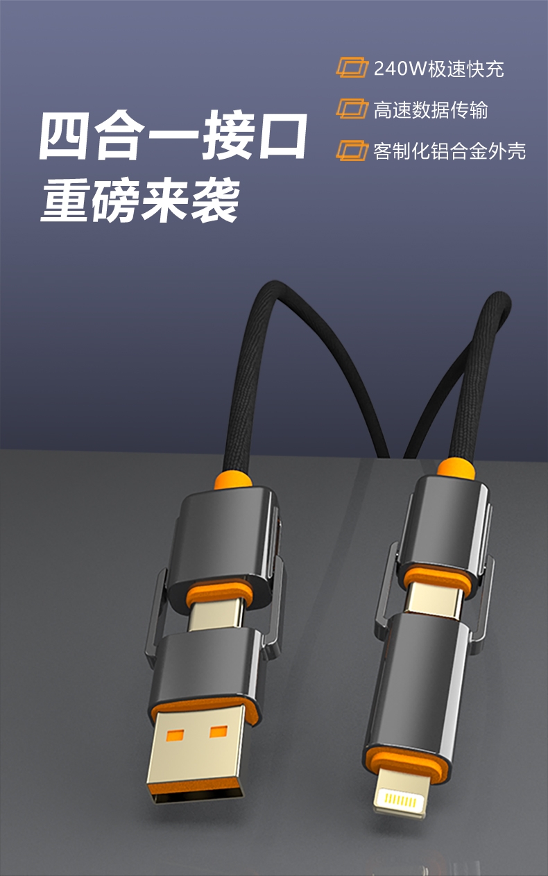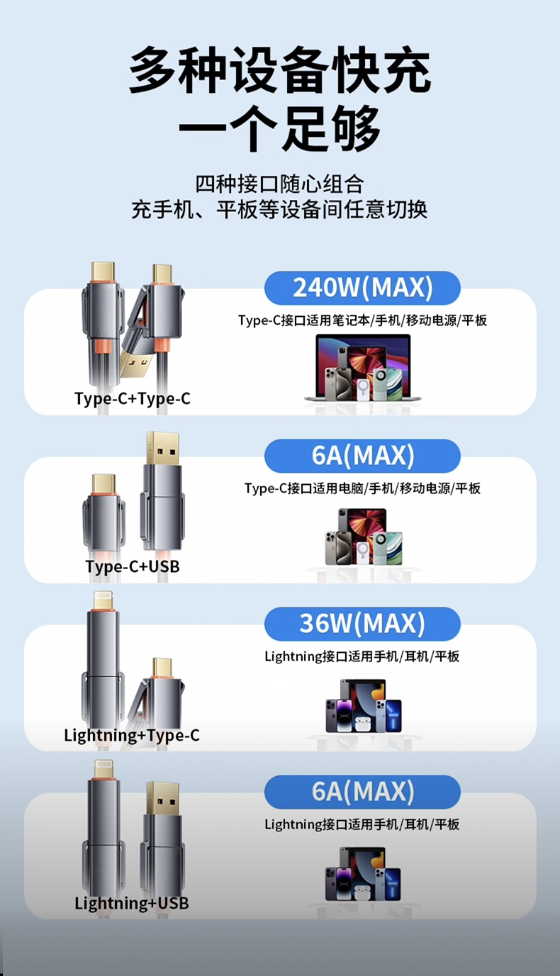 :锌合金 + 编织线;四合一快充线240W;多功能快充线