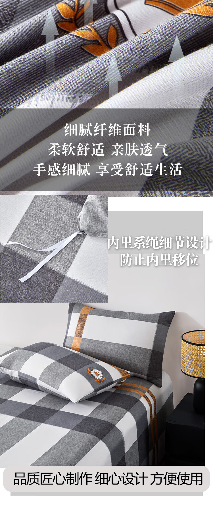 面料亲肤透气,柔软舒适;内角吊绳设计,实用性强,被子不易跑;高档彩盒设计,有礼有面