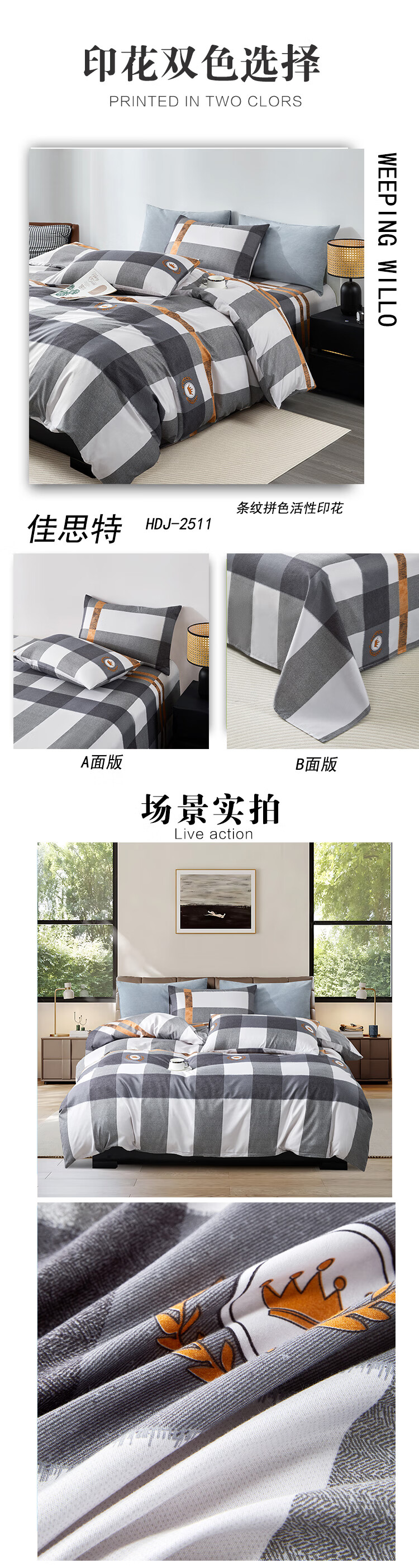配置清单:被罩:200*230cm*1 床单:230*250cm*1 枕套:48*74CM*2