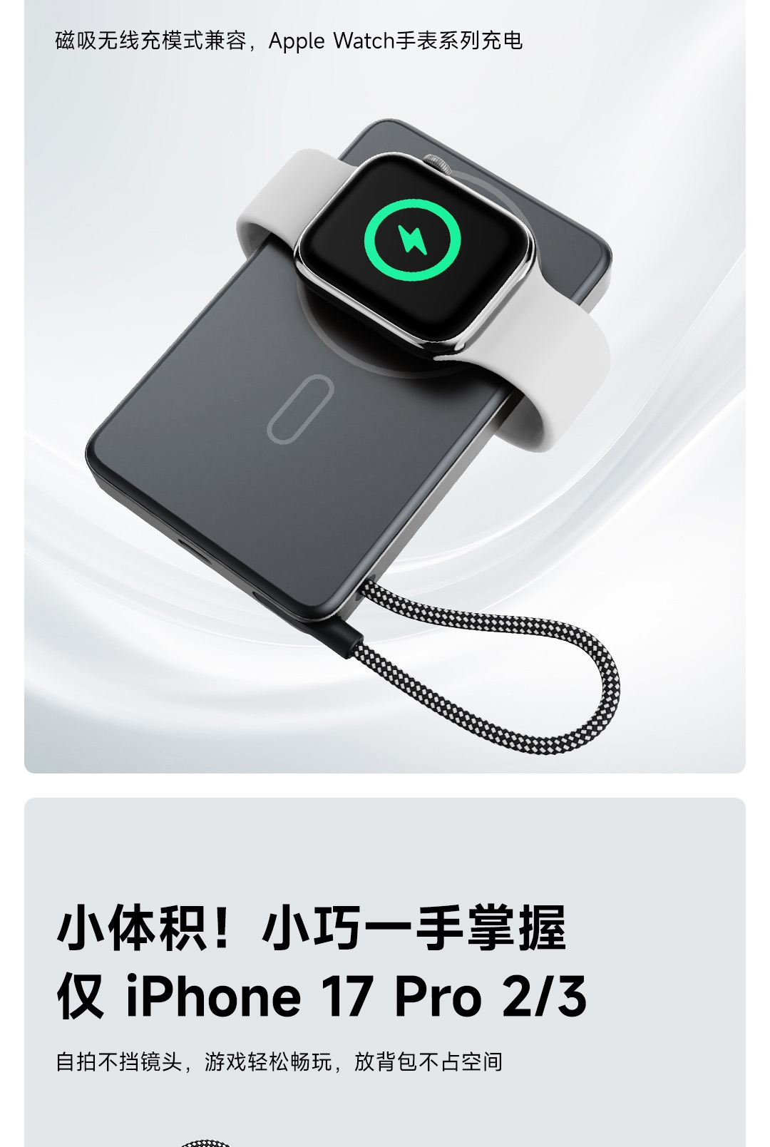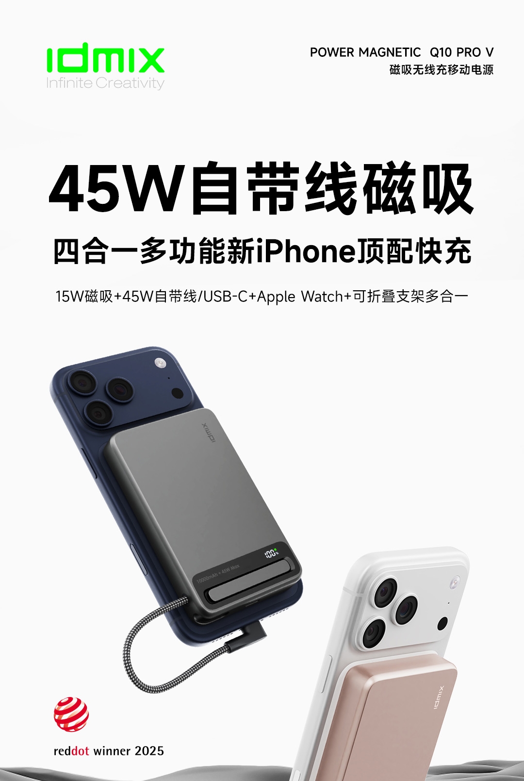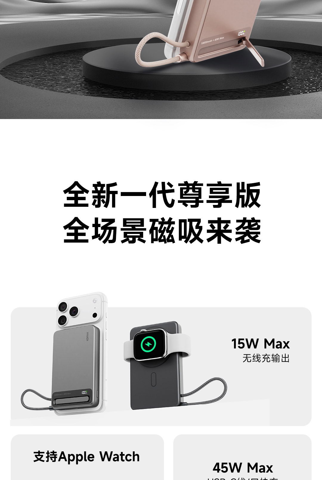 荣获2025年德国红点奖;10000mAh支持Apple Watch系列充电;PD45W快充线+15W强力磁吸无线输出