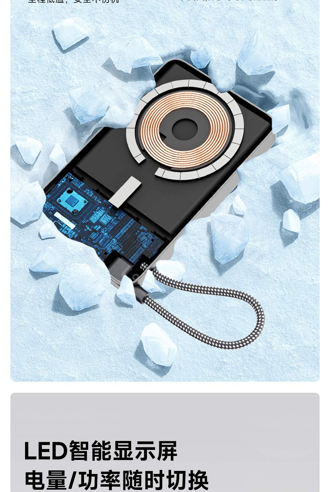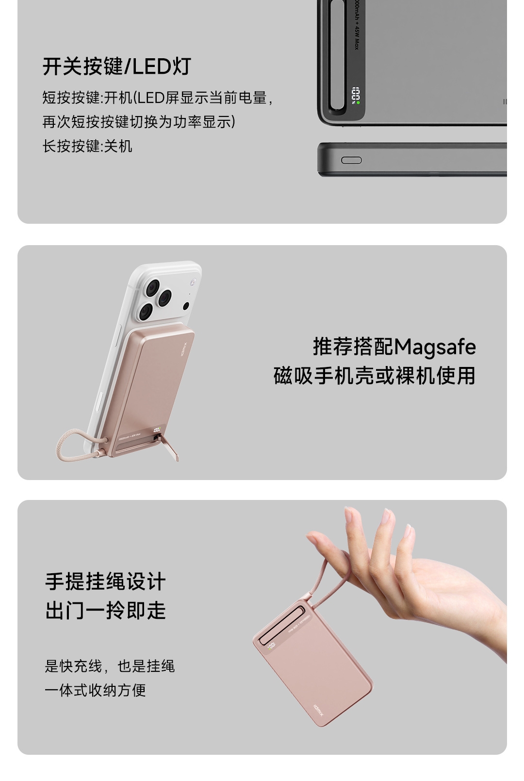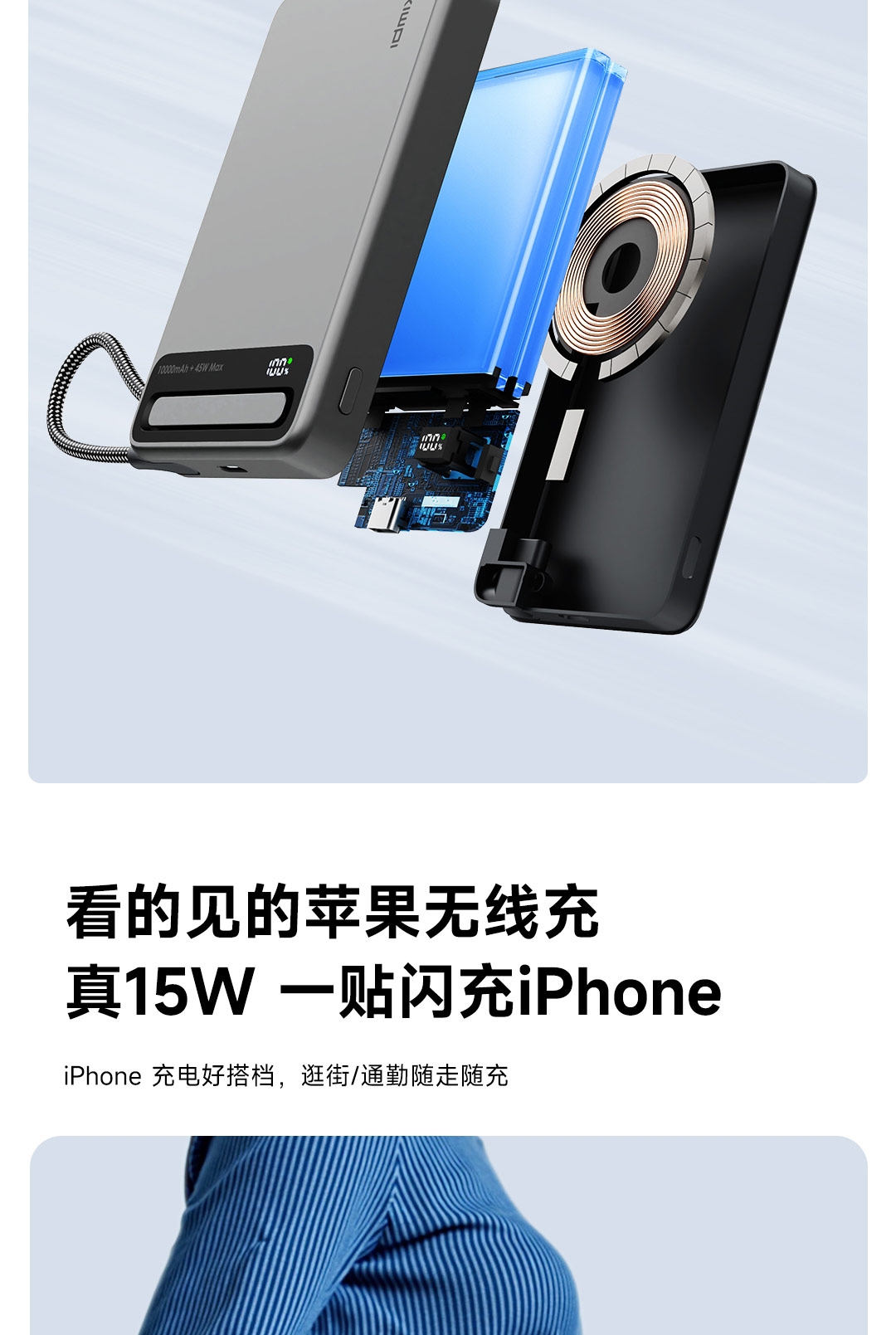 功能:多U口输出,磁吸充电,双向快充,自带支架,自带数据线,自带屏幕显示,无线充电