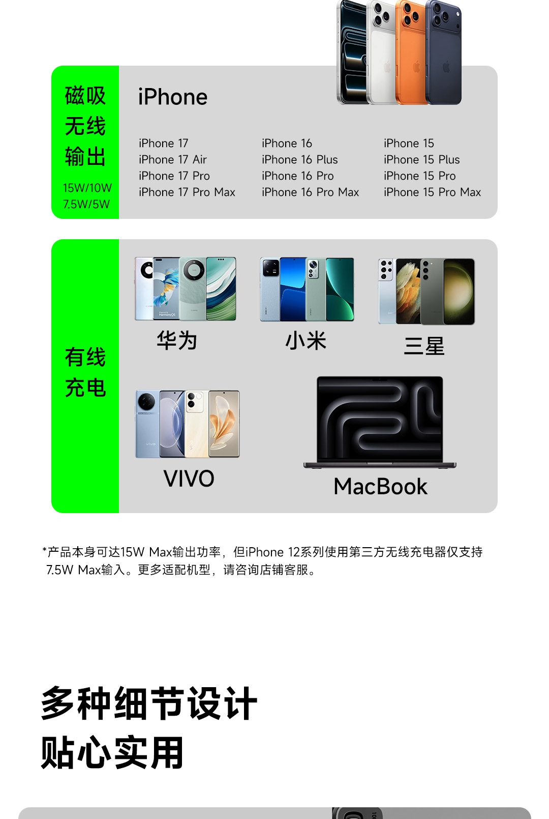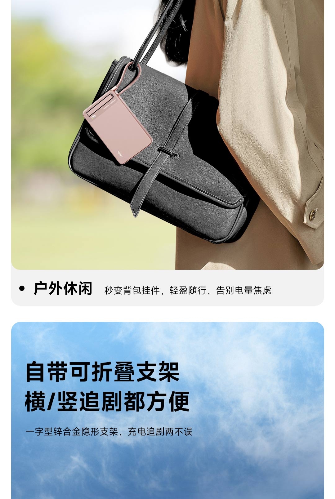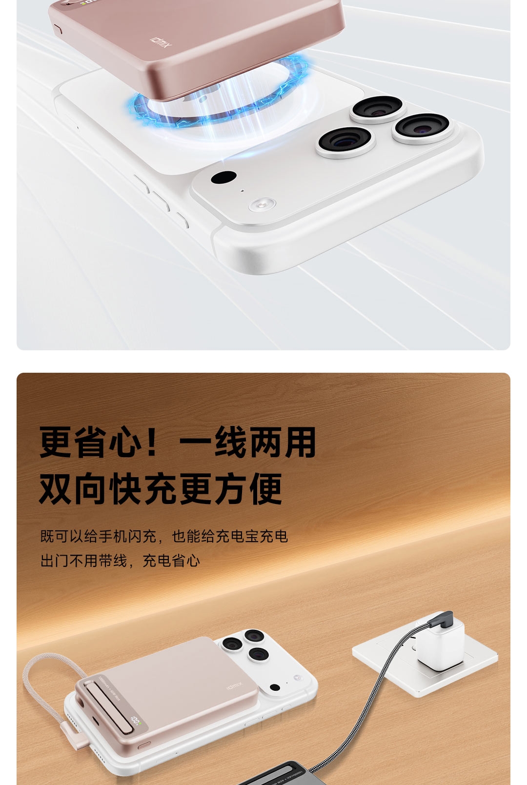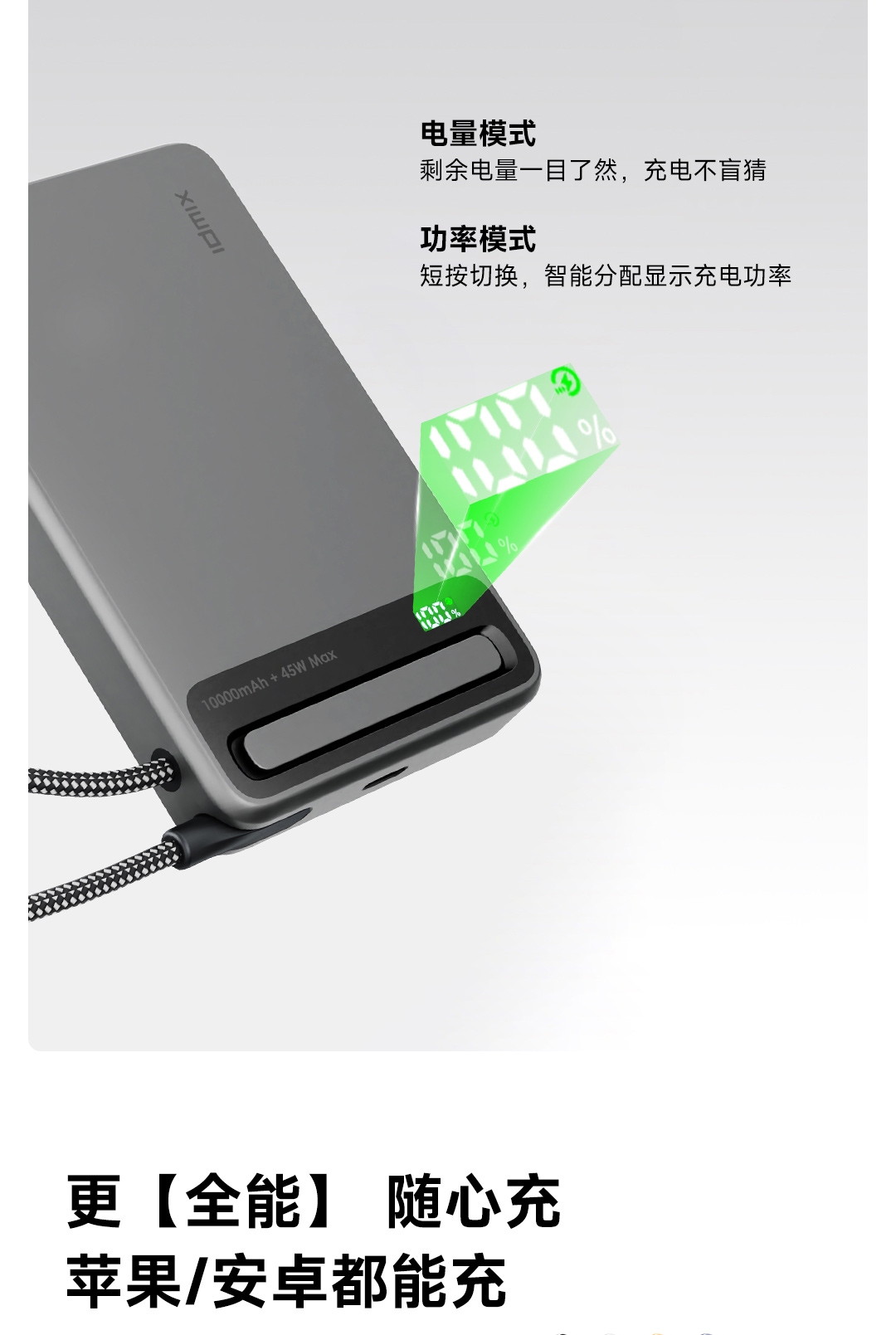 功能:多U口输出,磁吸充电,双向快充,自带支架,自带数据线,自带屏幕显示,无线充电
