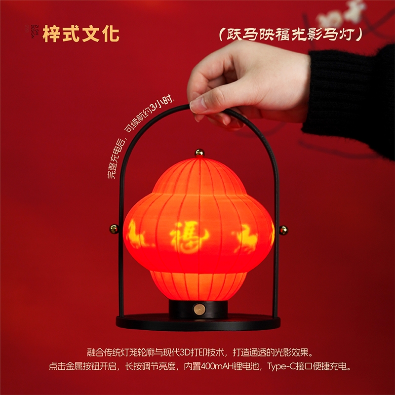 采用中式八边形结构,融合马灯结构与传统灯笼形态;现代3D打印技术,光影流转小夜灯;奔马逐风原创插画,独一无二的沙发毯;“葫芦马”新春红包,寄托福气、禄运