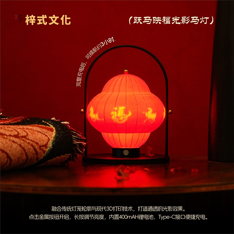 采用中式八边形结构,融合马灯结构与传统灯笼形态;现代3D打印技术,光影流转小夜灯;奔马逐风原创插画,独一无二的盖毯;“葫芦马”新春红包,寄托福气、禄运