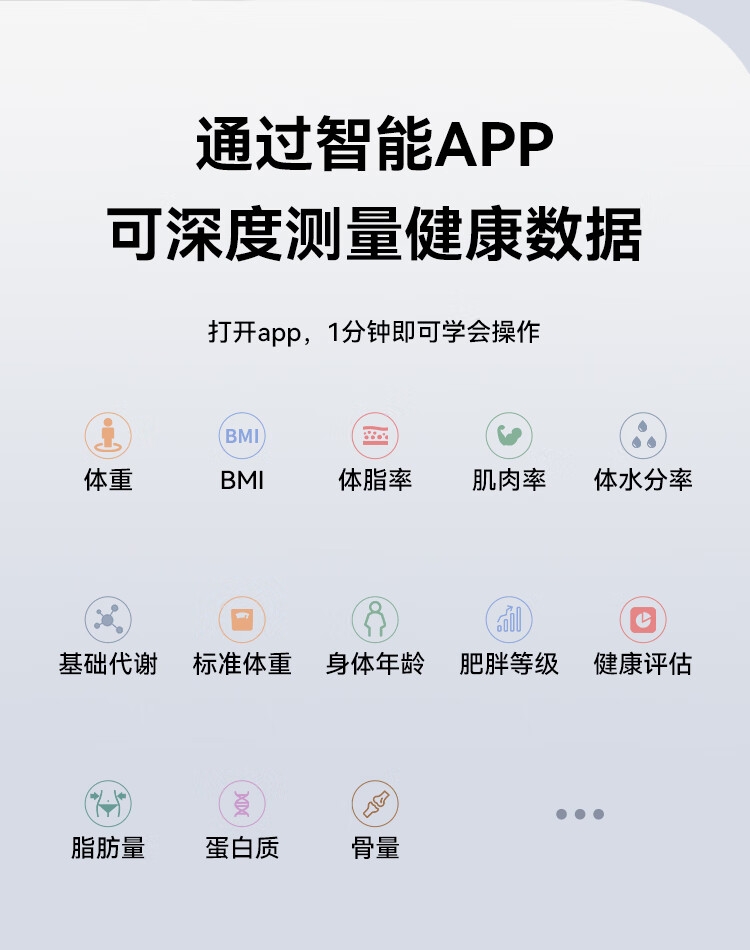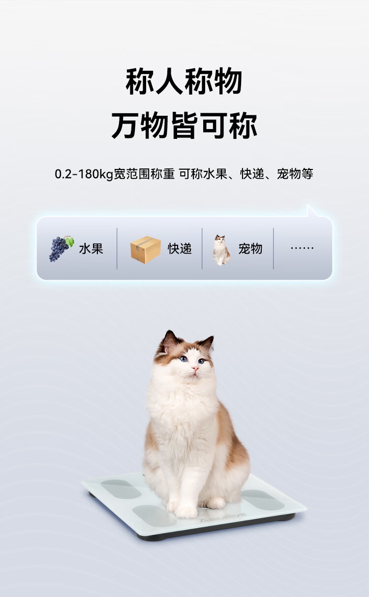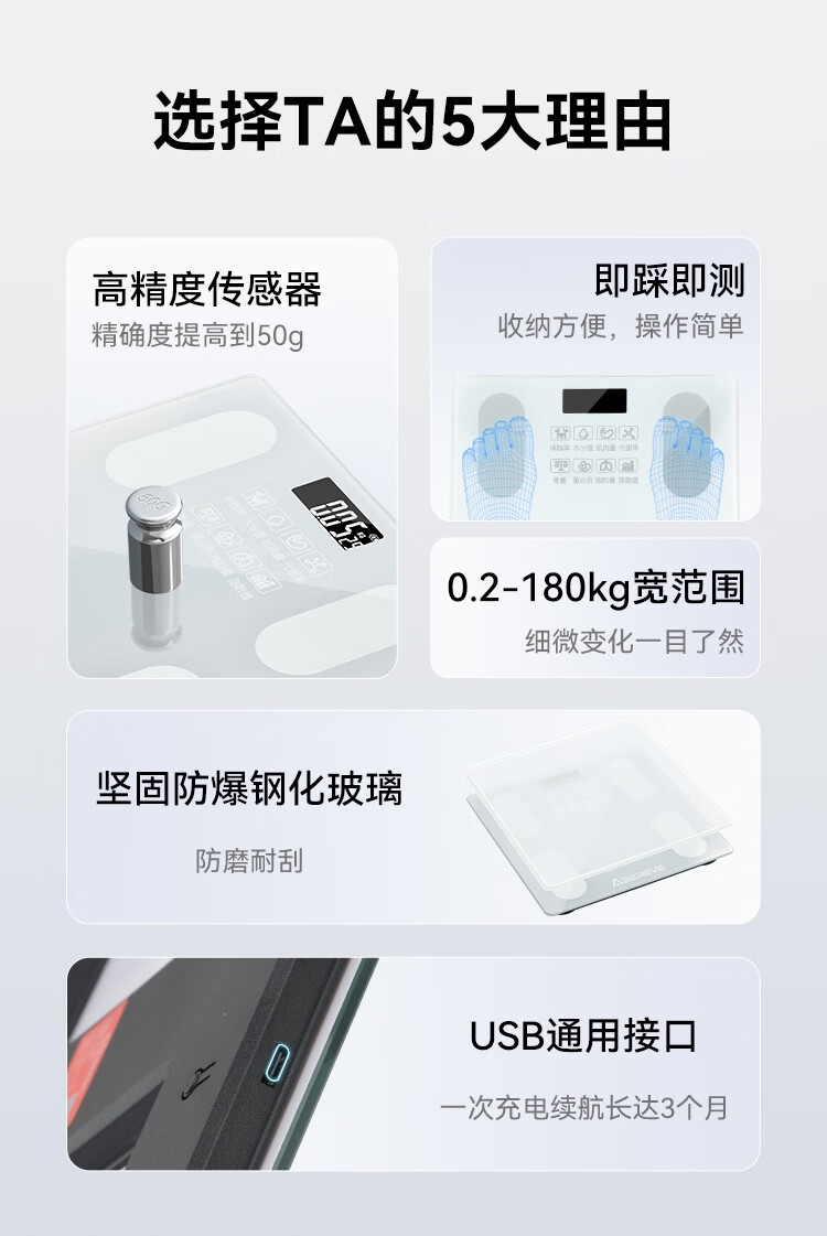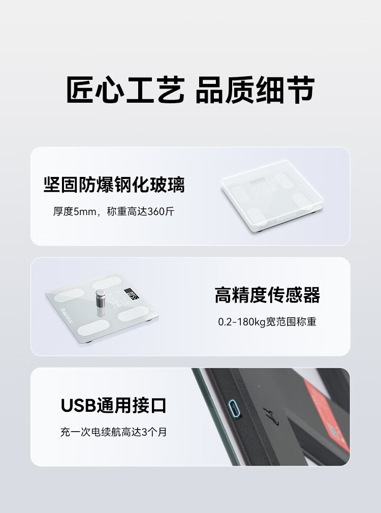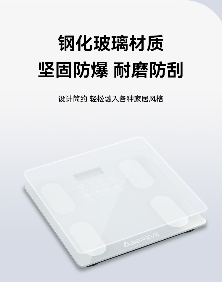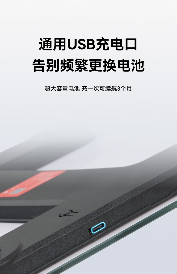 坚固防爆钢化玻璃材质,耐磨防刮;简约设计轻松融入家居风格;轻薄设计,收纳方便,操作简单,即踩即测