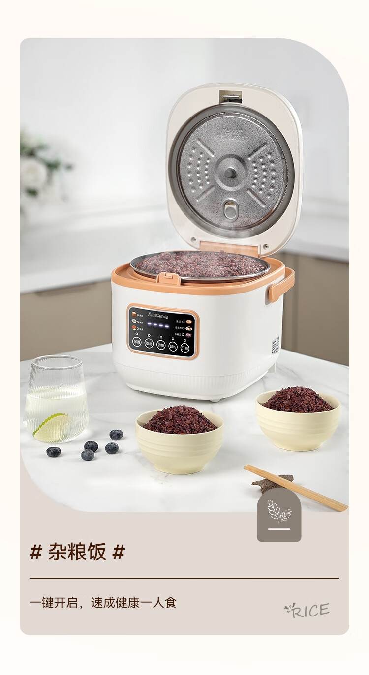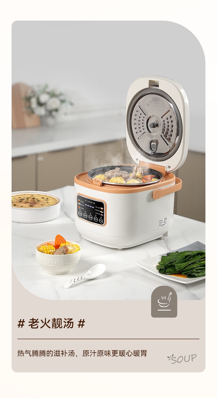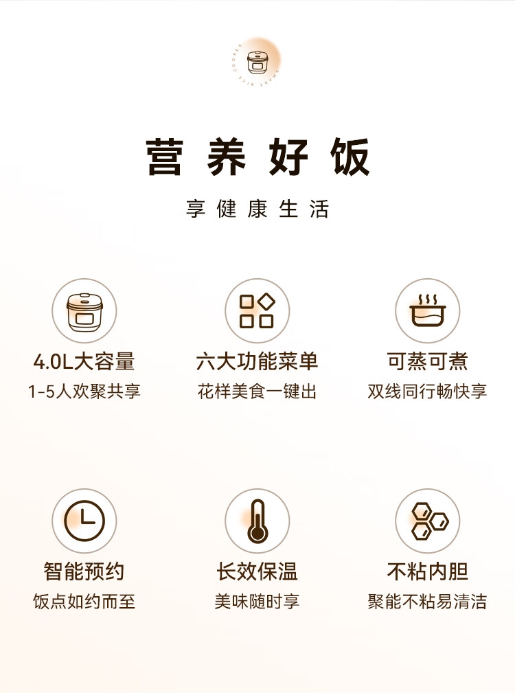 6大美食功能,美味一键出;24小时超长预约范围,到点自动启动,到家即享热饭;上蒸下煮,双重防溢设计,一锅两用,高效省时