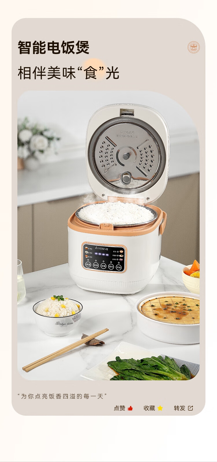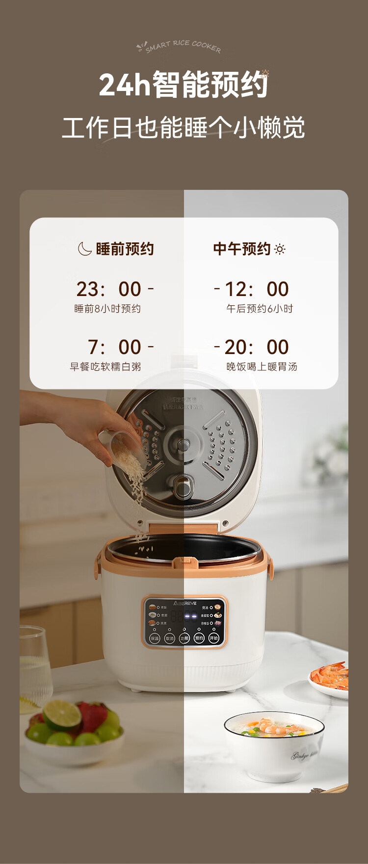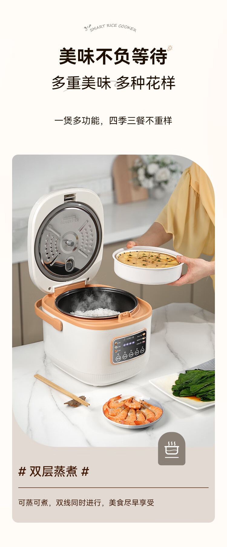 6大美食功能,美味一键出;24小时超长预约范围,到点自动启动,到家即享热饭;上蒸下煮,双重防溢设计,一锅两用,高效省时