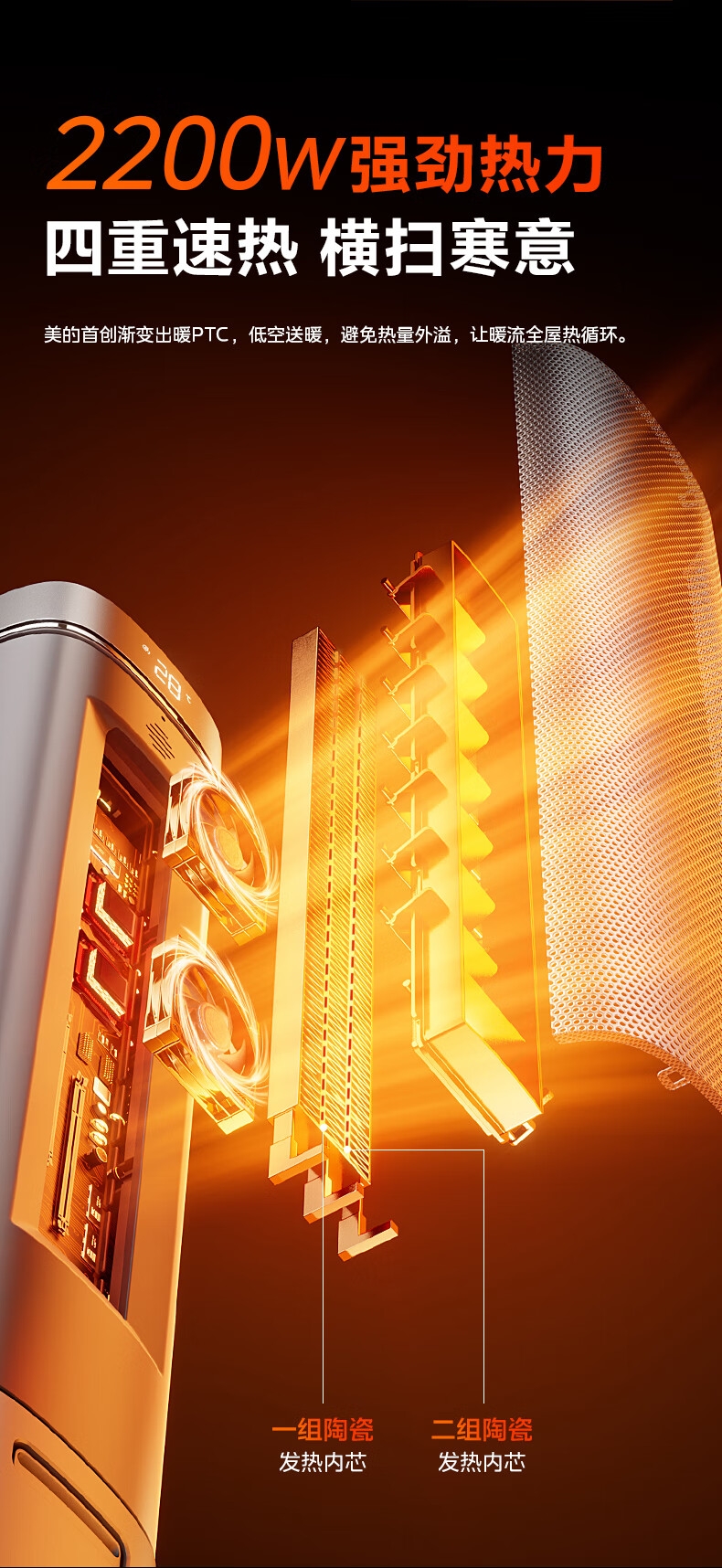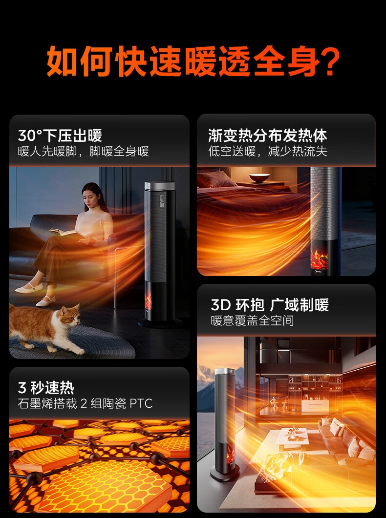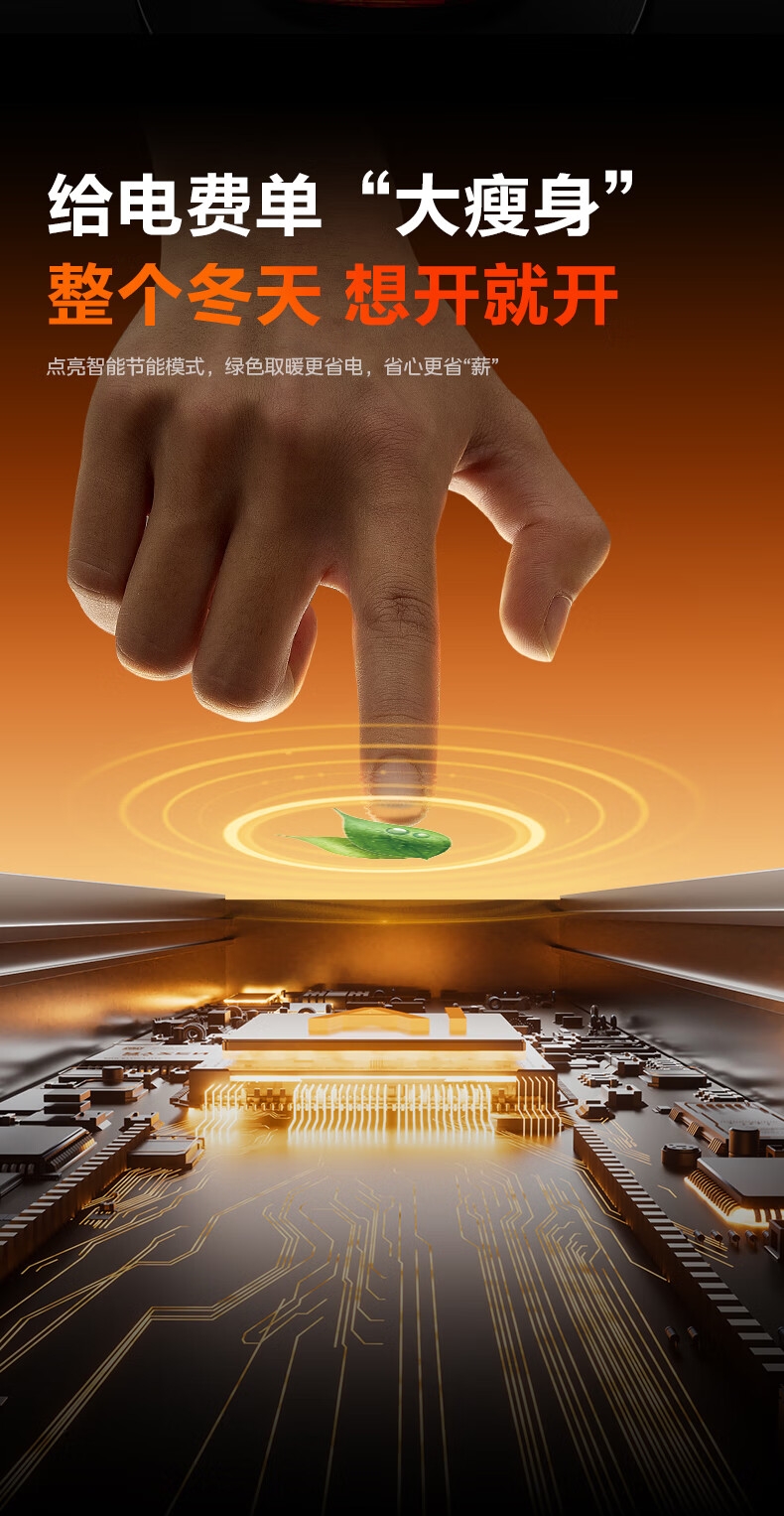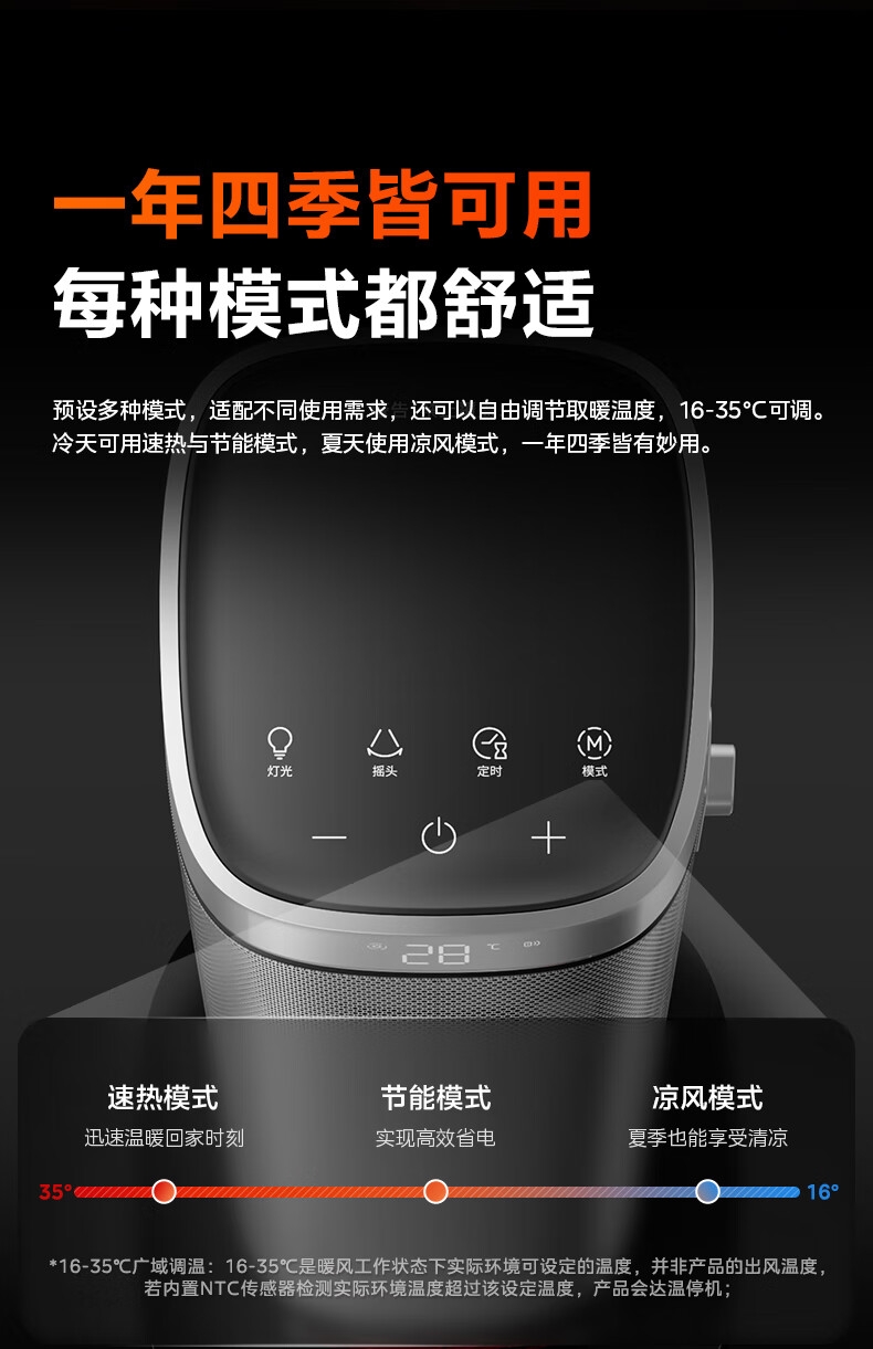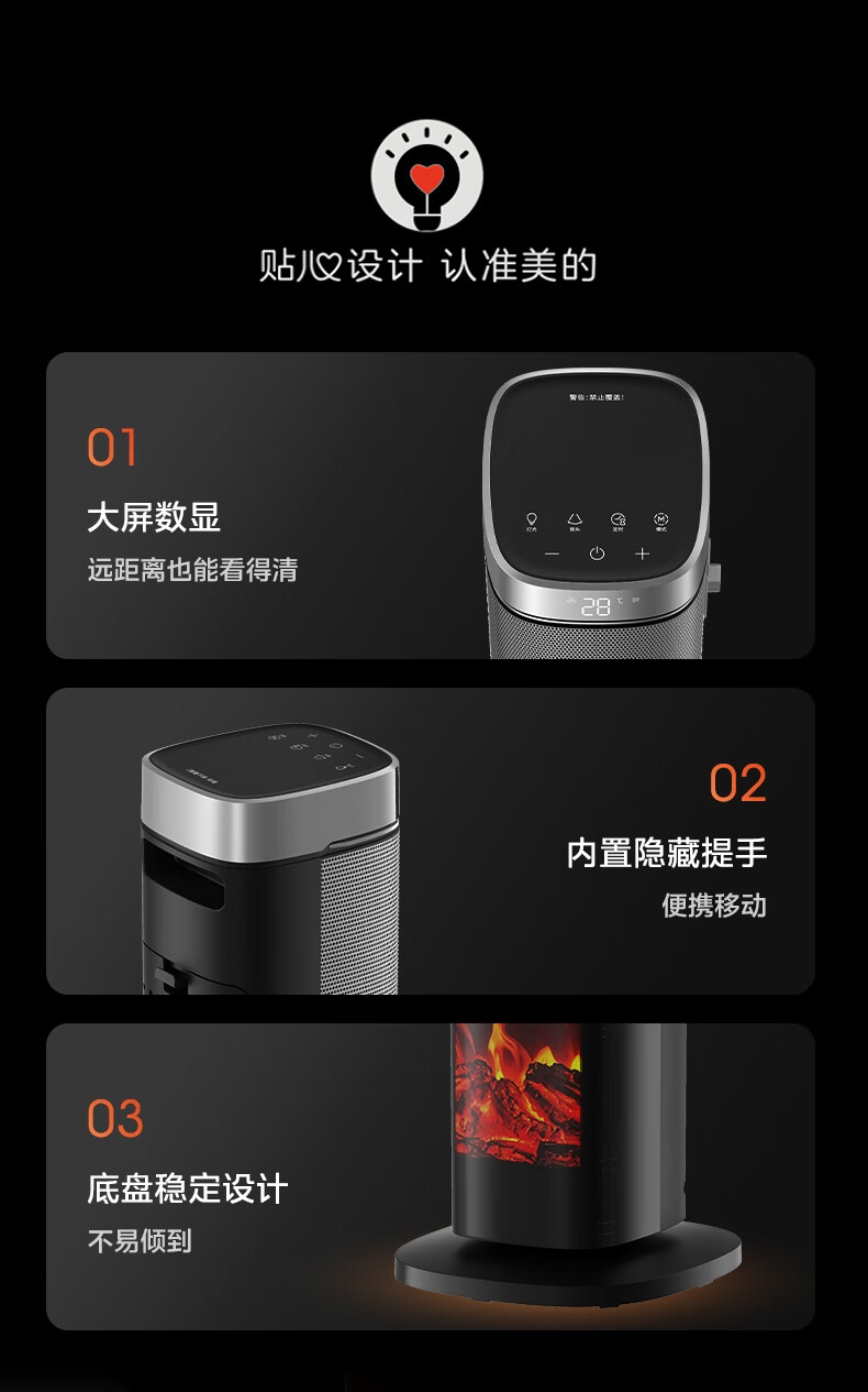 采用高效PTC陶瓷发热技术,升温迅速,暖意即刻环绕;220V家用电压设计,节能省电,呵护每一度电;耀石黑外观,简约大气,融入多种家居风格