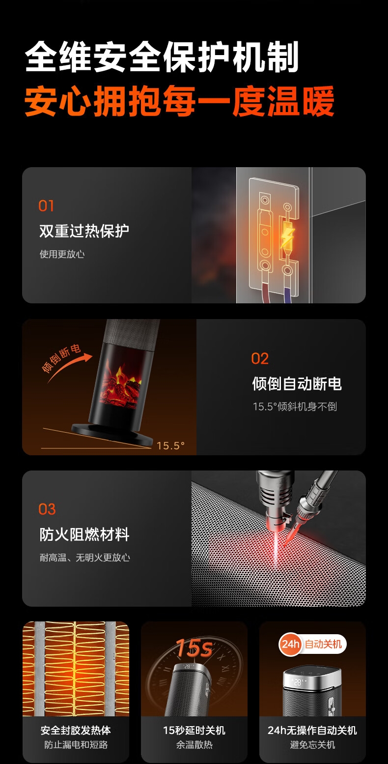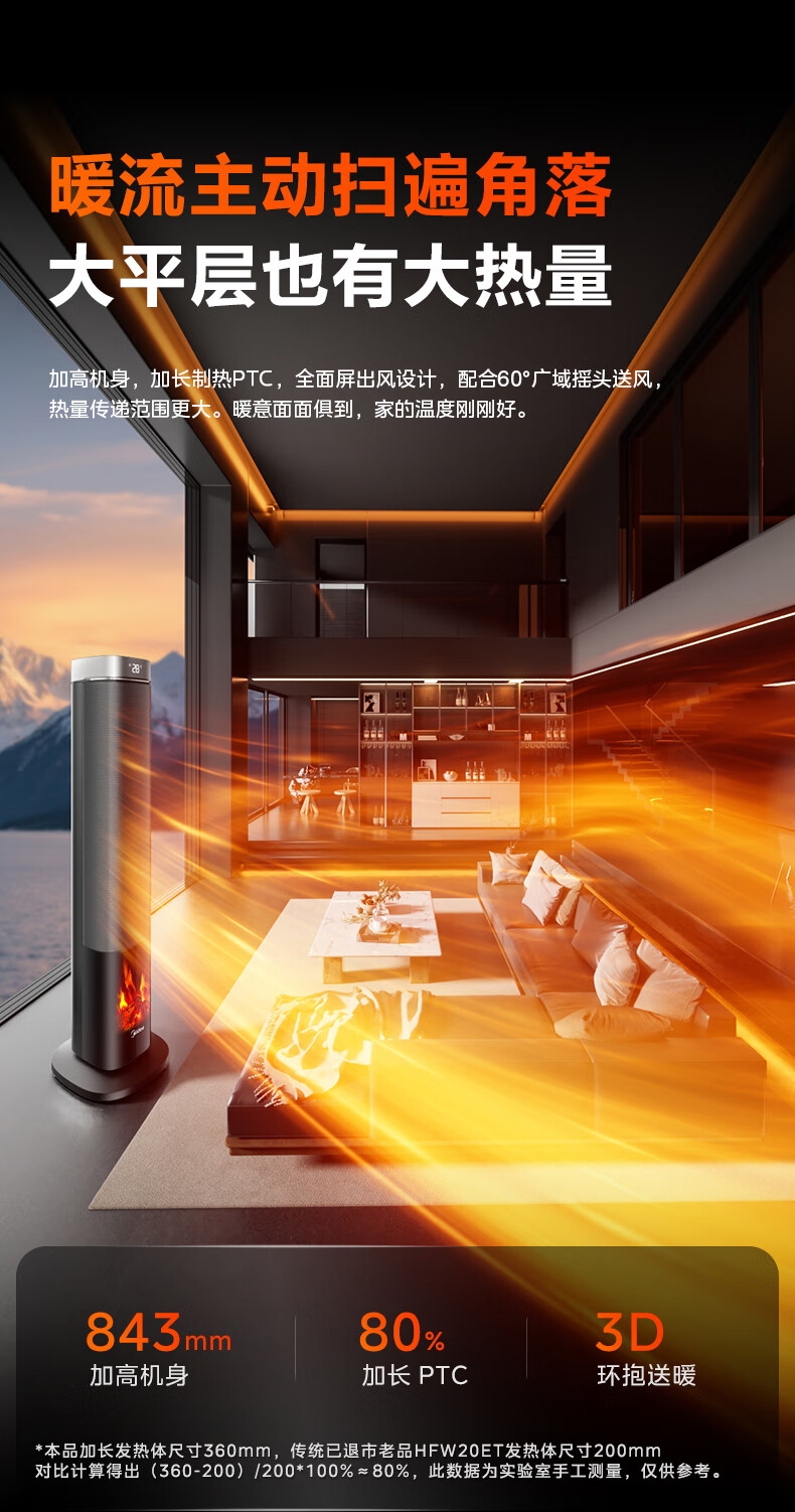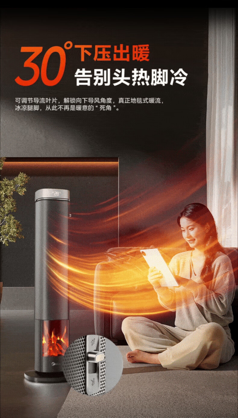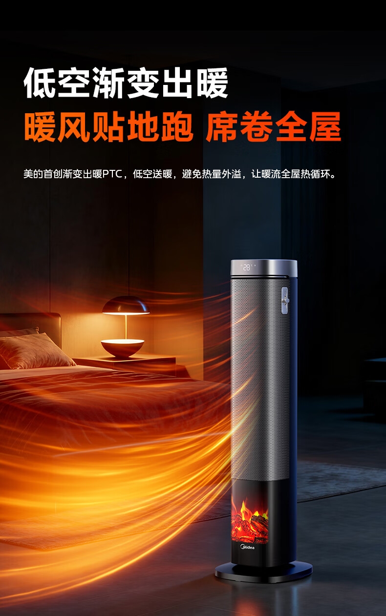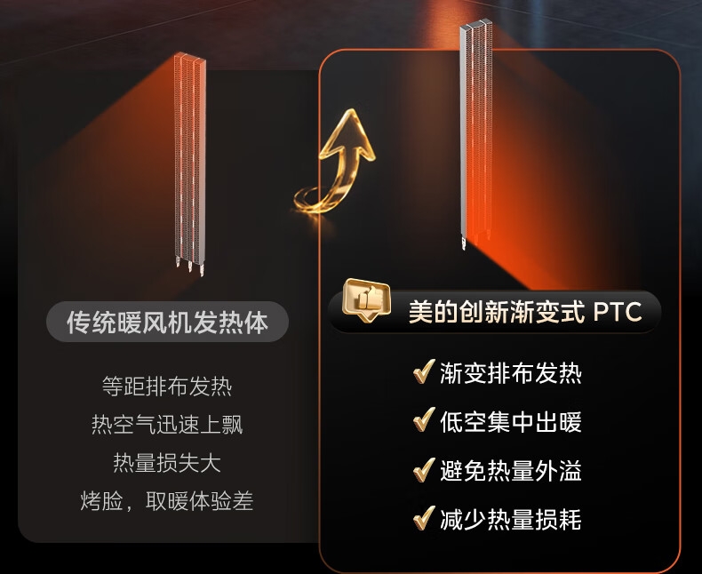 采用高效PTC陶瓷发热技术,升温迅速,暖意即刻环绕;220V家用电压设计,节能省电,呵护每一度电;耀石黑外观,简约大气,融入多种家居风格