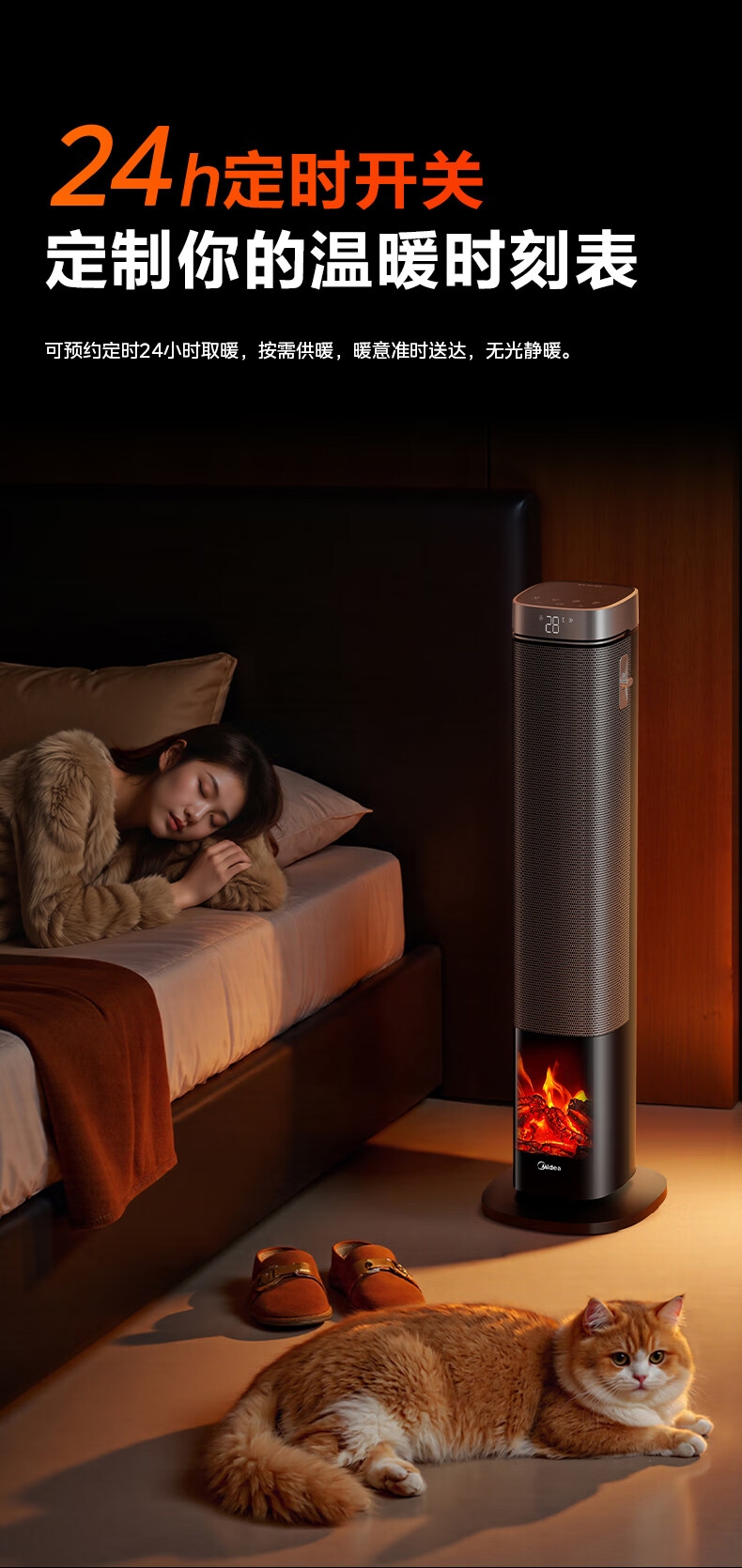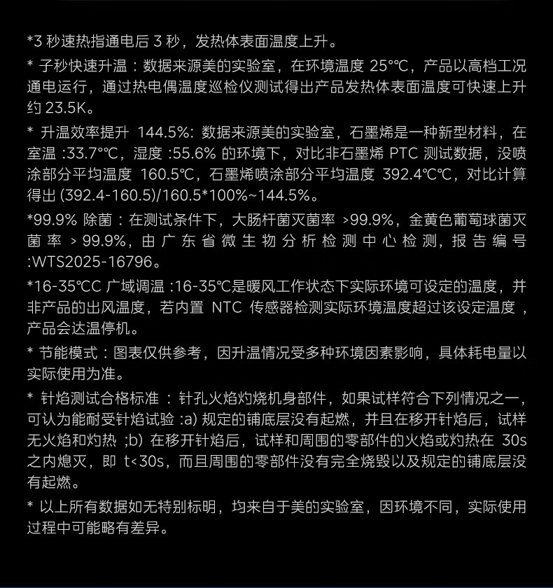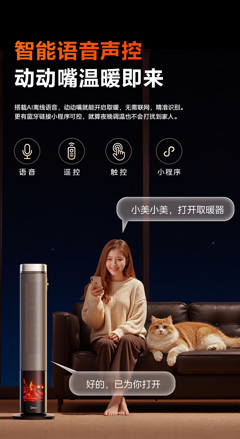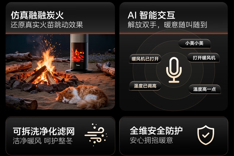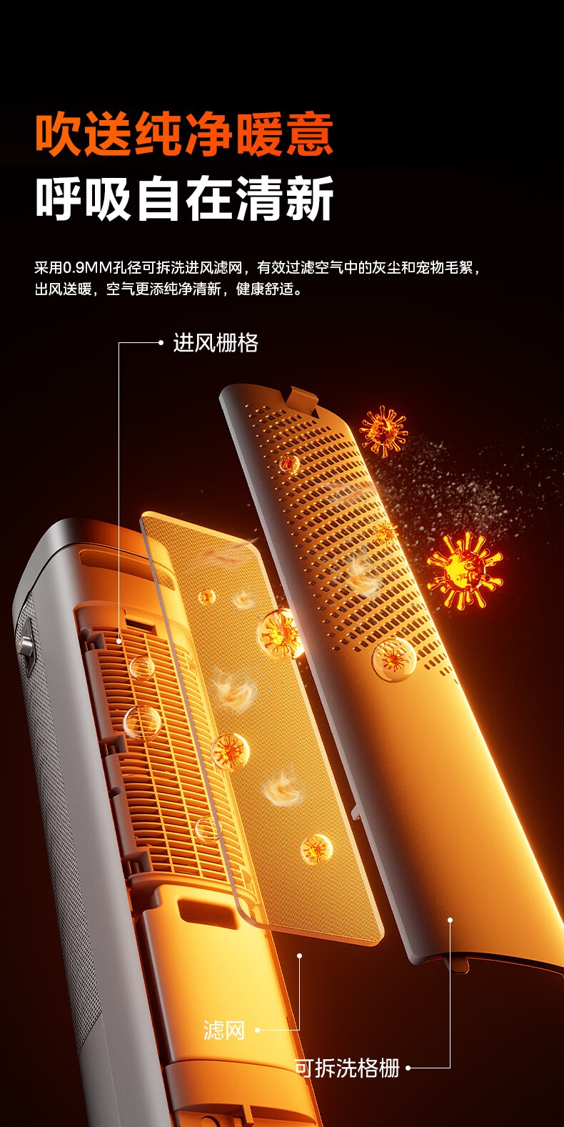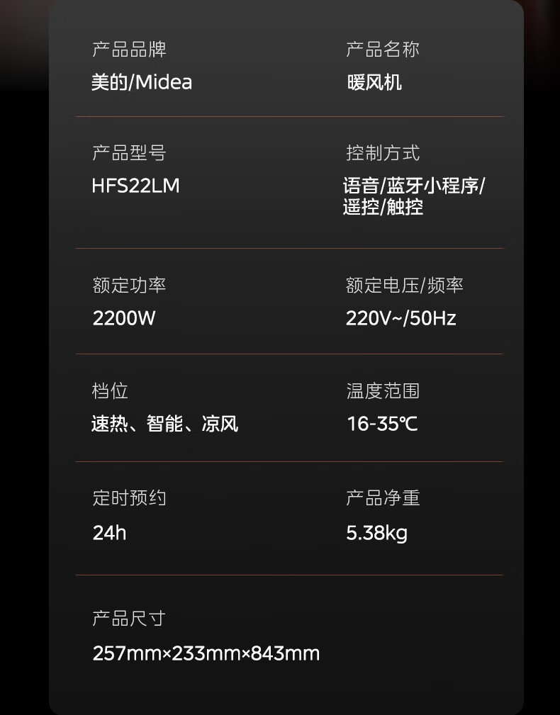 采用高效PTC陶瓷发热技术,升温迅速,暖意即刻环绕;220V家用电压设计,节能省电,呵护每一度电;耀石黑外观,简约大气,融入多种家居风格