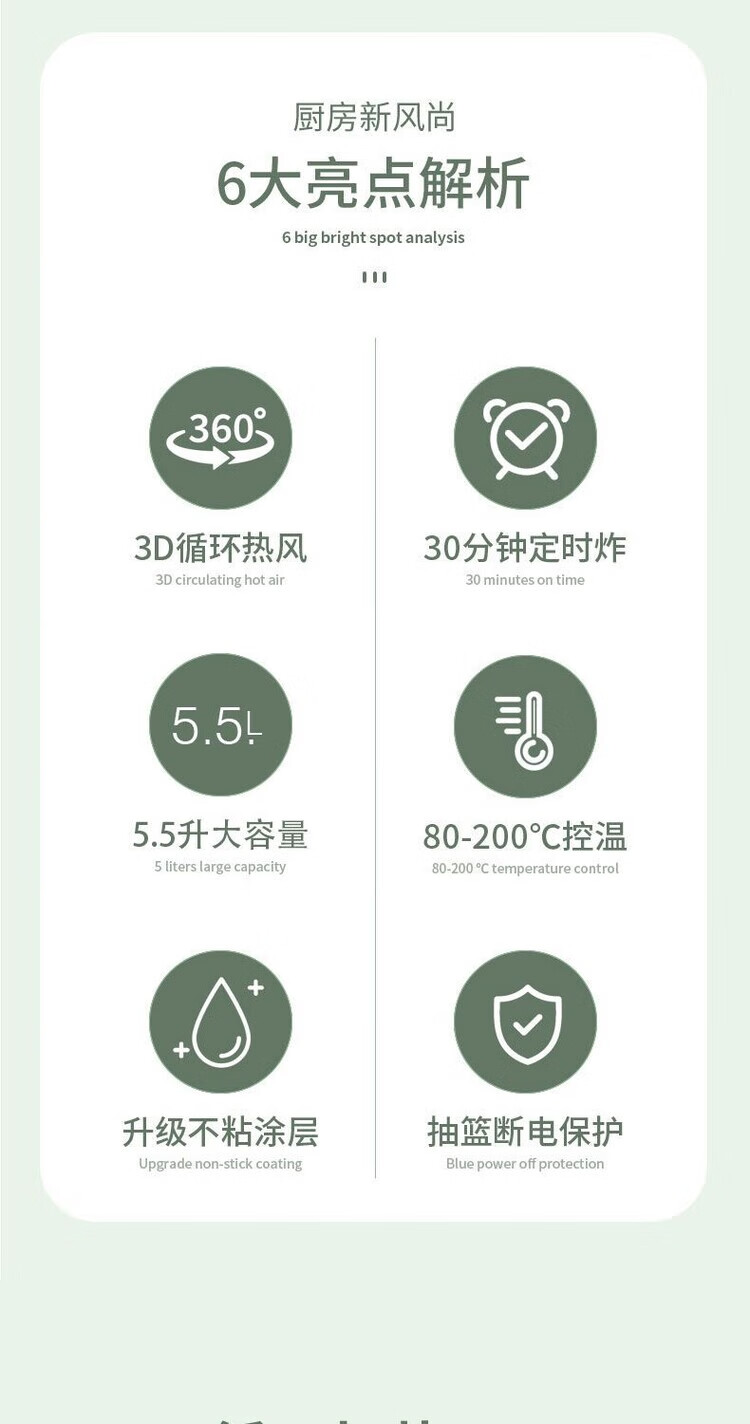 一锅专用,具有煎,炸,烘,烤等多种功能;安全无异味,清洗方便;透明可视设计,随时掌握食材在煎、烤时情况