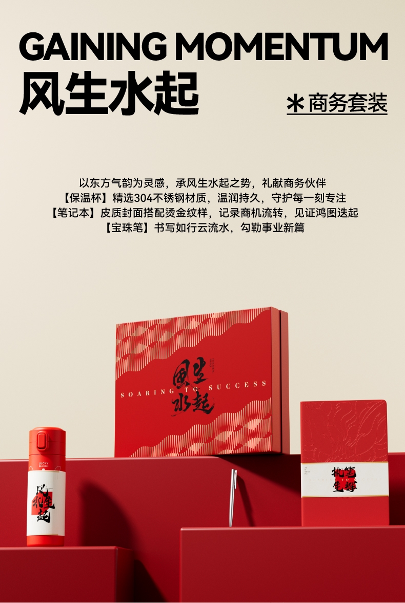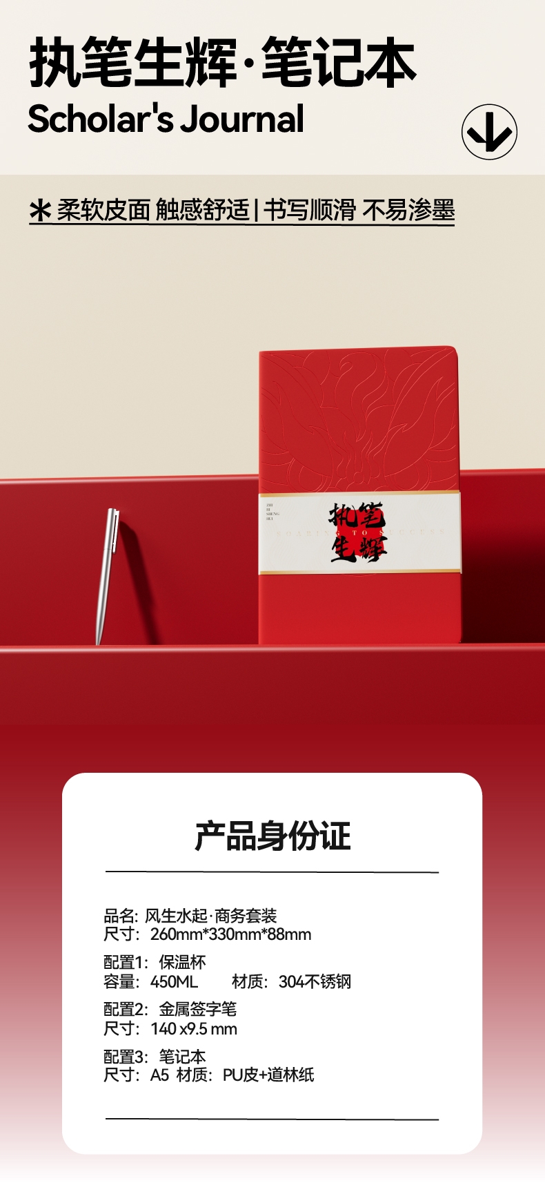 保温杯304不锈钢材质,温润持久,守护每一刻专注;笔记本皮质封面搭配烫金纹样;宝珠笔书写如行云流水,勾勒事业新篇