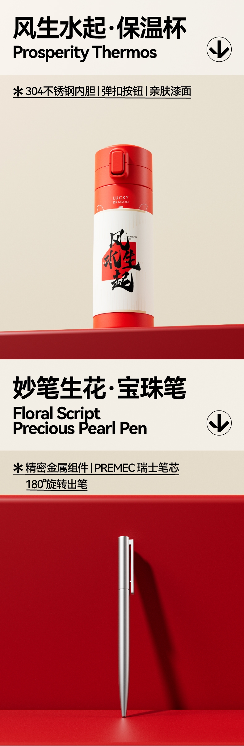 配置清单:配置1:风生水起·保温杯 材质:304 容量:450ml 配置2:妙笔生花·宝珠笔 配置3:执笔生辉·笔记本 尺寸:A5左右大小