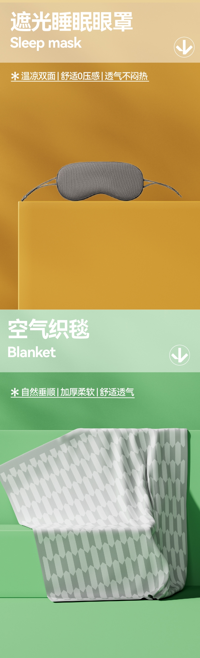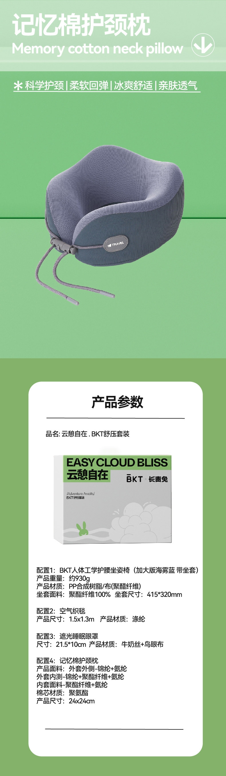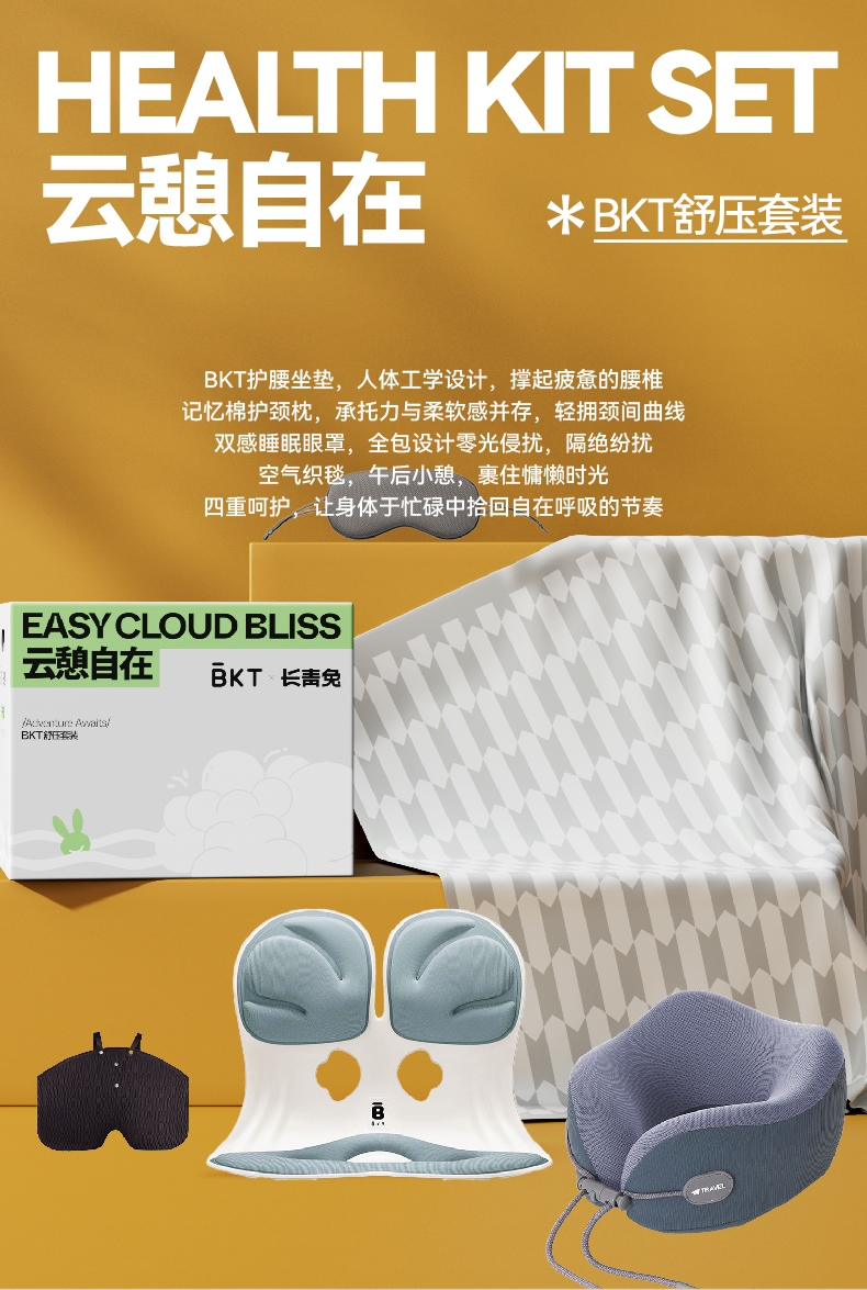 BKT护腰坐垫,人体工学设计,撑起疲惫的腰椎;记忆棉护颈枕,承托力与柔软感并存,轻拥颈间曲线;空气织毯,午后小憩,裹住慵懒时光