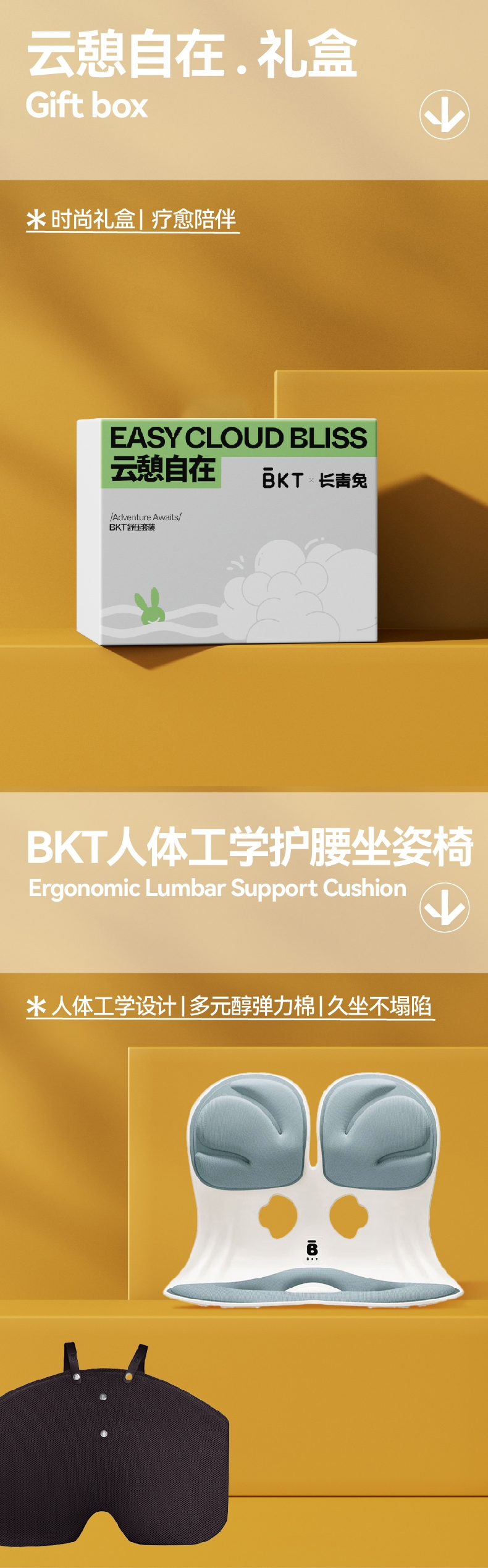 配置清单:礼盒X 1、BKT人体工学护腰坐姿椅X 1(带座套)X 1、空气织毯X 1、记忆棉护颈枕X 1、双感全包睡眠眼罩X 1