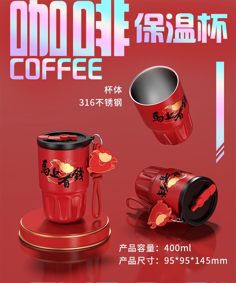 配置清单:零食水果篮 * 1 马上有钱-新春保温咖啡杯 * 1 咖啡杯装饰挂绳 * 1 60瓦快充双C线/手机背带绳 * 1 小马大富抽纸盒*1