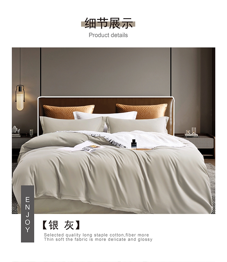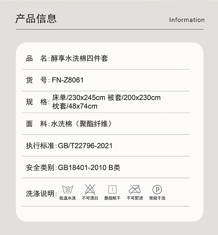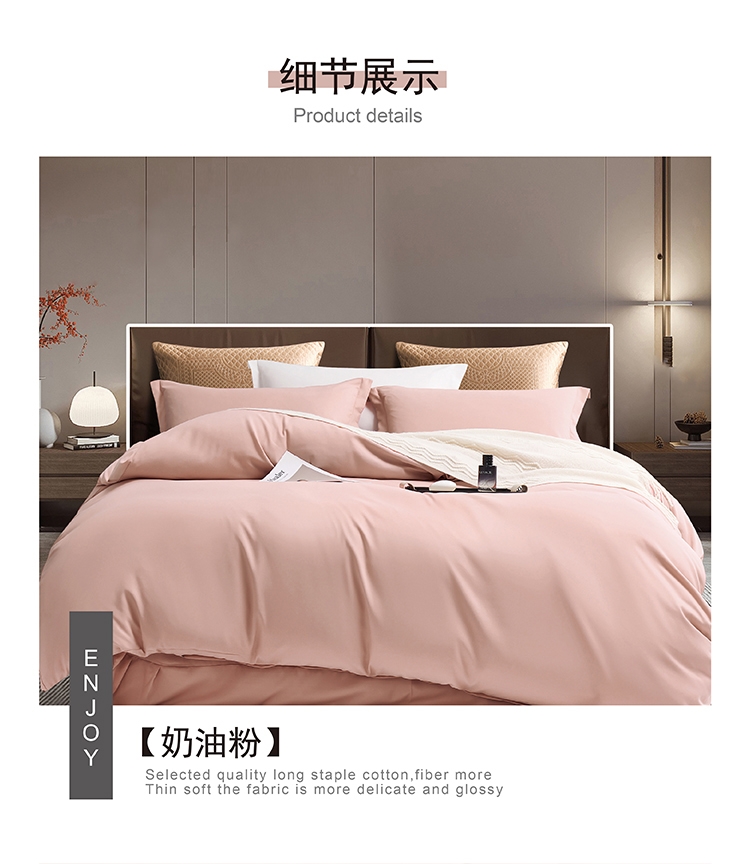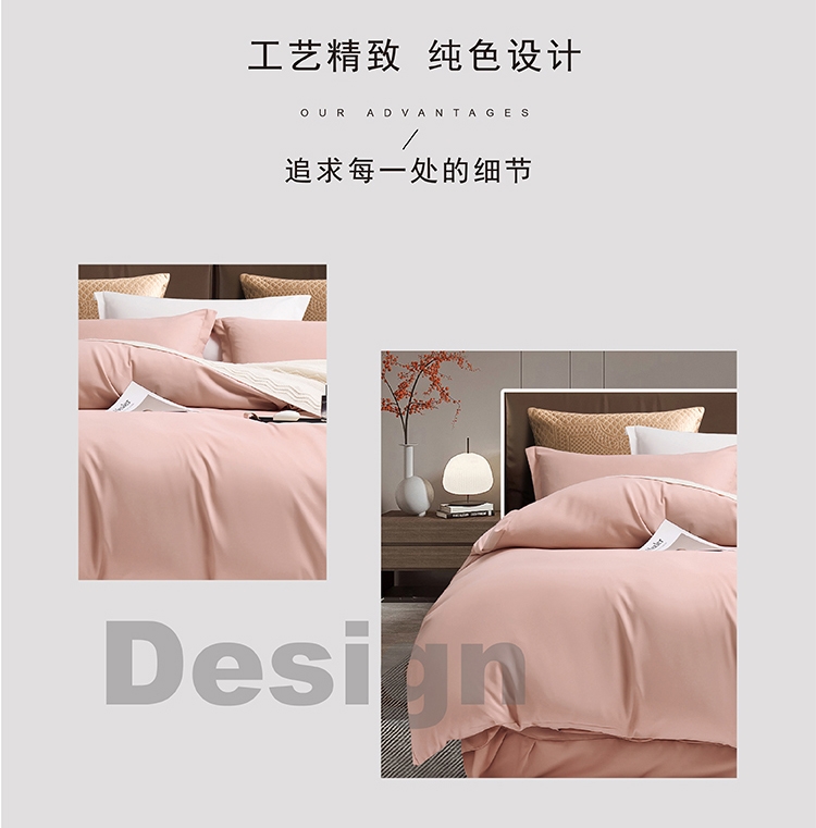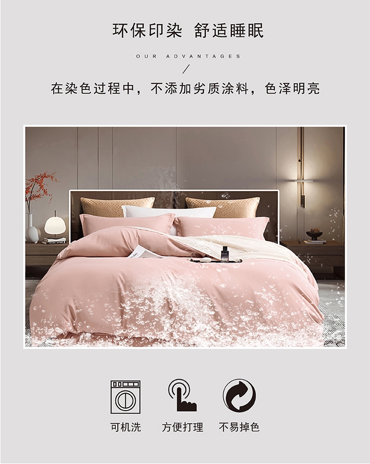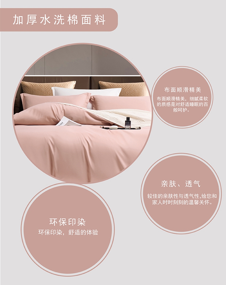 加厚水洗棉绒面料,细密紧实,吸湿透气;经典纯色设计,适合不同家居风格;锁边内缝式被套,圆角贴边床单,工艺精致