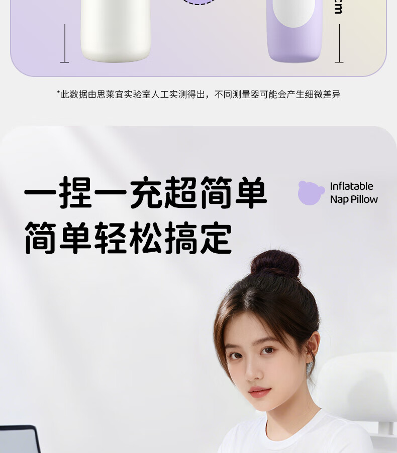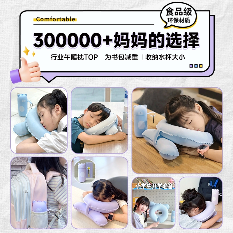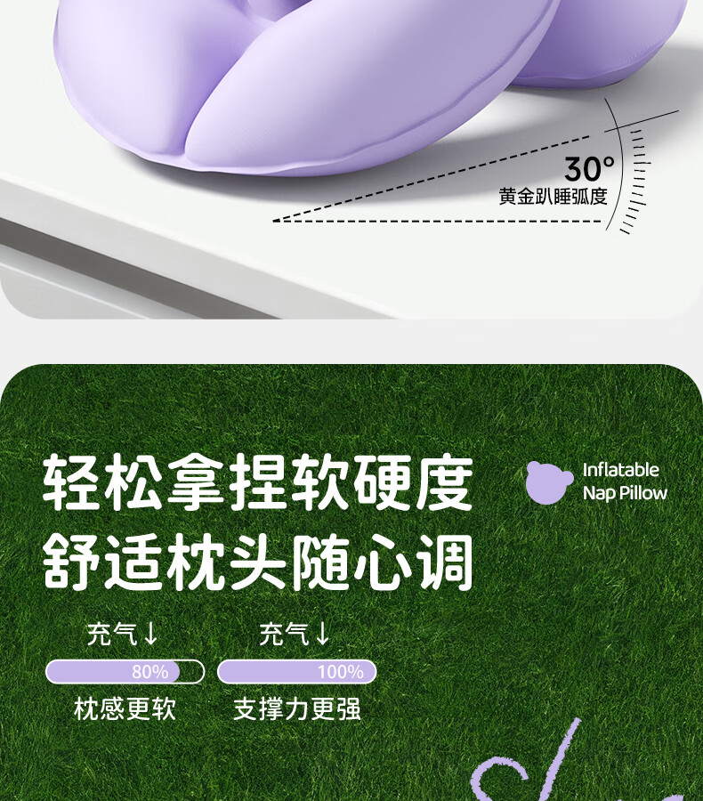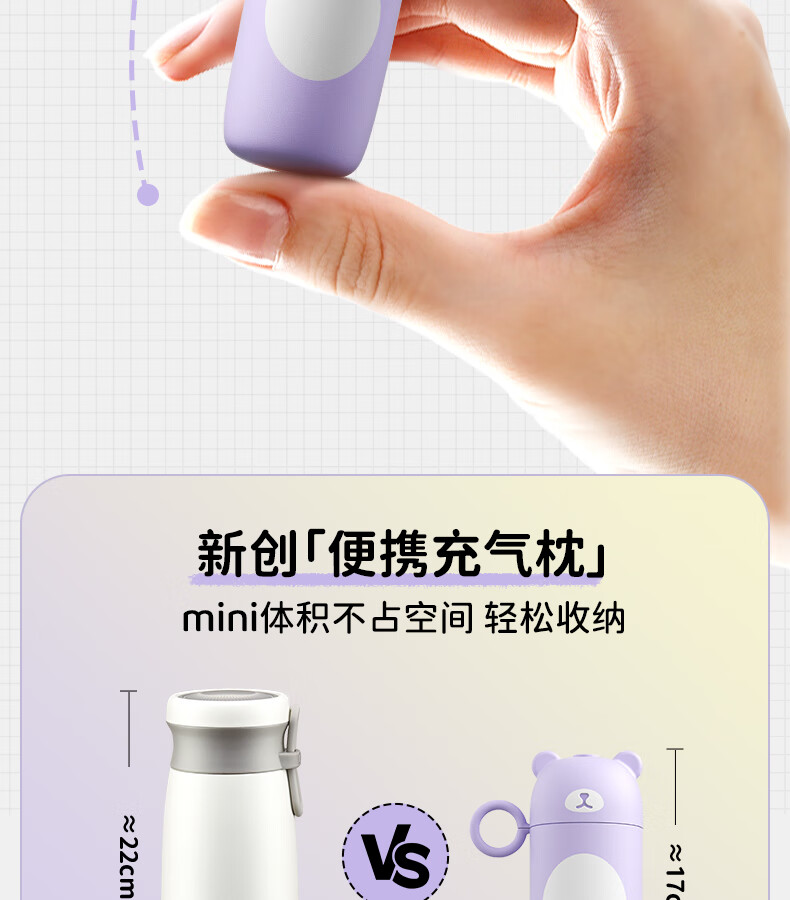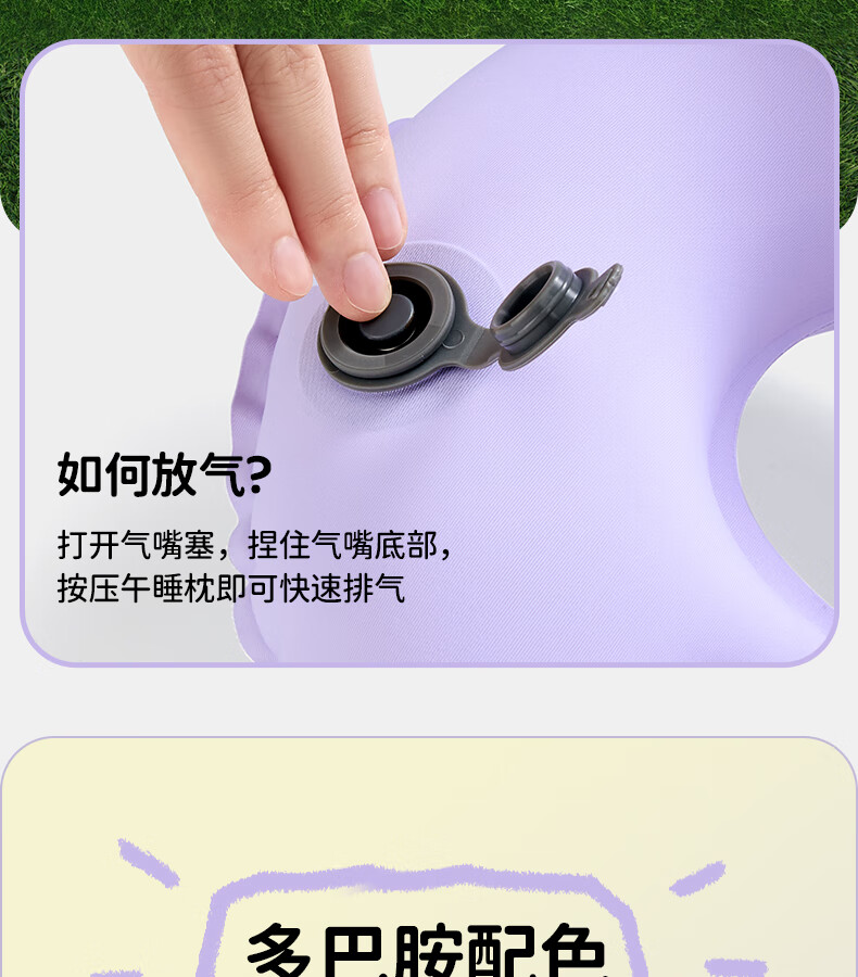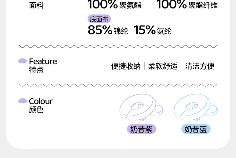 材质轻盈,充气后弹性支撑便携设计;双层面料牛奶丝绒面层软糯细腻;防水内胆口水汗渍一擦即净