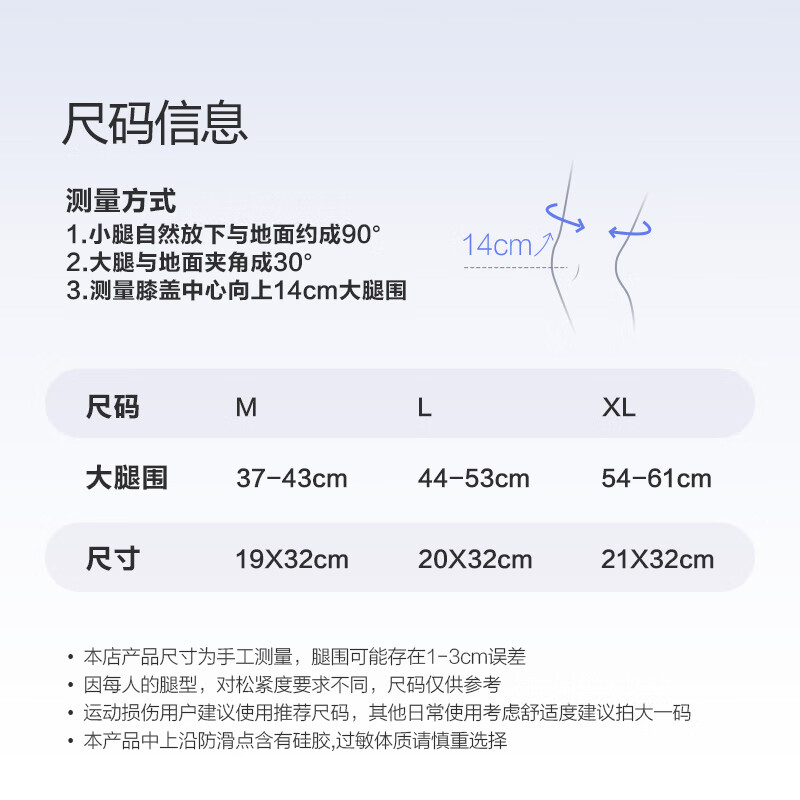 尺寸:M码:19*32cm 腿围37-43cm L码:20*32cm 腿围44-52cm XL码:21*32cm 腿围53-61cm