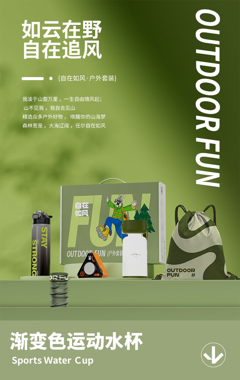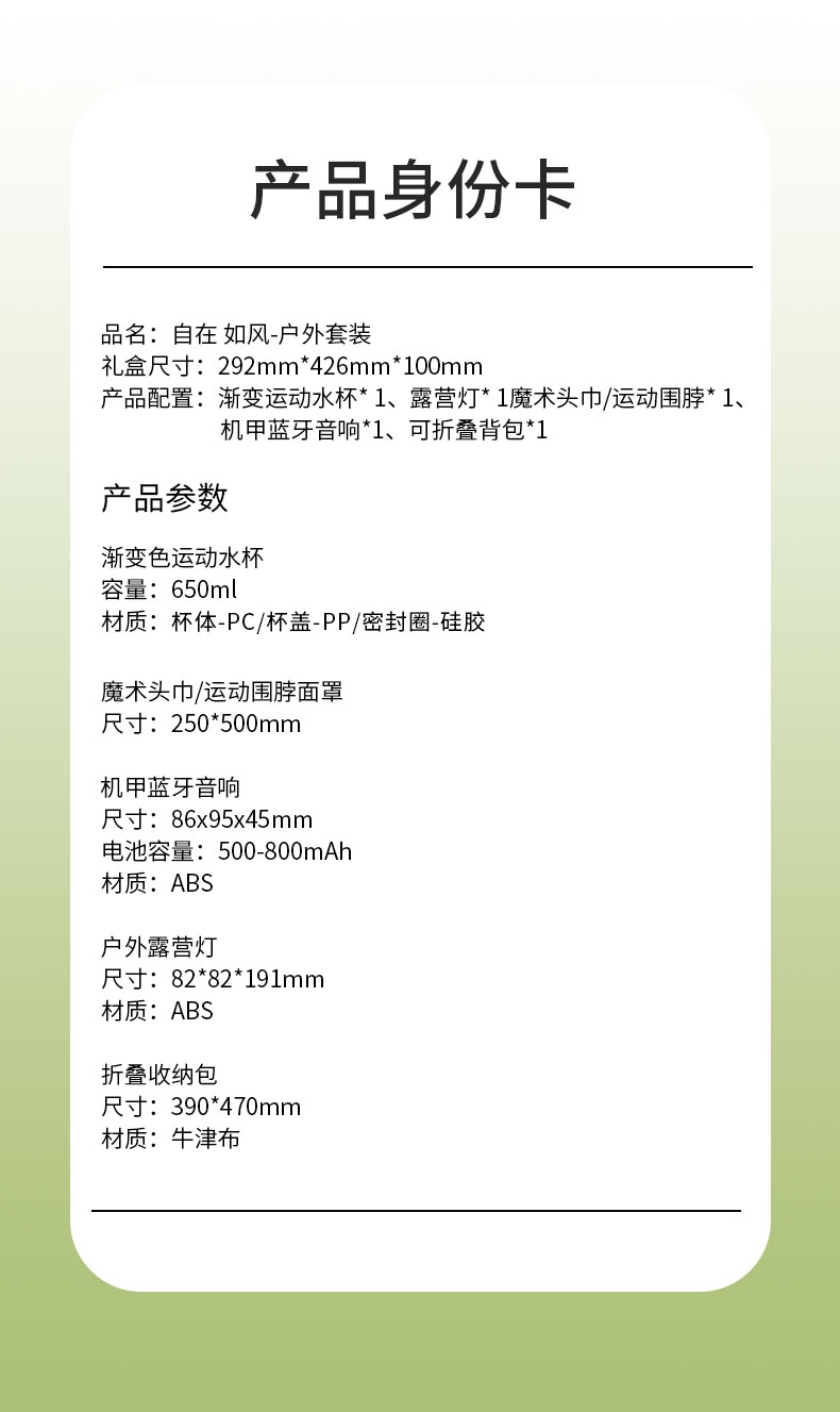 配置清单:渐变运动水杯* 1、露营灯* 1 魔术头巾/运动围脖* 1、机甲蓝牙音响*1 可折叠背包*1、精美礼盒* 1