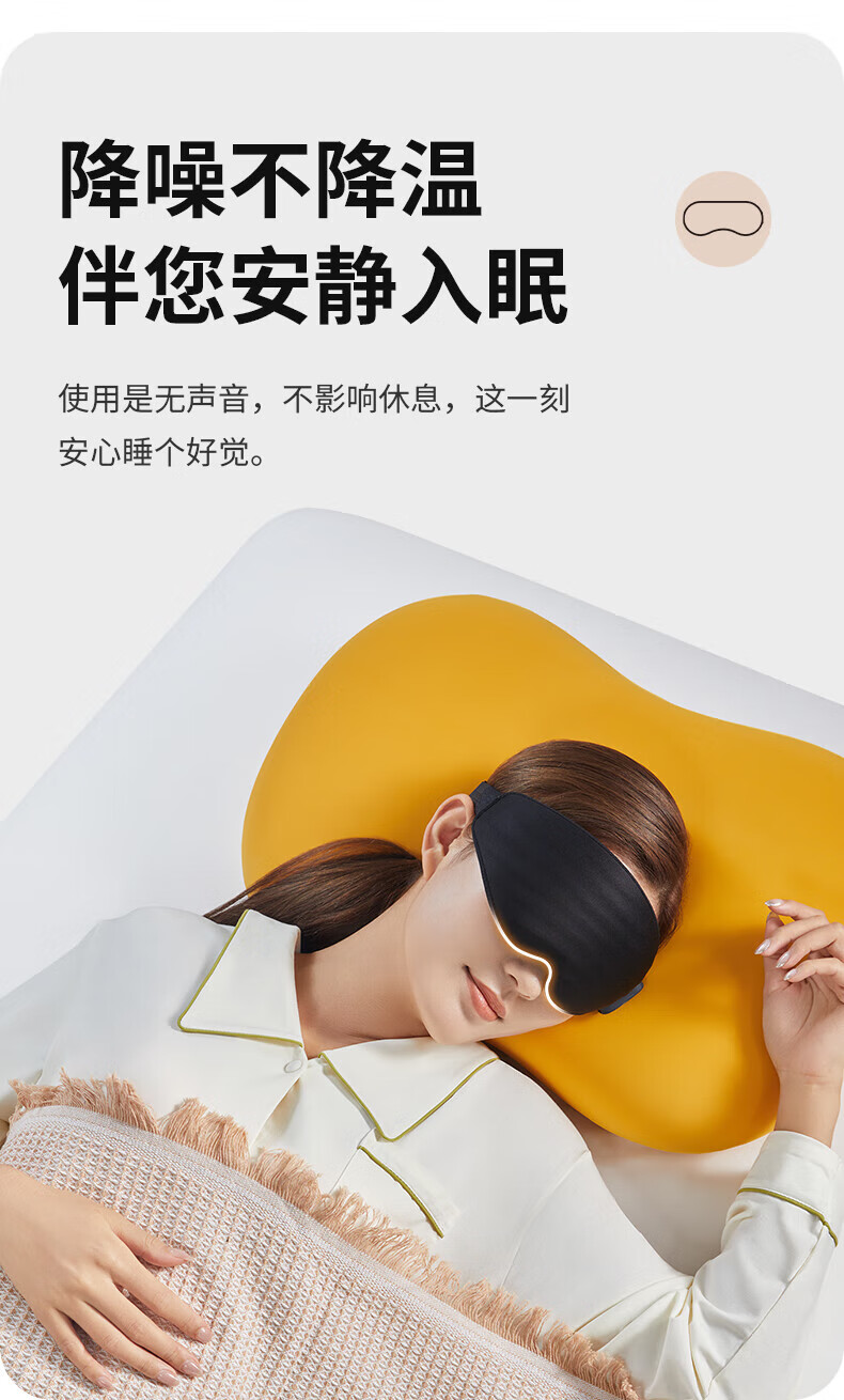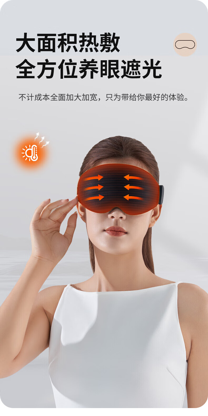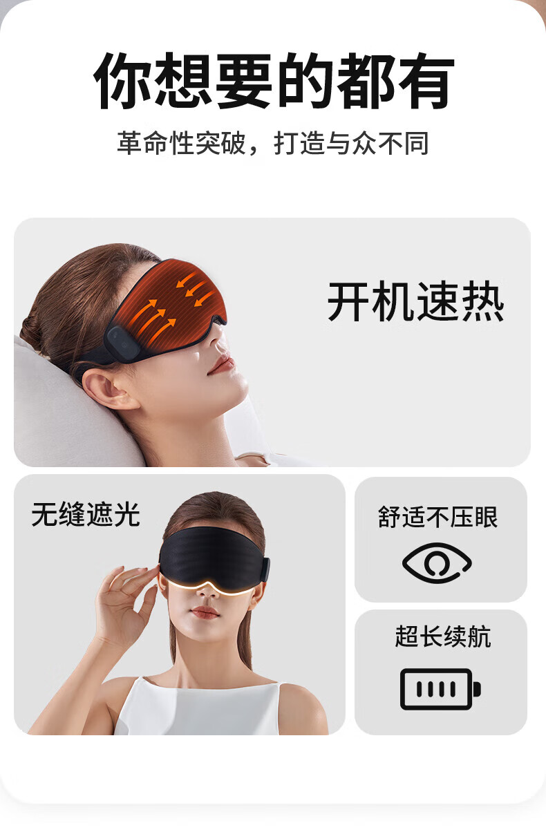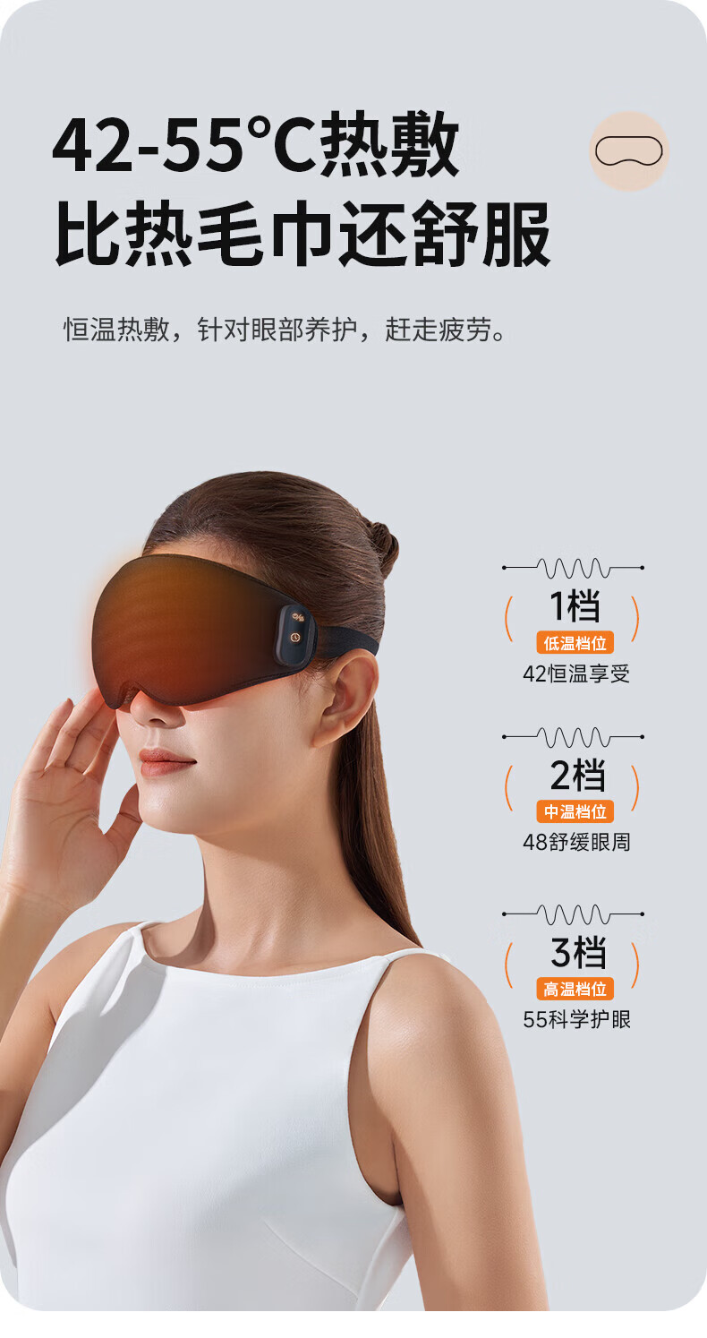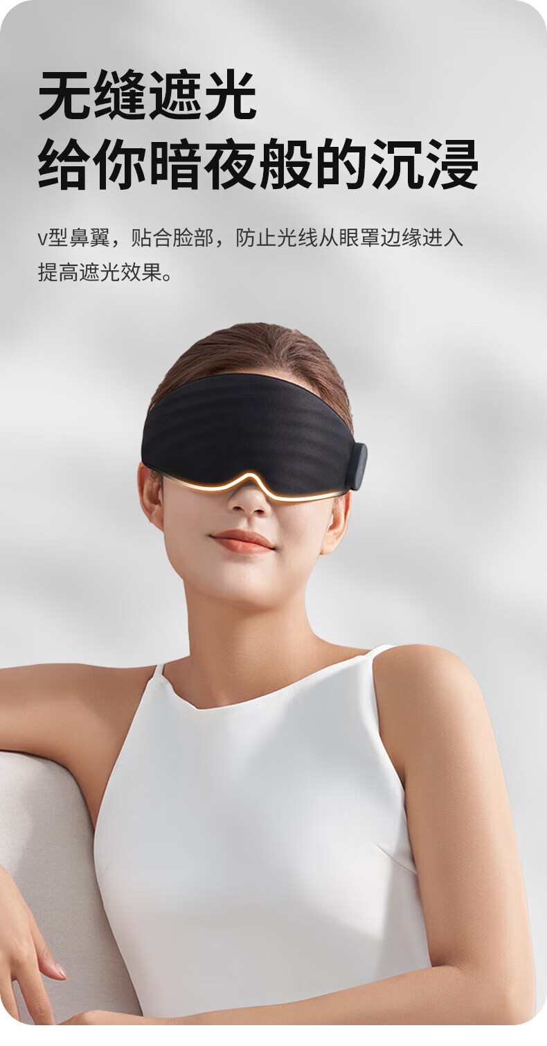 鼻翼V型设计,遮光无缝隙,舒适不压眼;可调(42/48/55℃)恒温热敷,赶走疲劳;侧睡不压耳,适用各种头围