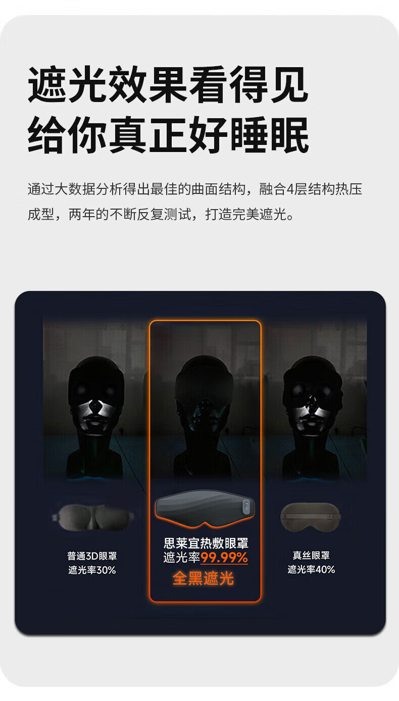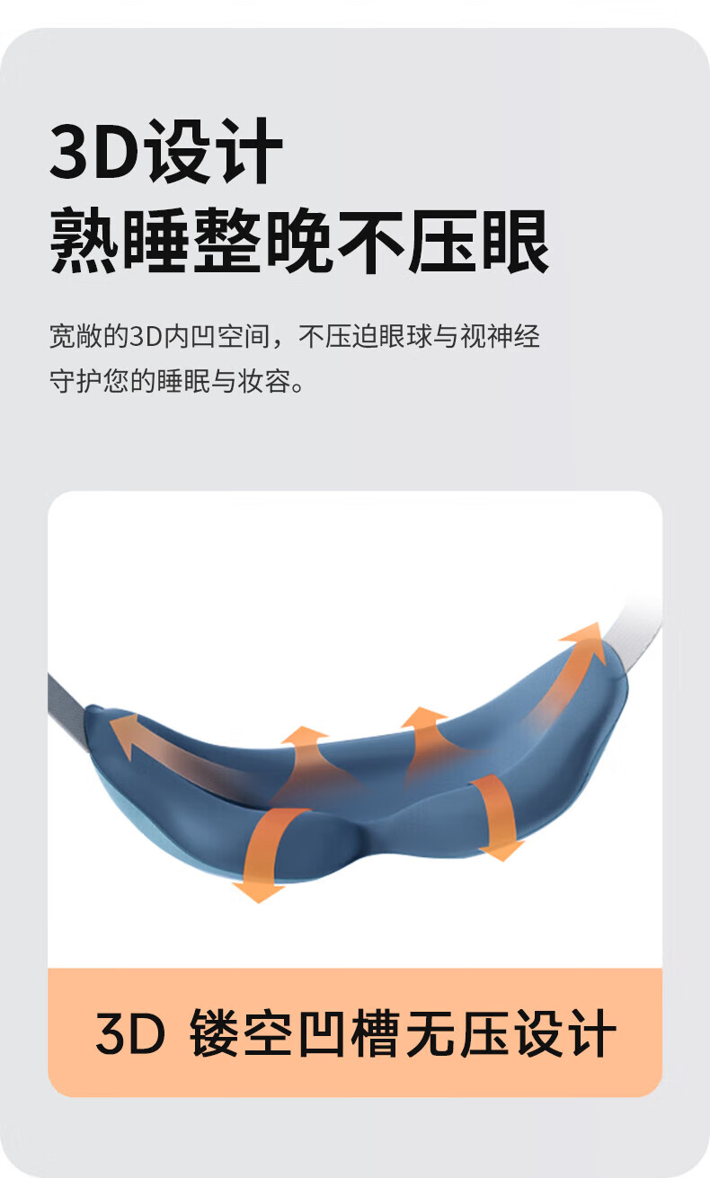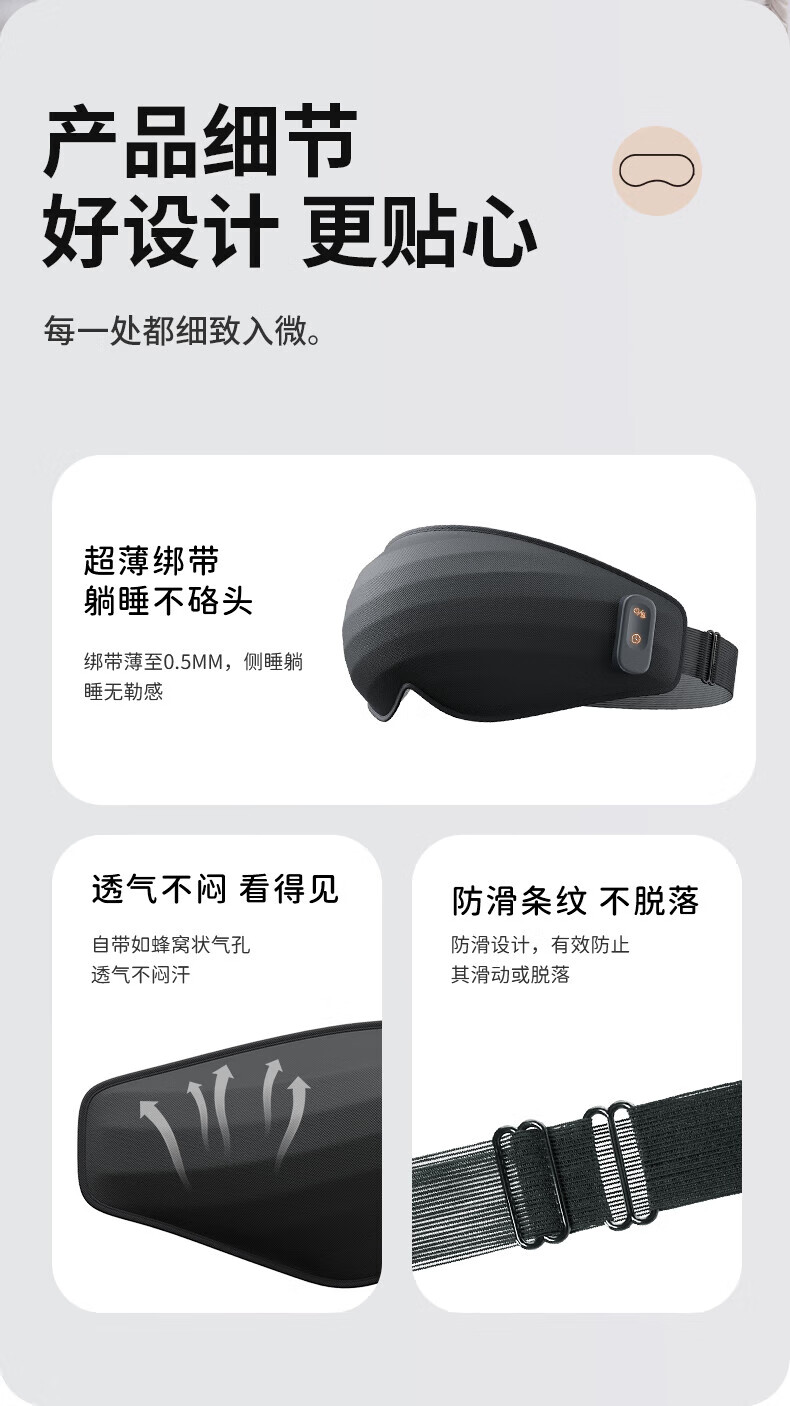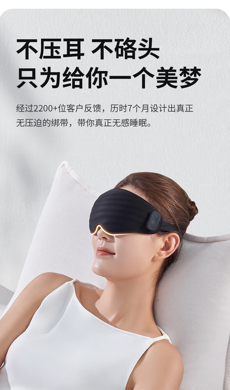 鼻翼V型设计,遮光无缝隙,舒适不压眼;可调(42/48/55℃)恒温热敷,赶走疲劳;侧睡不压耳,适用各种头围
