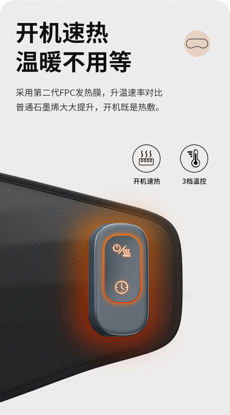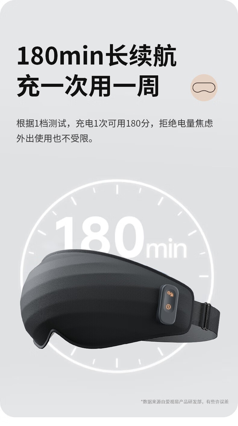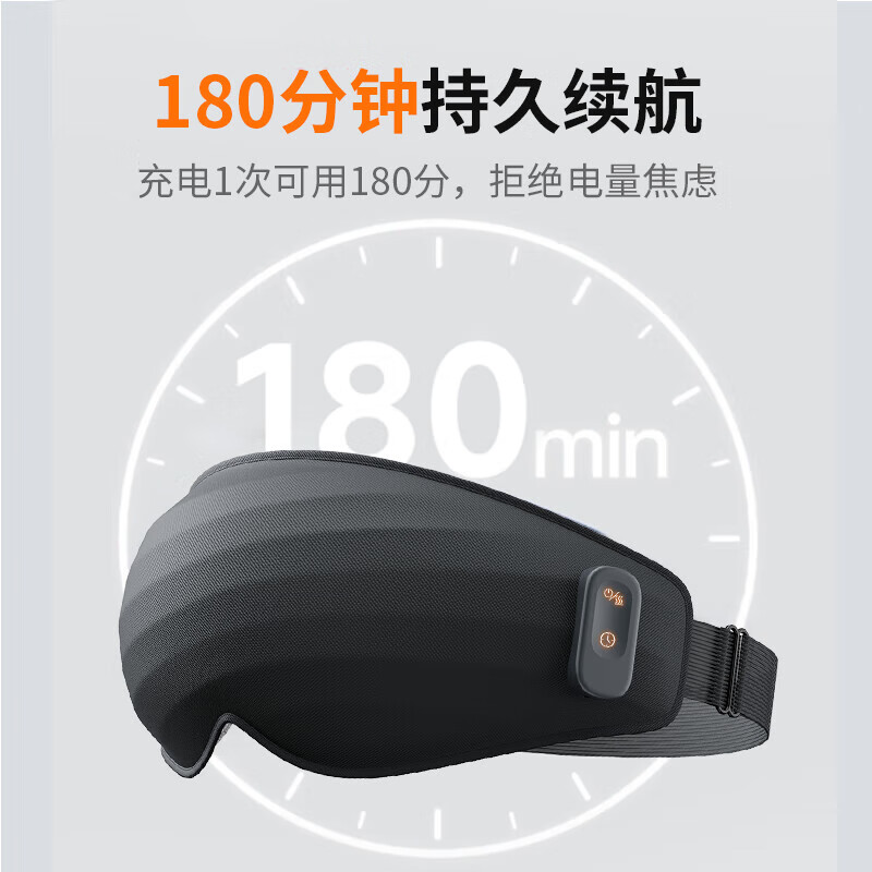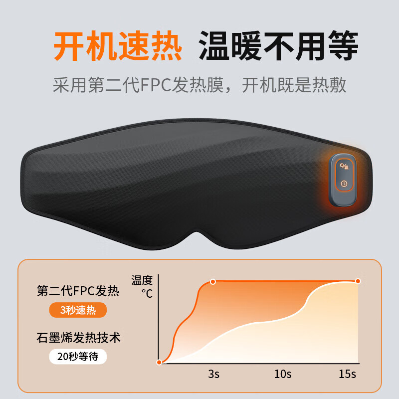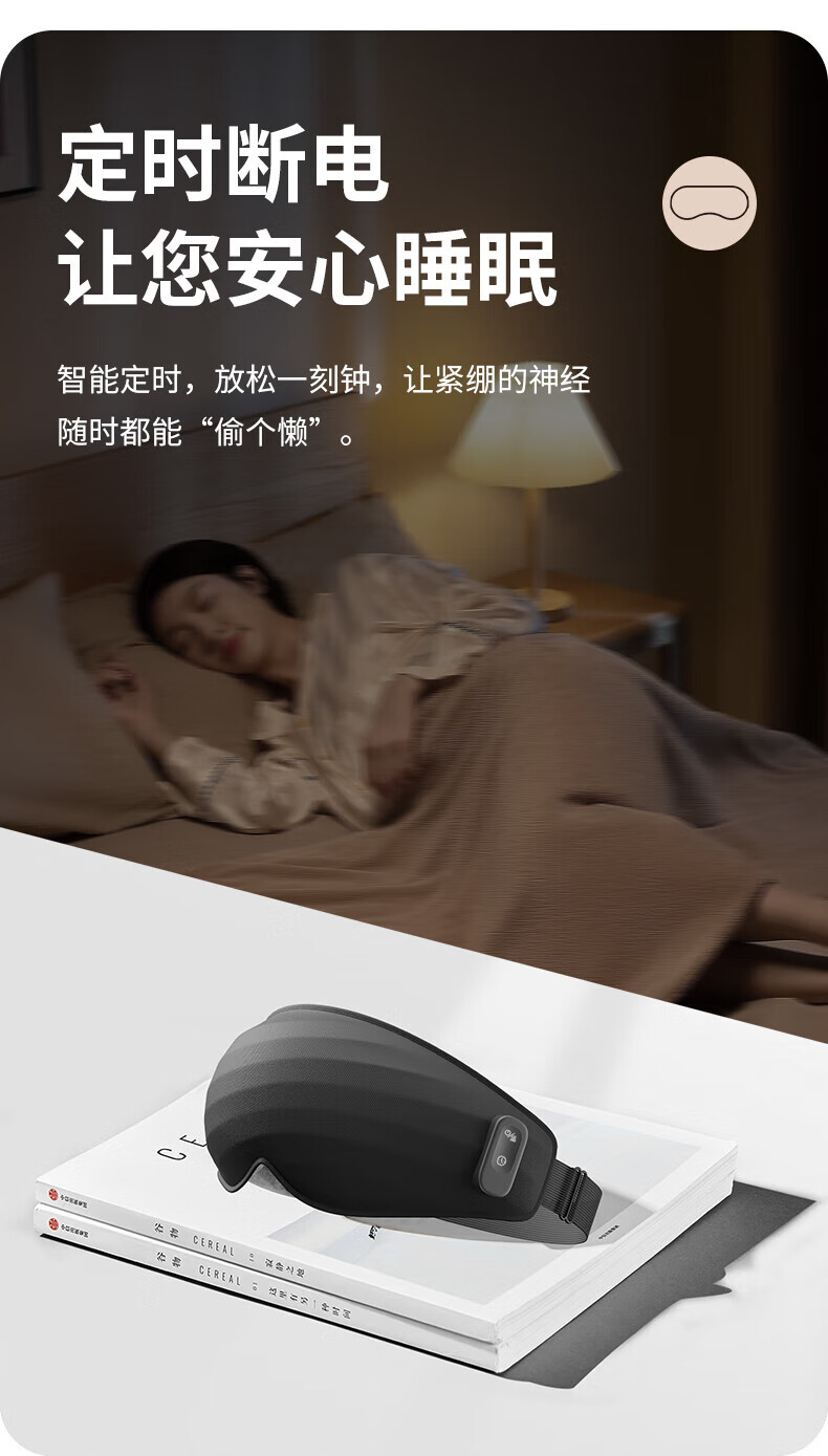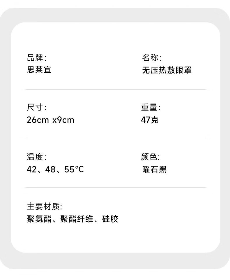 鼻翼V型设计,遮光无缝隙,舒适不压眼;可调(42/48/55℃)恒温热敷,赶走疲劳;侧睡不压耳,适用各种头围