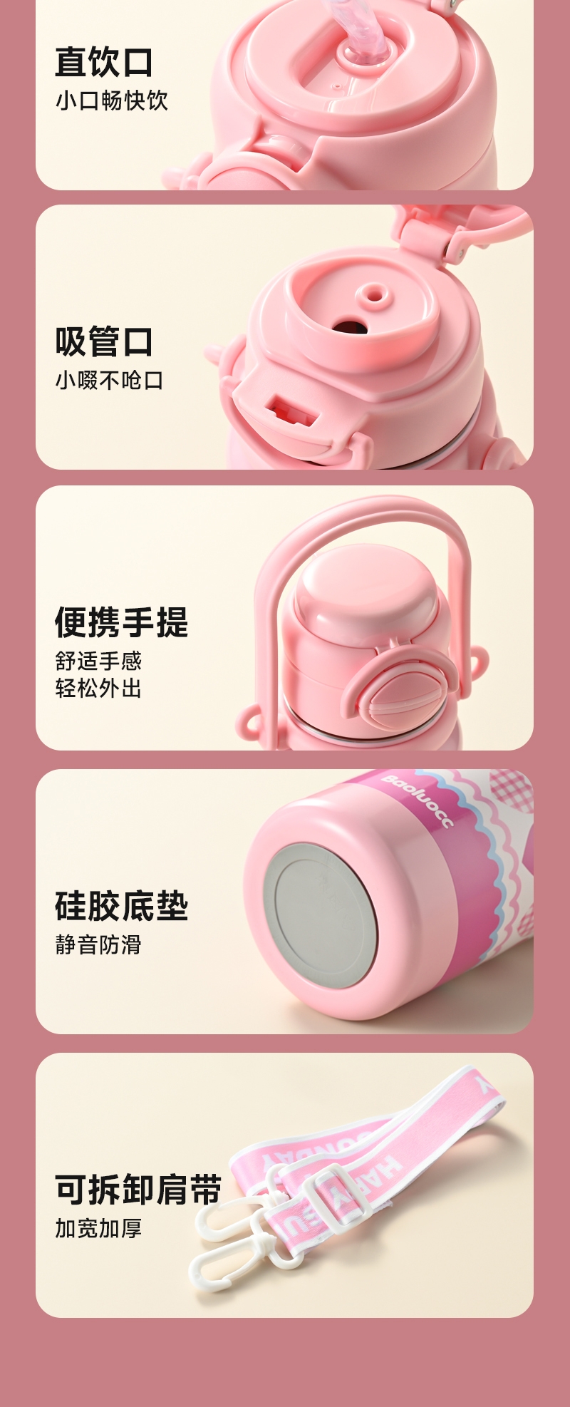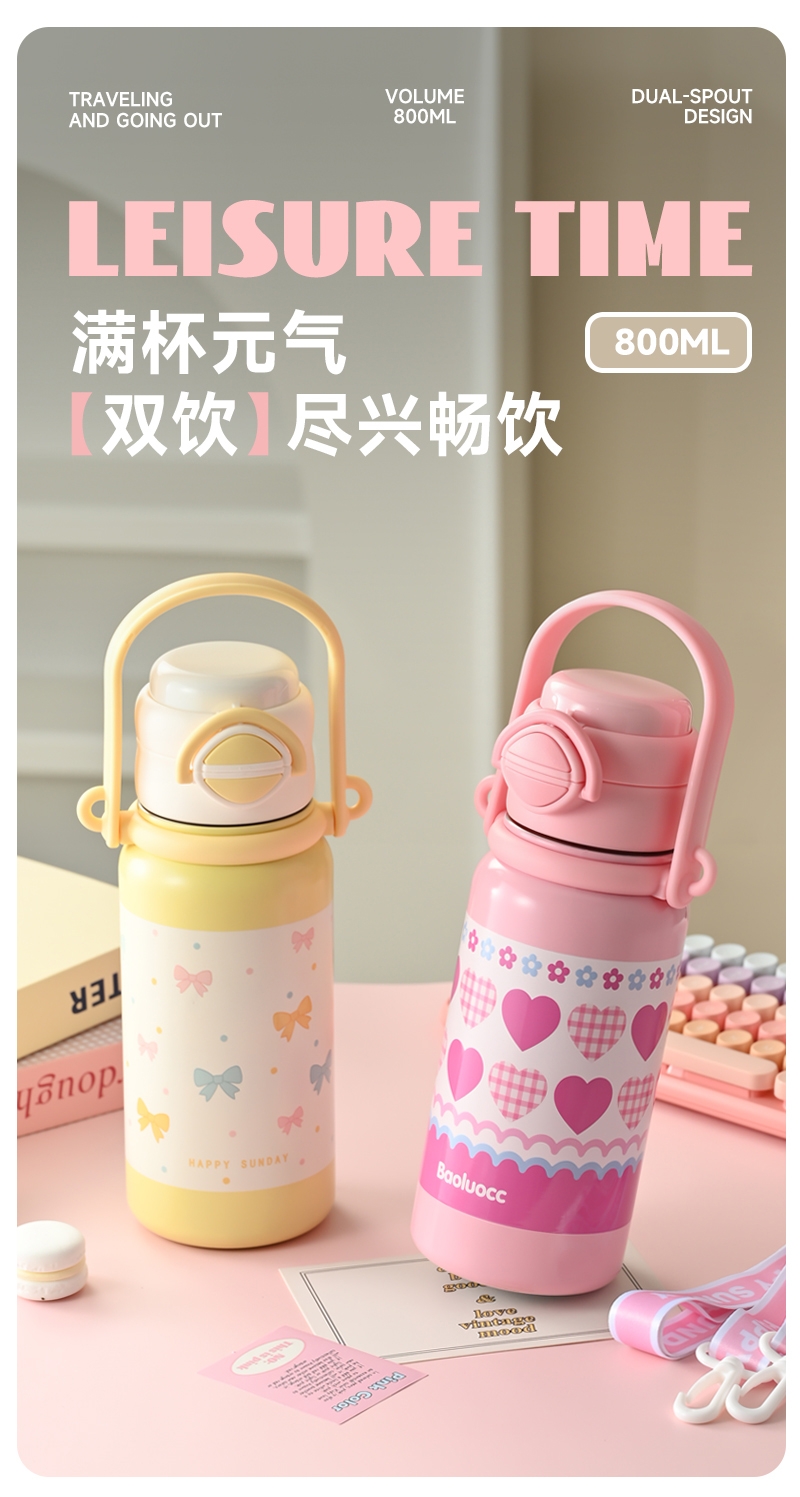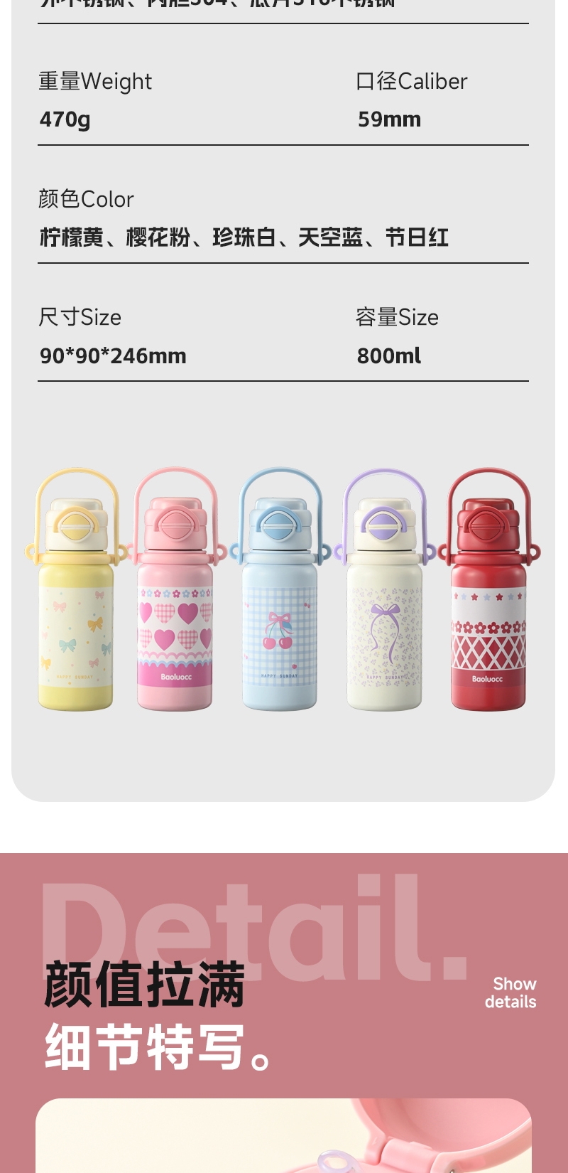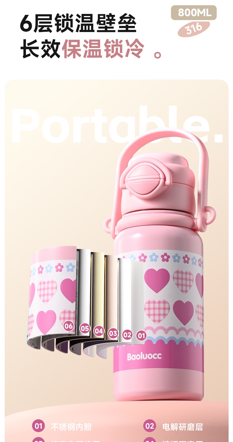 800ml大容量,满足一天饮水需求;316不锈钢内胆,安全又放心;便携手提,硅胶底座