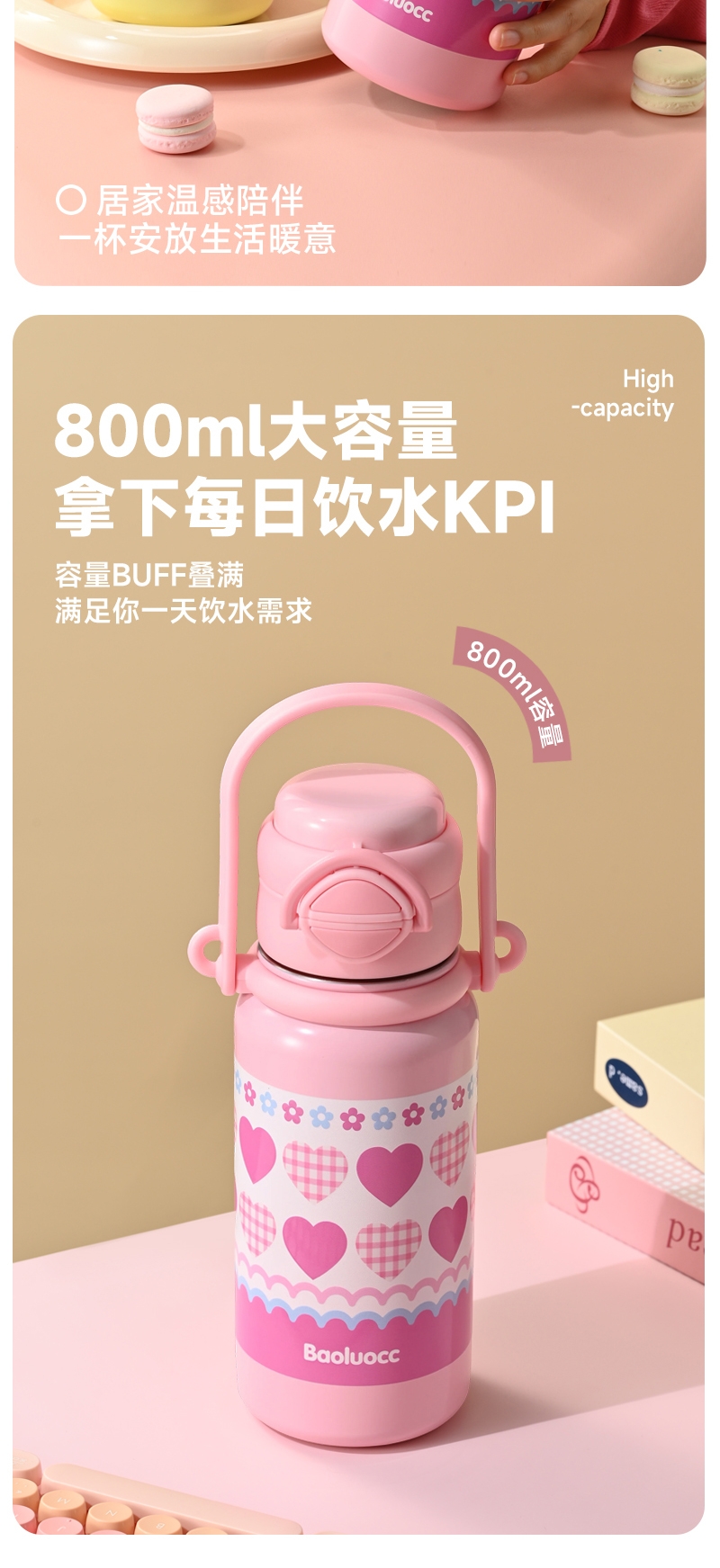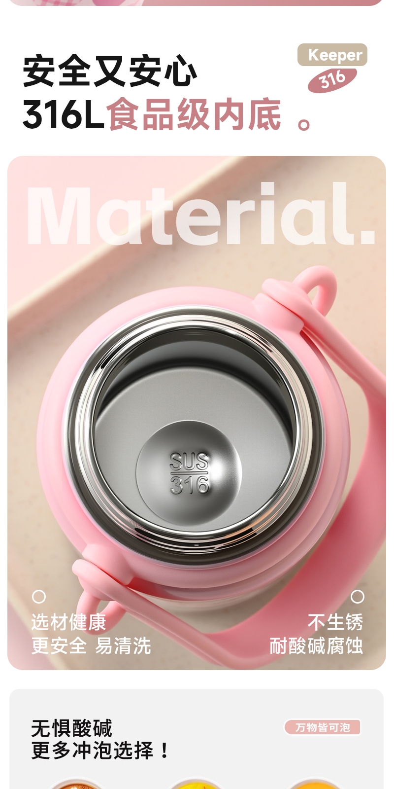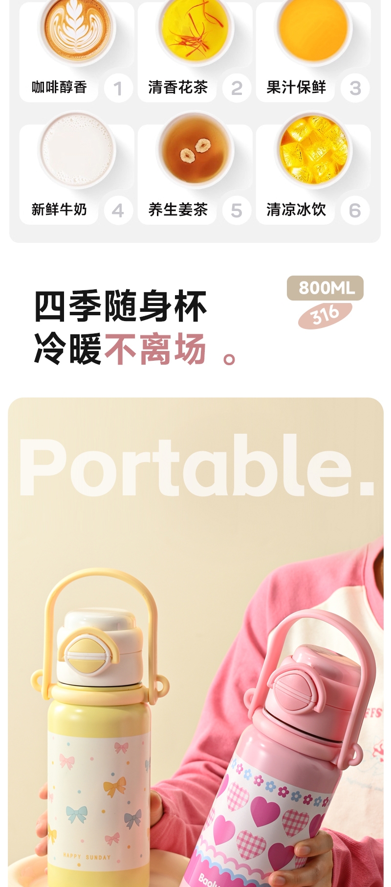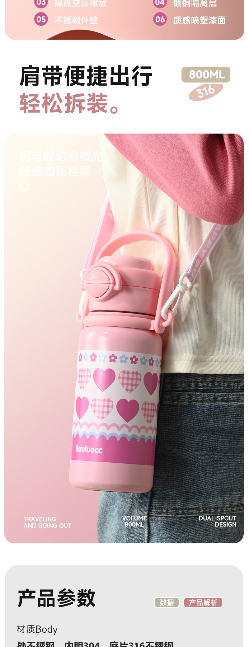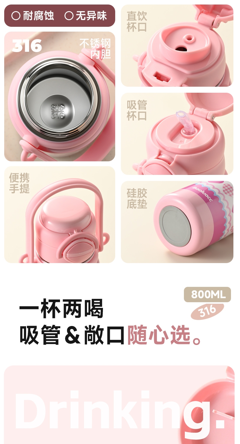 316不锈钢内胆,安全又放心;便携手提,硅胶底座;800ml大容量,满足一天饮水需求
