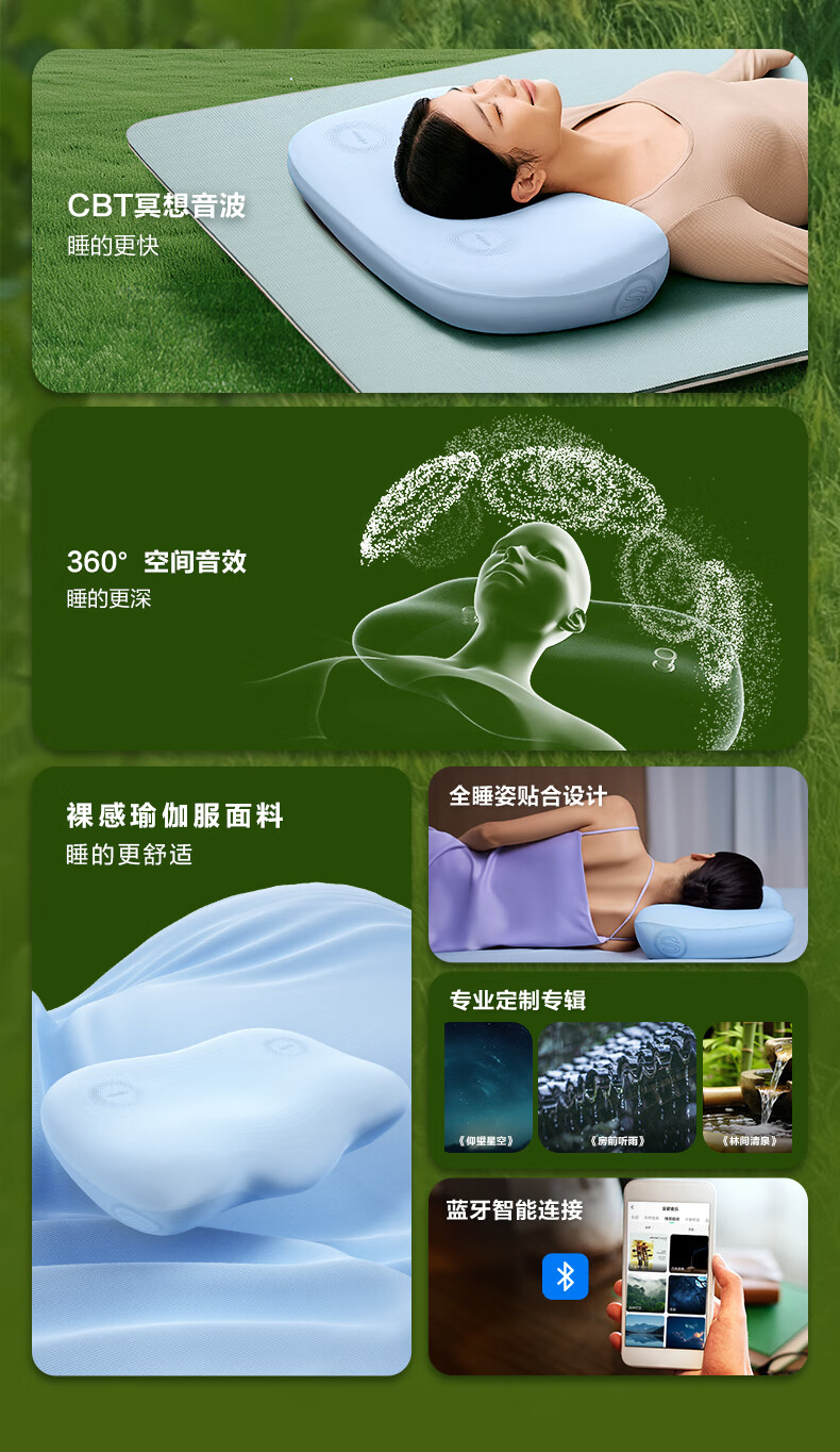 仰睡低,颈椎承托;侧睡垫高;空间沉浸音响;复合凉爽面料