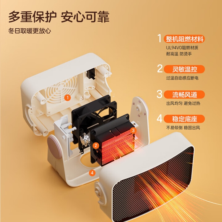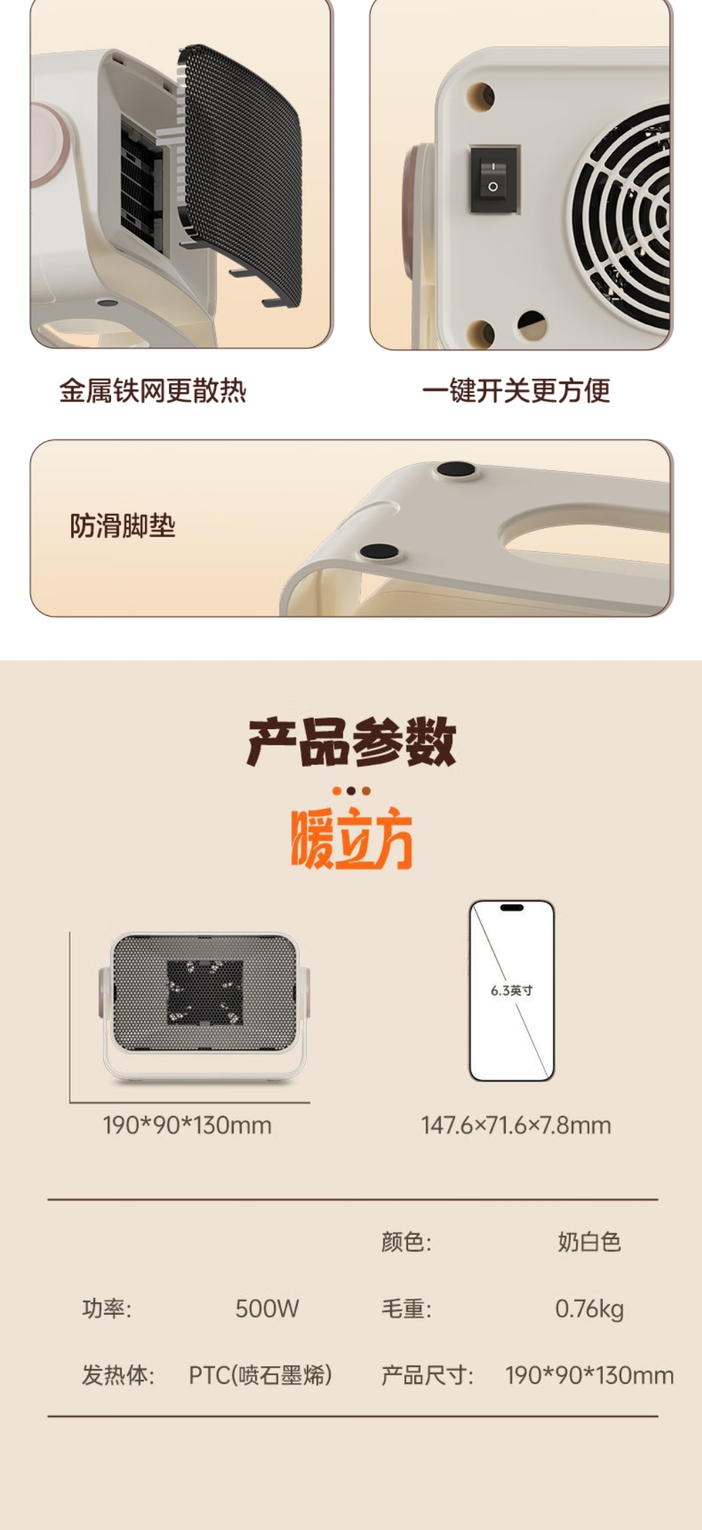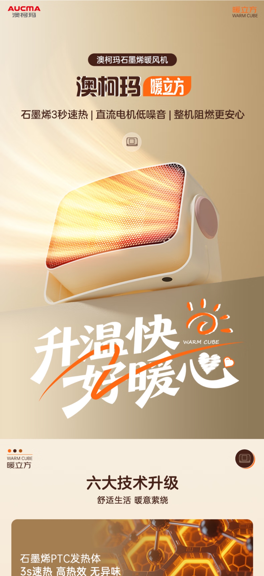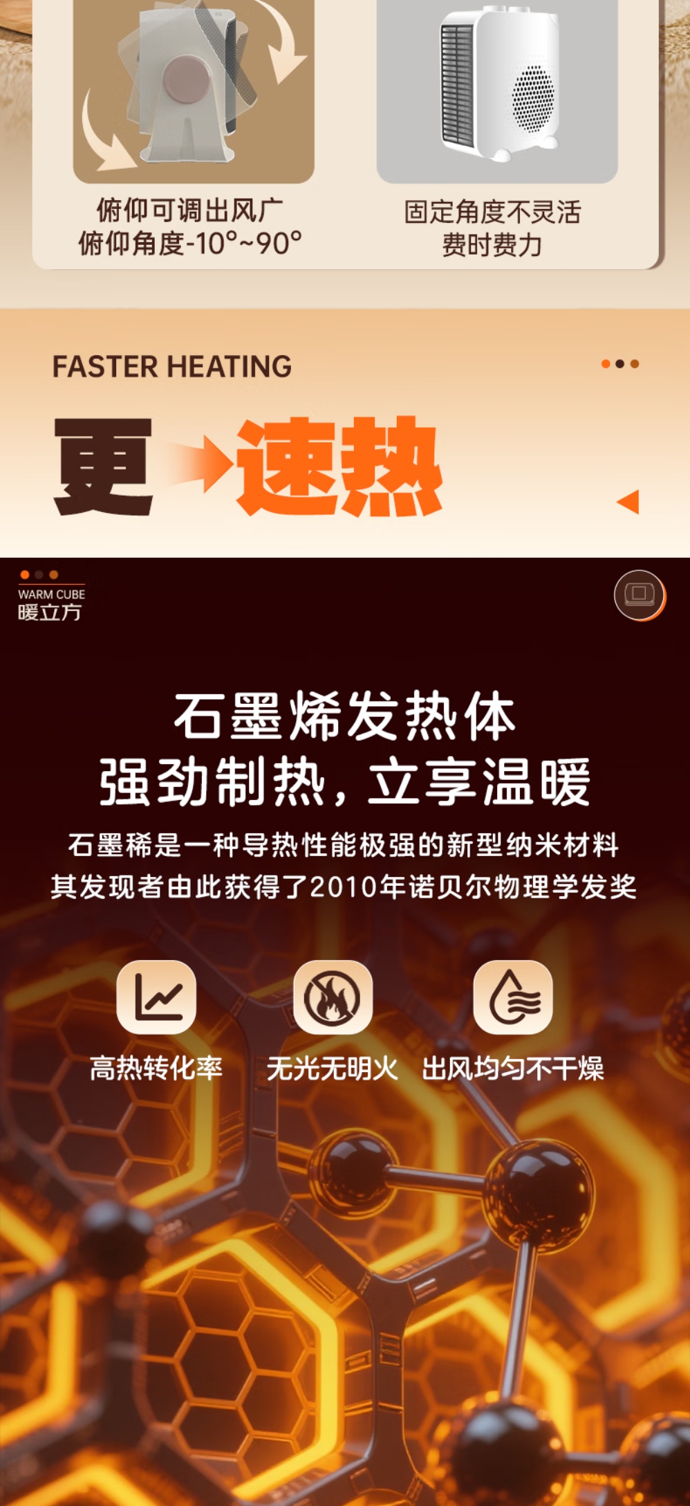 石墨烯PTC发热体,3s速热,高效热,无异味;小巧机身不占地,哪里冷,暖哪里;直流电机出风远,低噪音不打扰;俯仰可调出风广,向上70度,向下10度;整机阻燃材质,多重安全保护