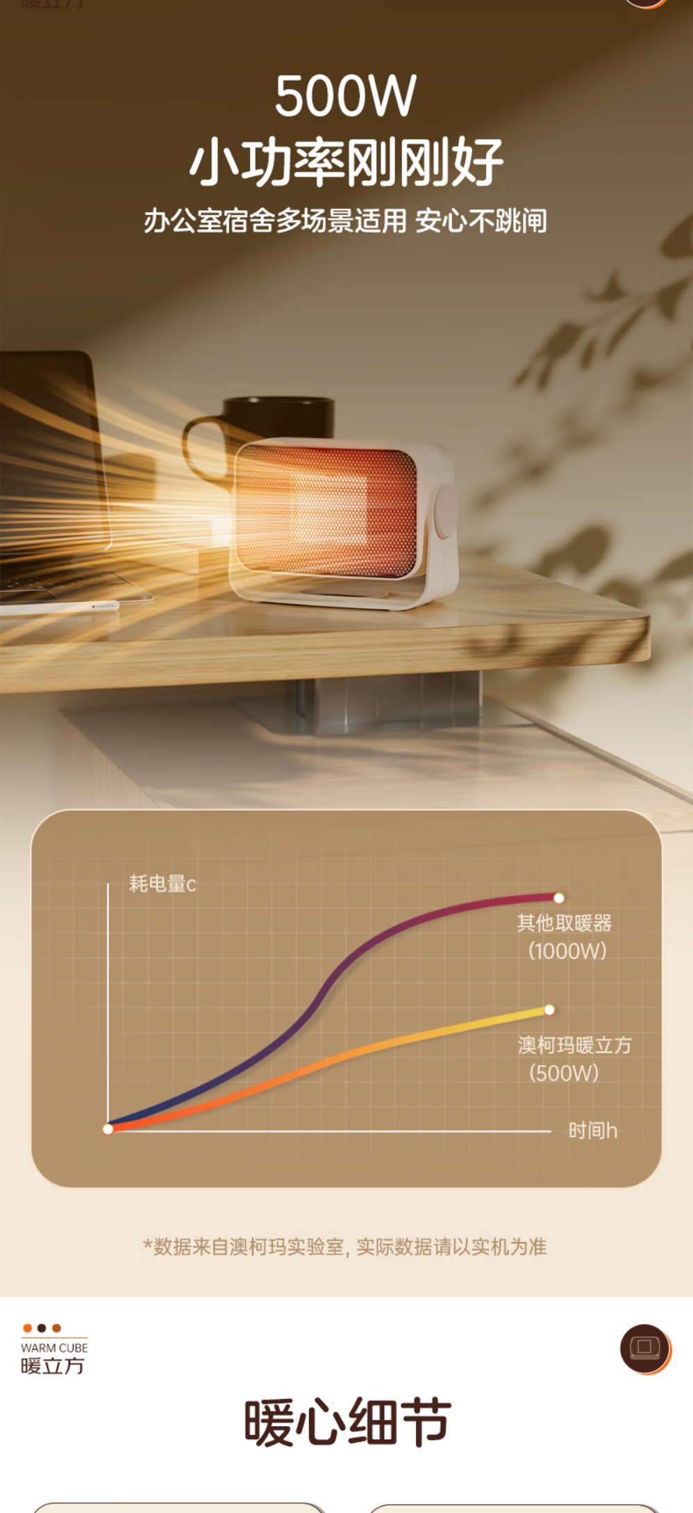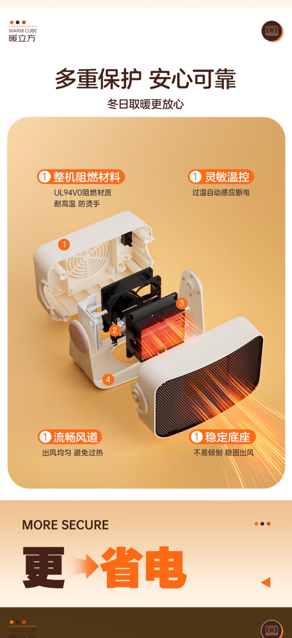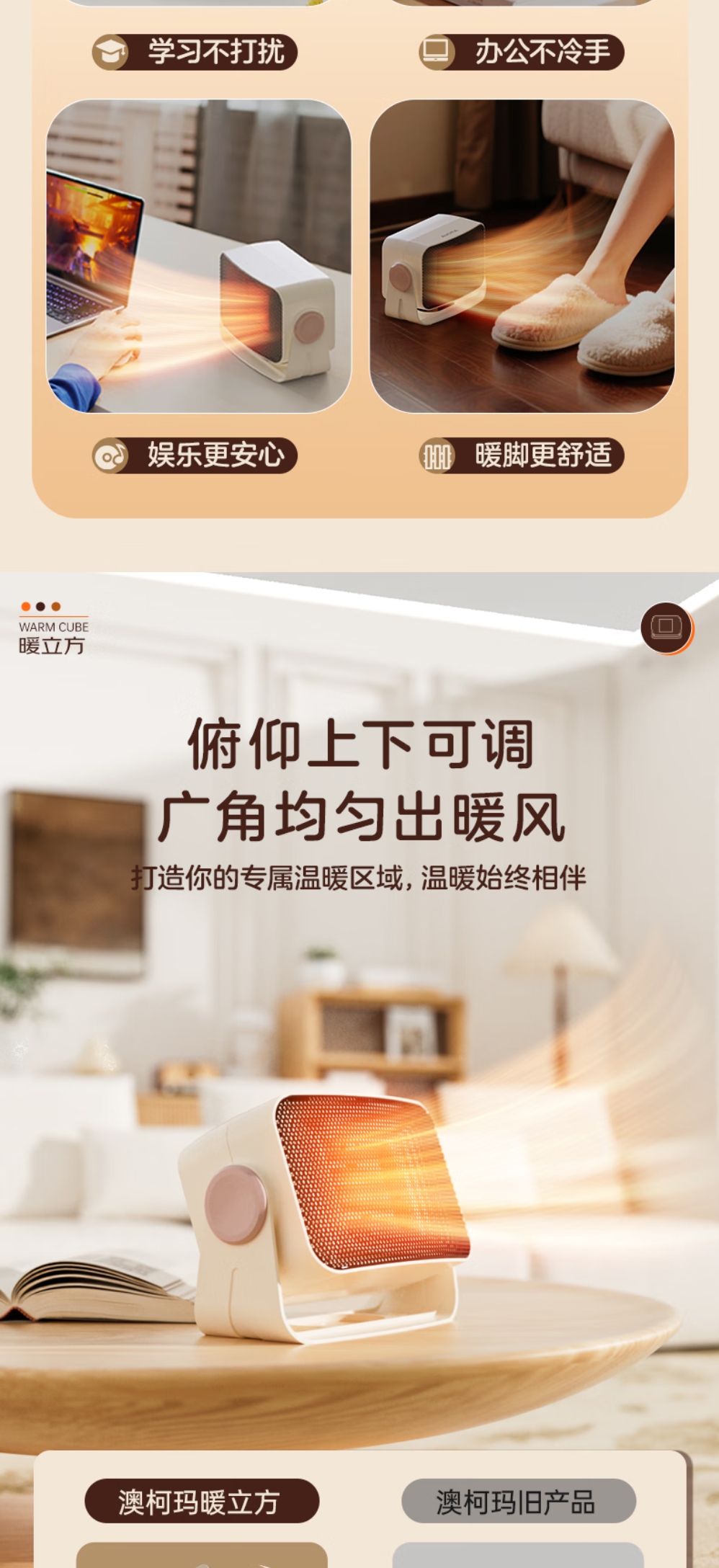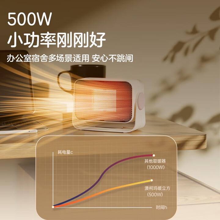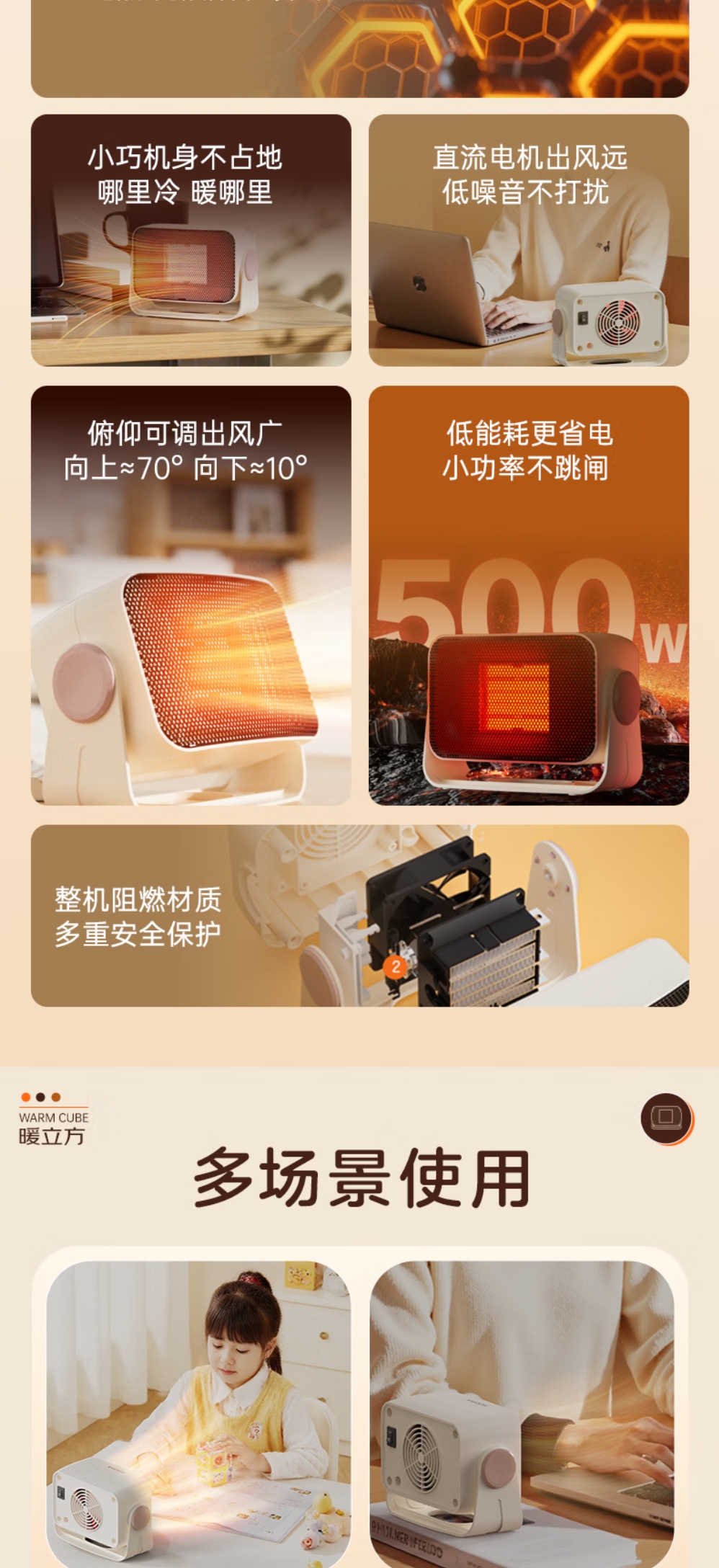 石墨烯PTC发热体,3s速热,高效热,无异味;小巧机身不占地,哪里冷,暖哪里;直流电机出风远,低噪音不打扰;俯仰可调出风广,向上70度,向下10度;整机阻燃材质,多重安全保护