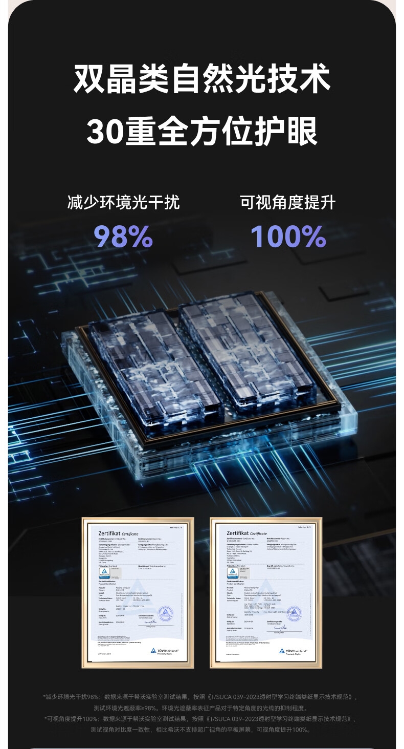 屏幕:15.6英寸,双晶柔光技术 30重护眼技术;镜头:1300万+200万+双摄像头;电池容量:10000mAh,6小时续航